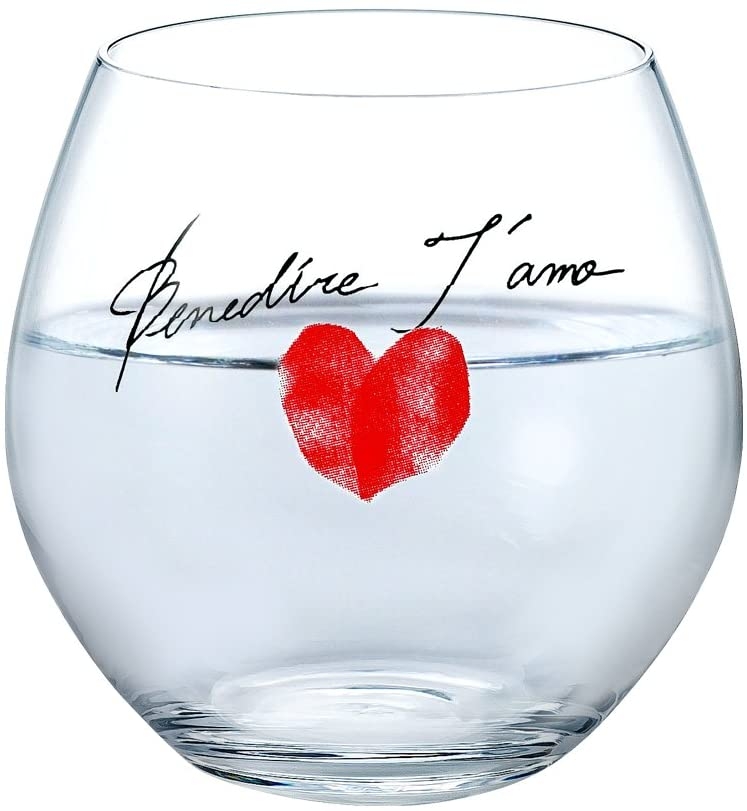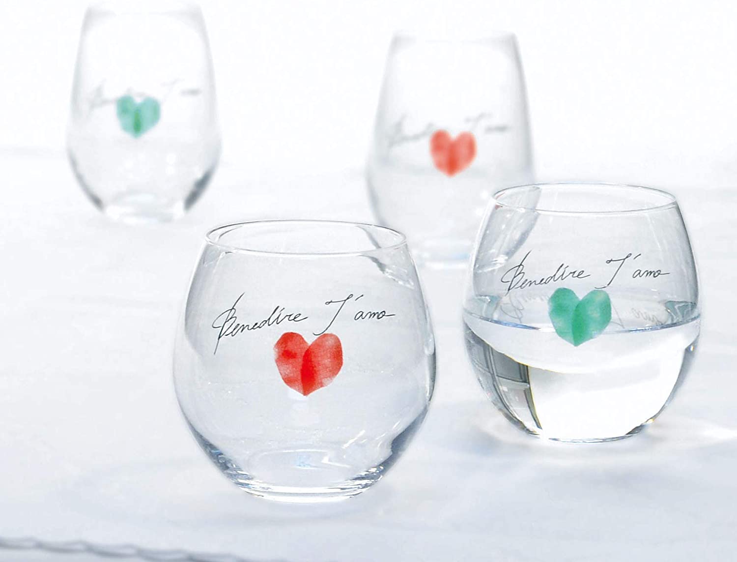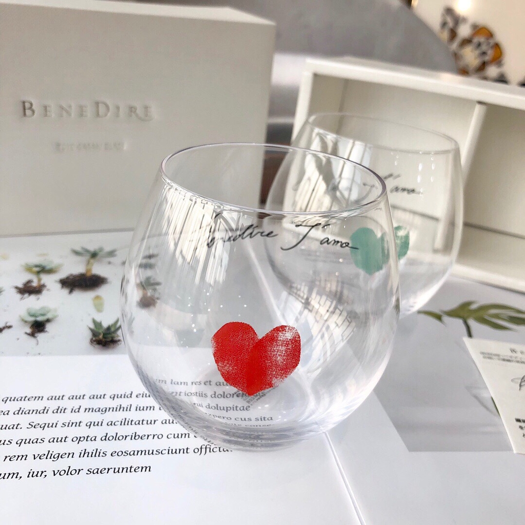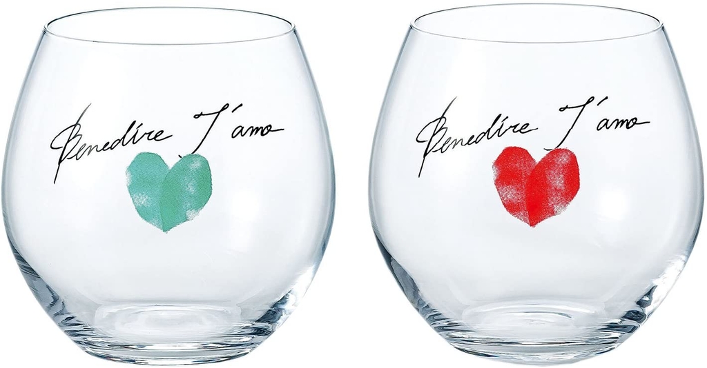Bộ 2 ly thủy tinh trong suốt in hình trái tim và dòng chữ Benedire T'amo ở 2 phía đối diện.