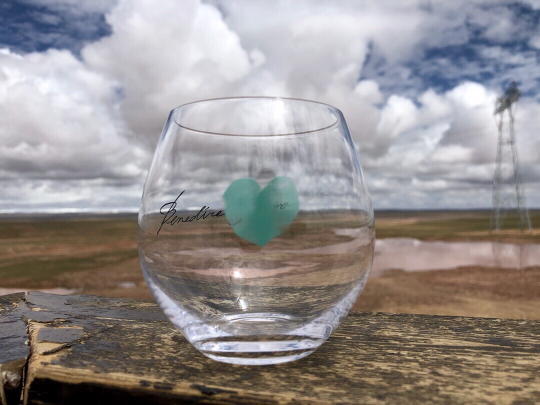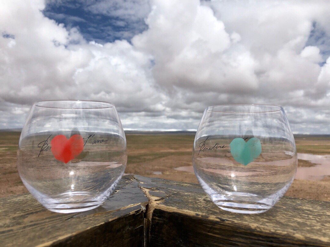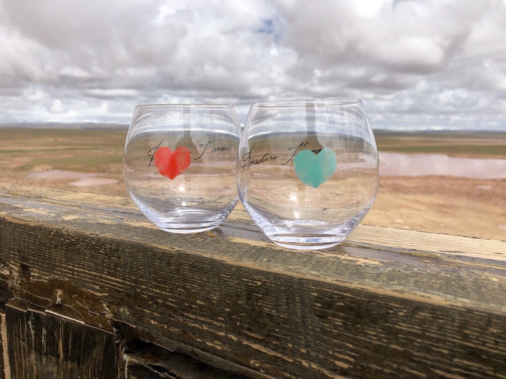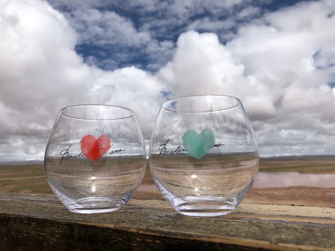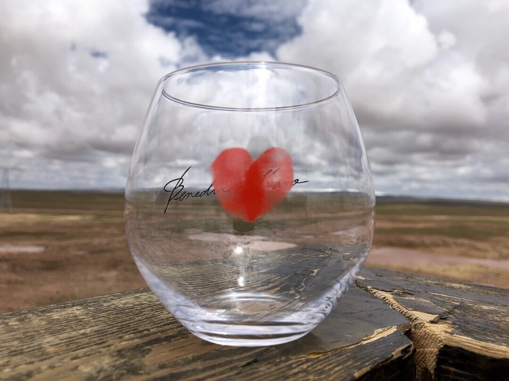 Bộ 2 ly thủy tinh trong suốt in hình trái tim và dòng chữ Benedire T'amo ở 2 phía đối diện.