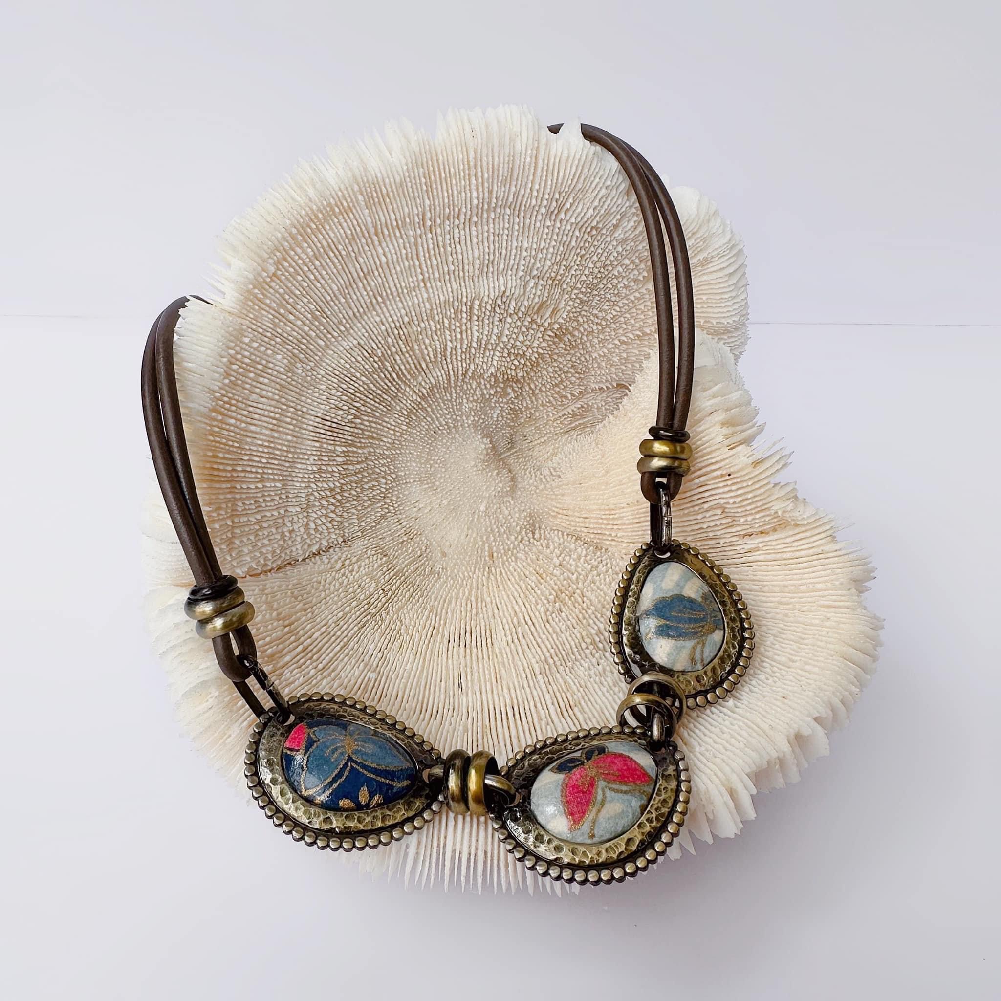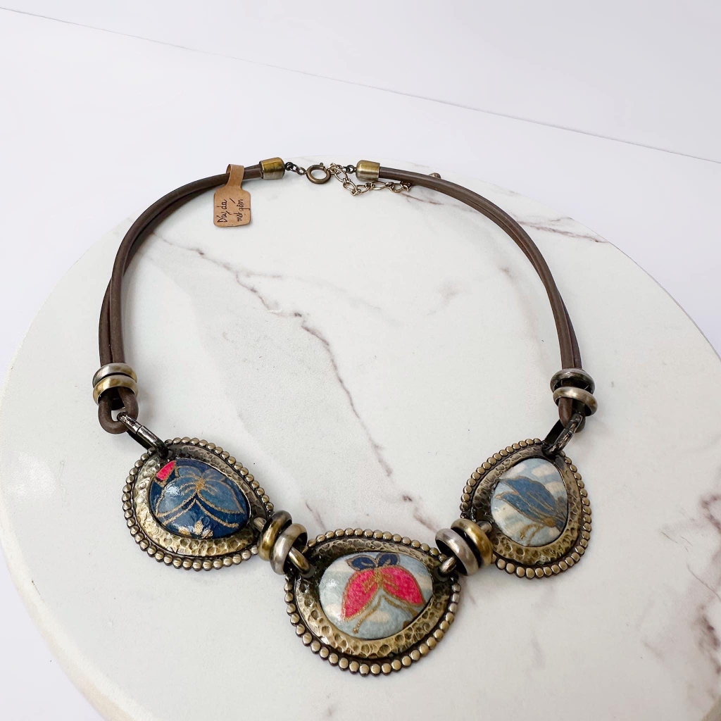 Vòng cổ dây da, 3 mặt kim loại khảm gốm vẽ hình cánh bướm.