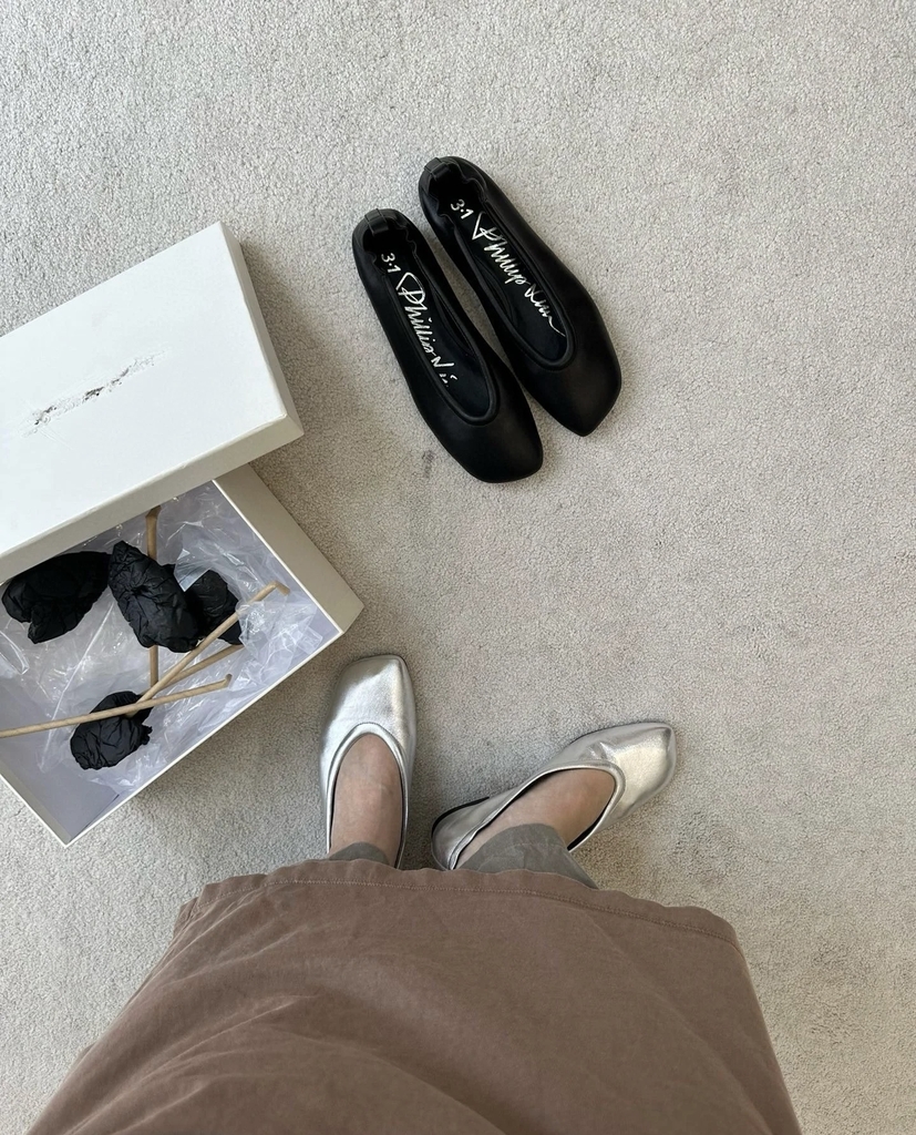 3.1 Phil*lip L*im ID Stretch là kiểu giày ballet đế bệt, được làm từ da Nappa mềm mại tạo sự thoải mái và nhẹ chân khi mang hằng ngày. Gót thun nhún ôm chân, có quai để bạn có thể xỏ thêm dây hay ruy băng. Giày mũi vuông vát xéo hiện đại cùng thiết kế trơn tối giản dễ dàng kết hợp với nhiều trang phục.