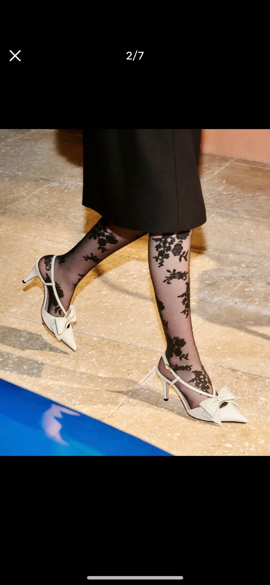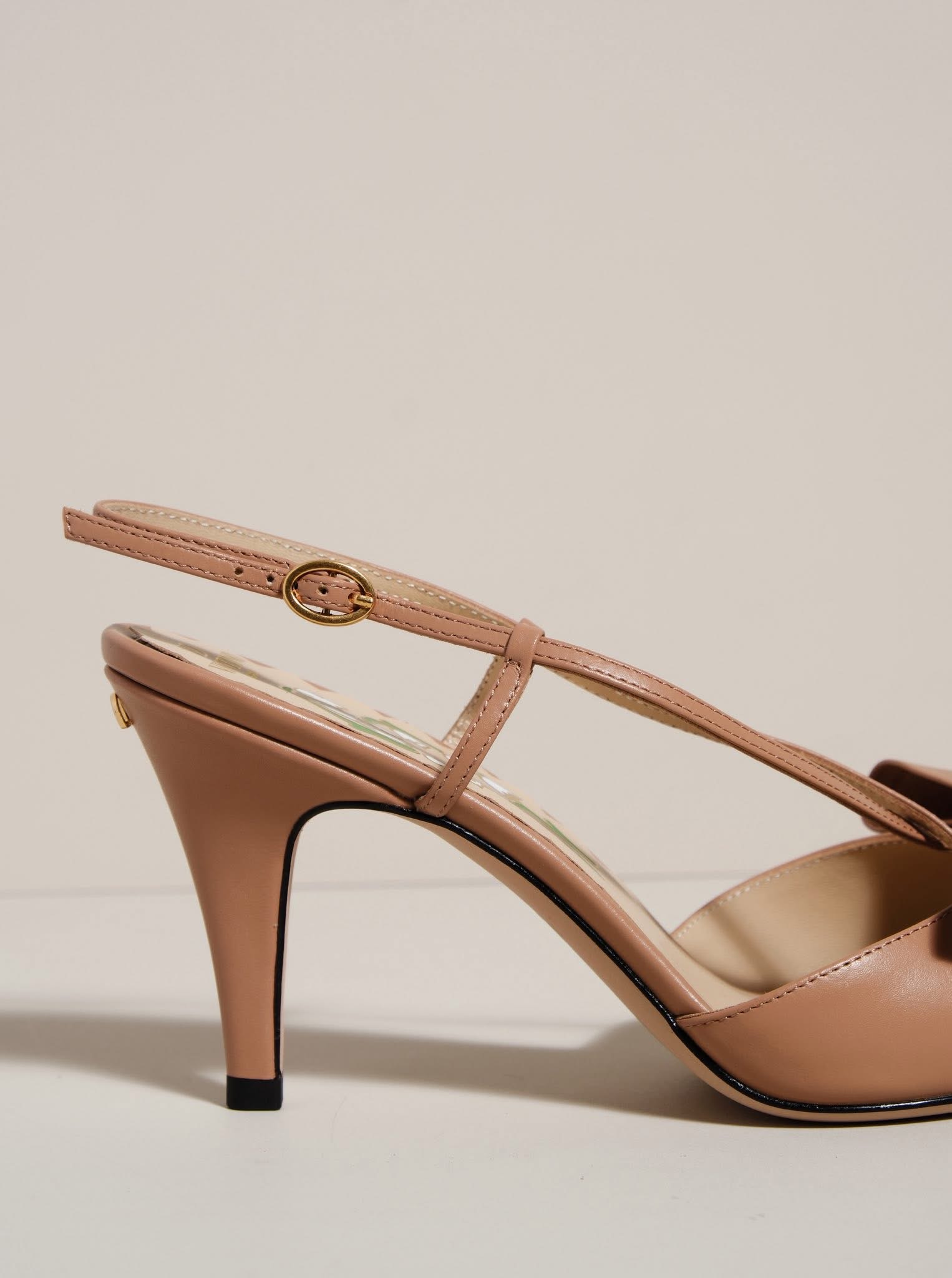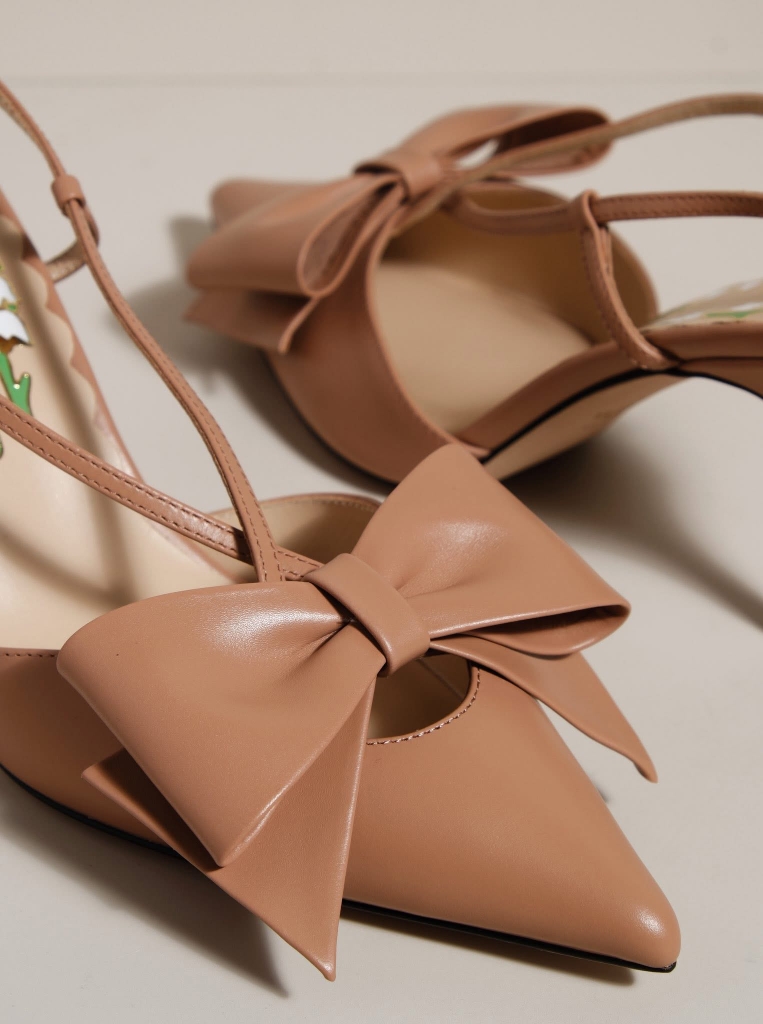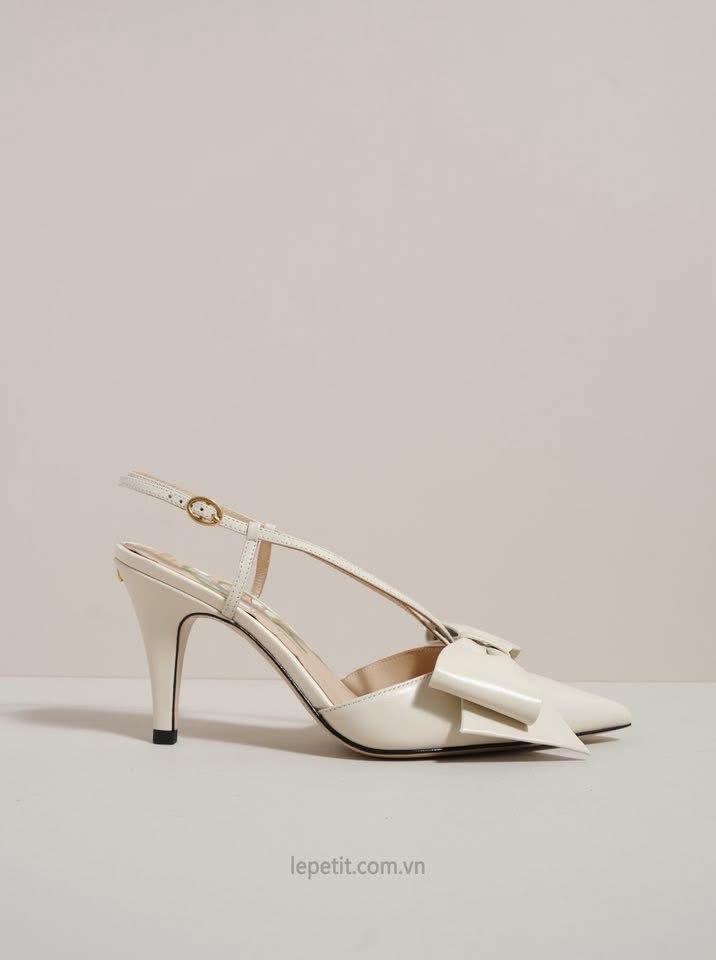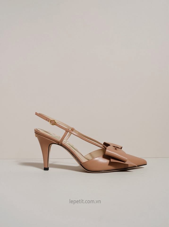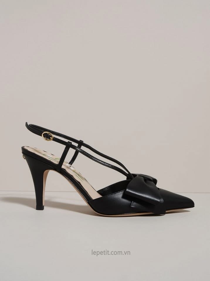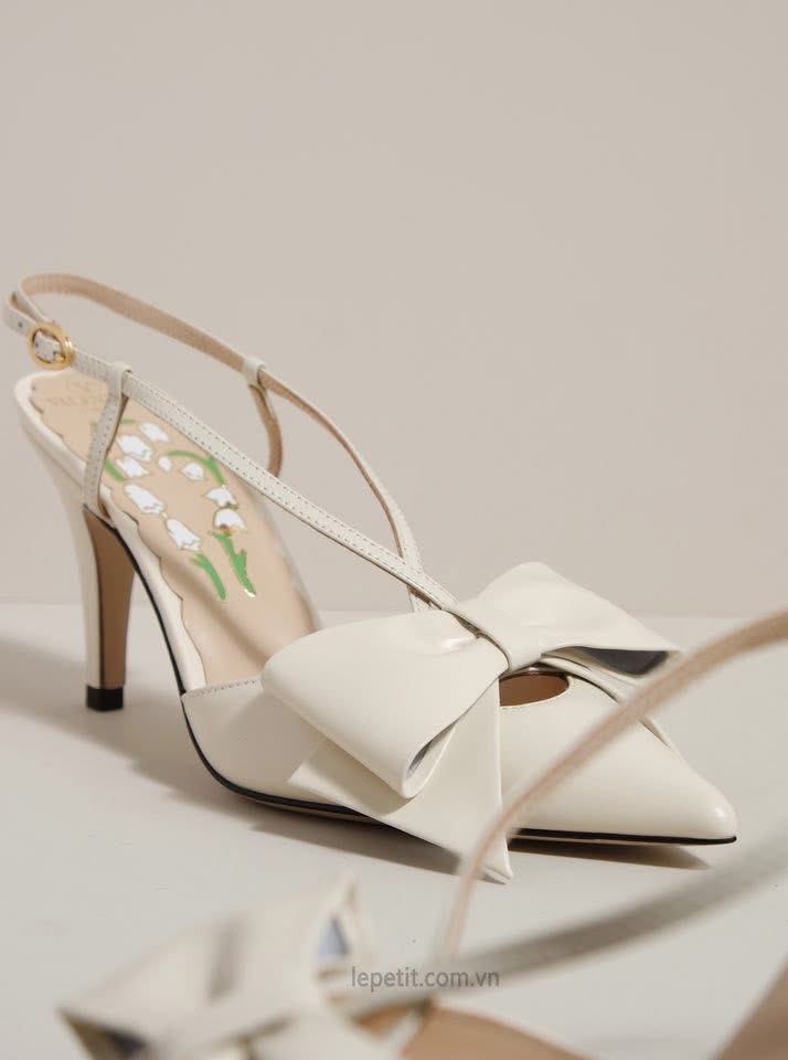 Chi tiết nơ to bản ở mũi giày trở thành điểm nhấn đặc trưng, tôn lên sự ngọt ngào và mềm mại trong từng bước chân. Lót giày in họa tiết hoa linh lan, form mũi nhọn & gót nhọn thanh thoát cùng quai slingback mảnh tạo nên tổng thể cân bằng giữa sang trọng và nữ tính.