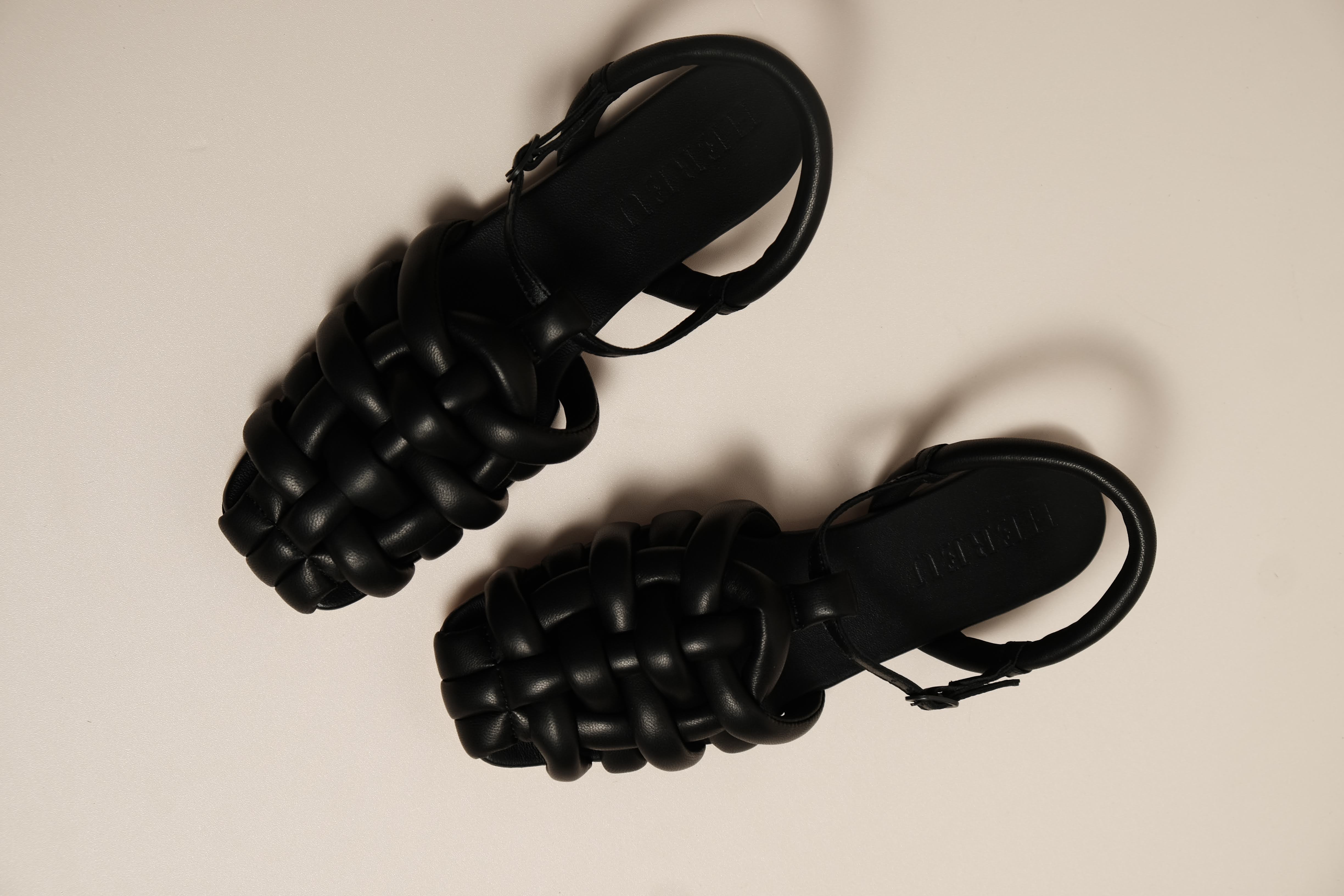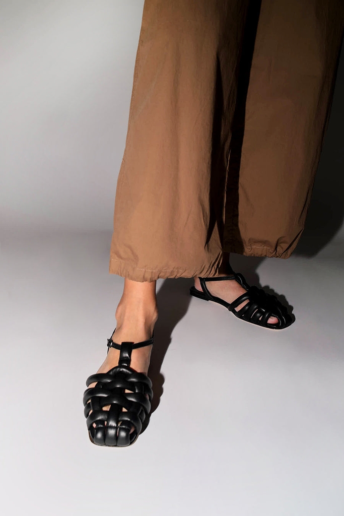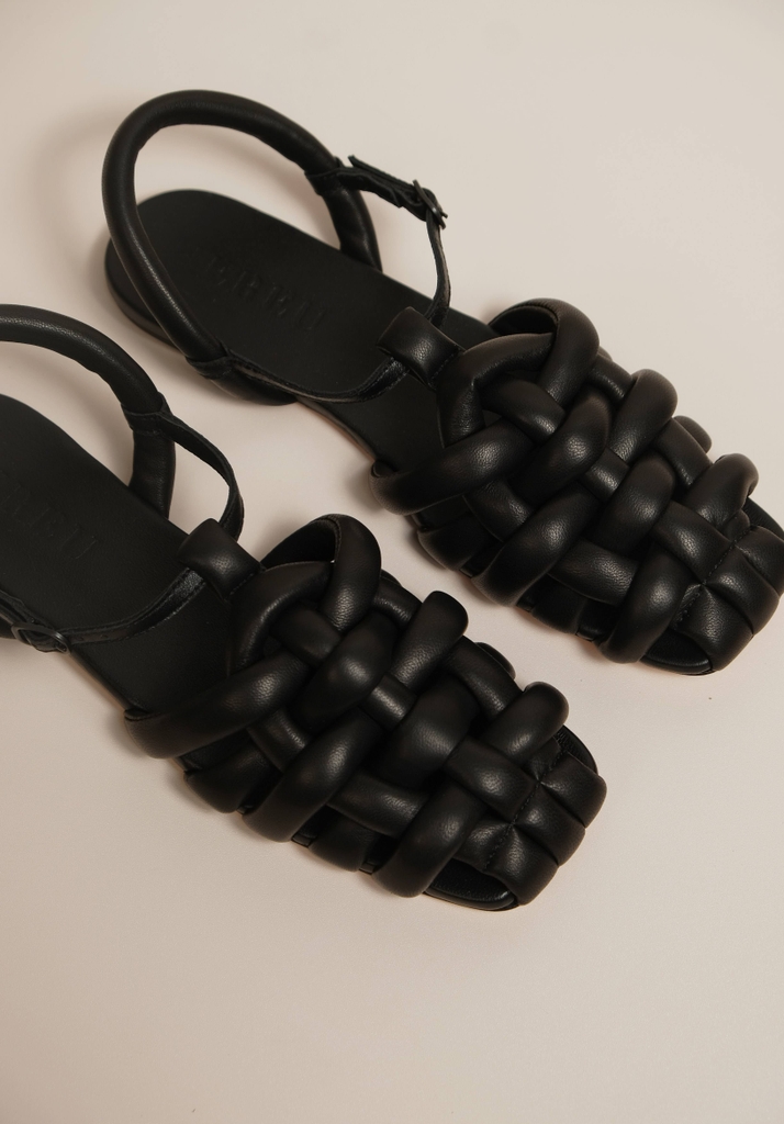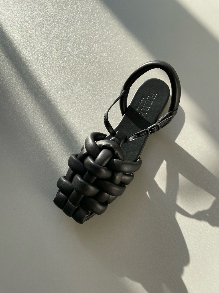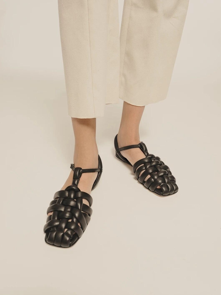 Giày sở hữu đế bằng, mũi vuông, quai đệm tròn đan woven thủ công mang đến sự êm ái và thoải mái cho người mang. Đế giày cũng được làm từ da thật.