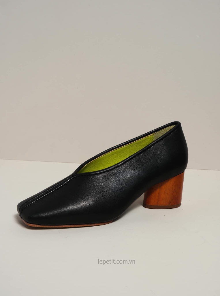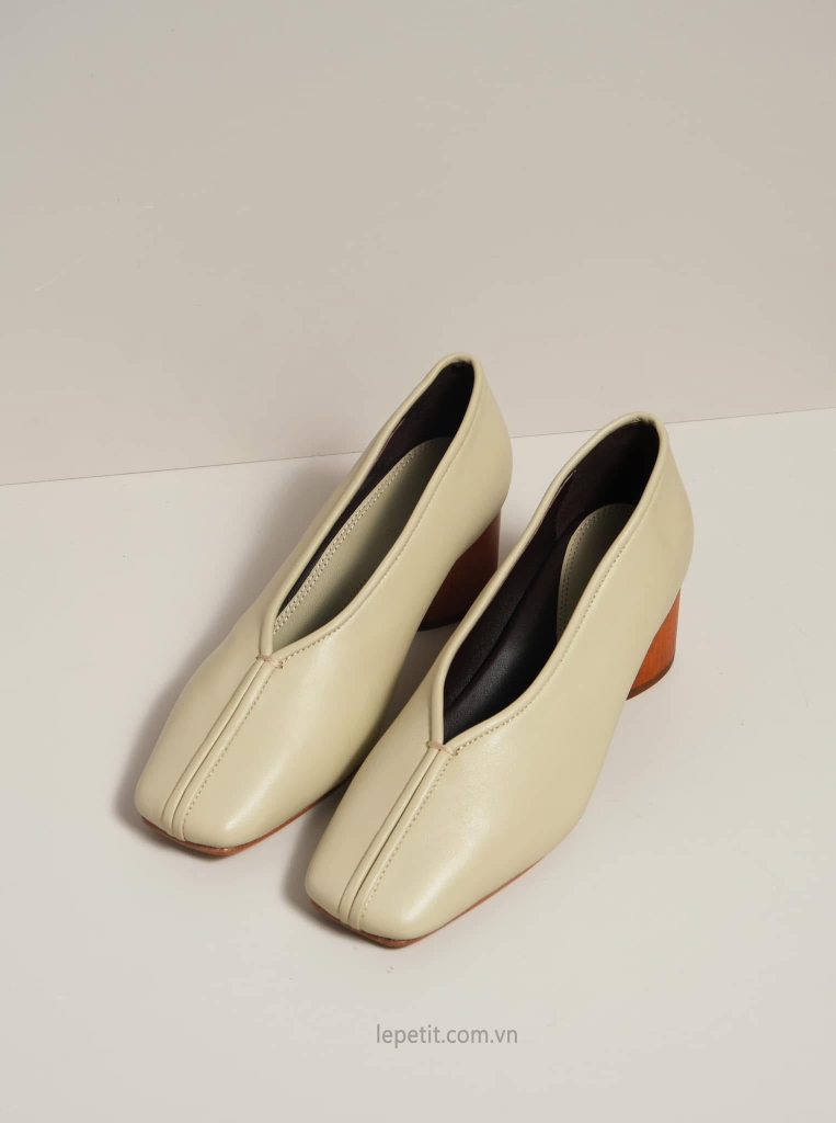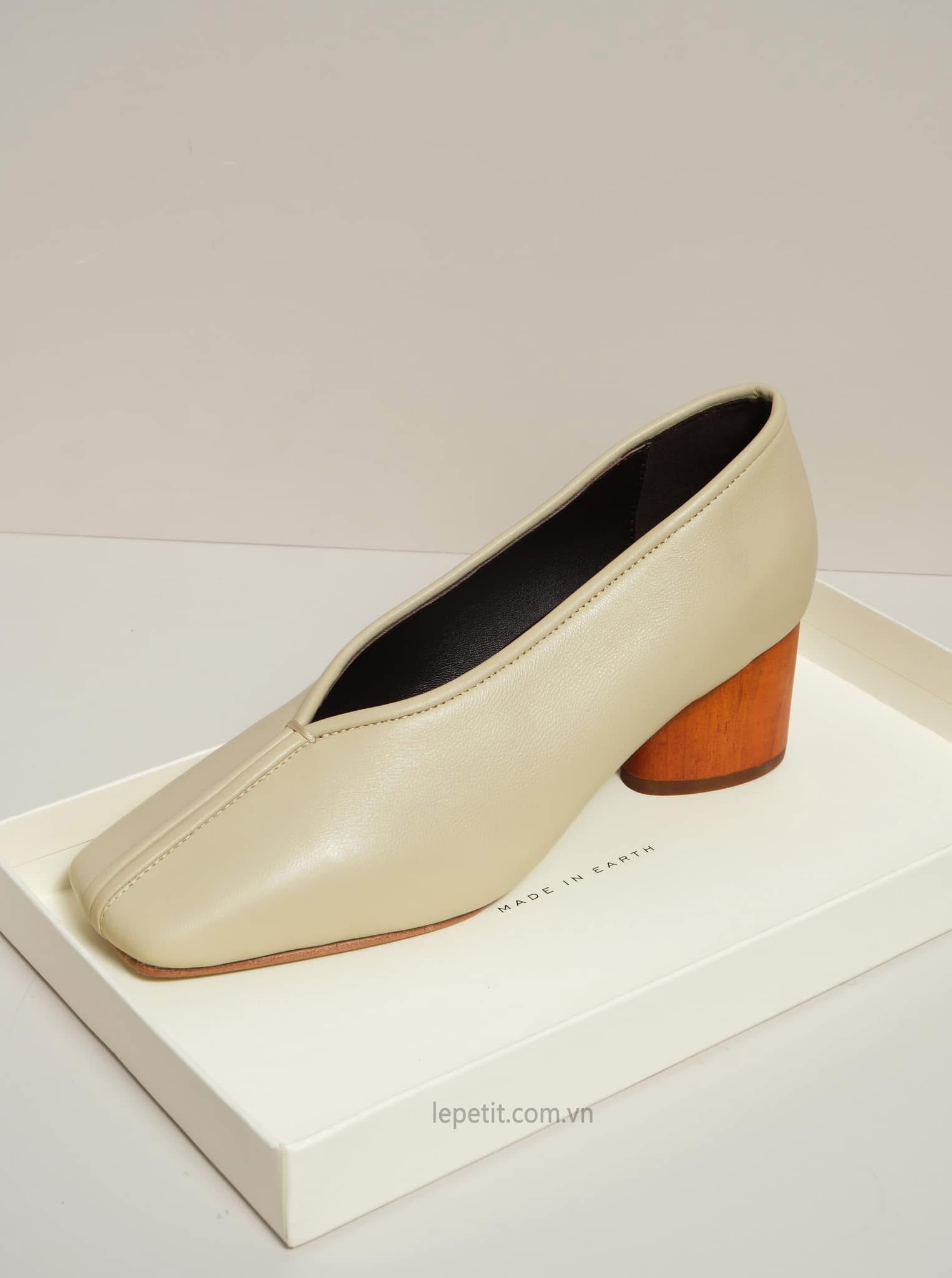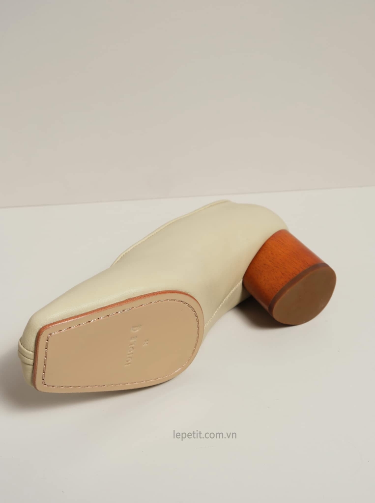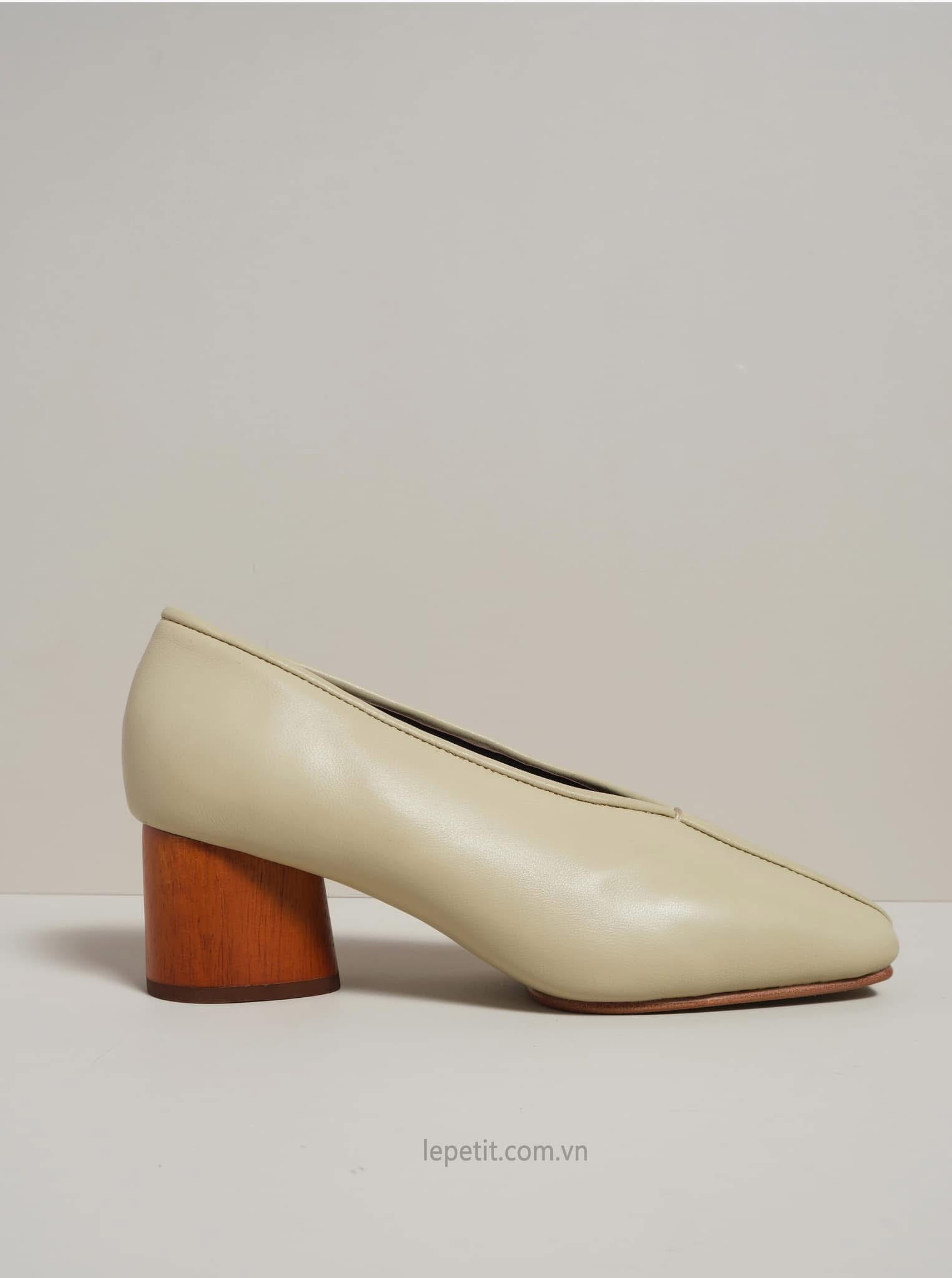 Giày gót gỗ trụ, da thật toàn bộ mang đến sự êm ái và thoải mái khi mang hằng ngày.