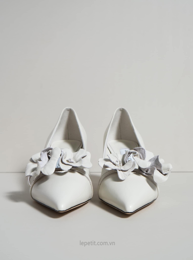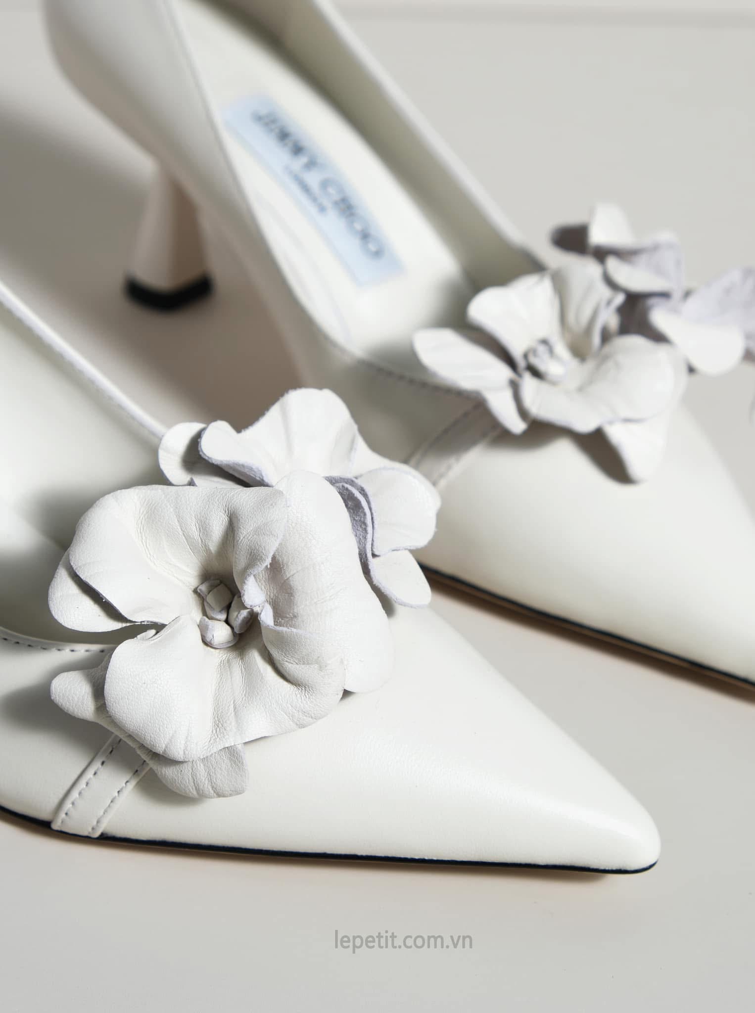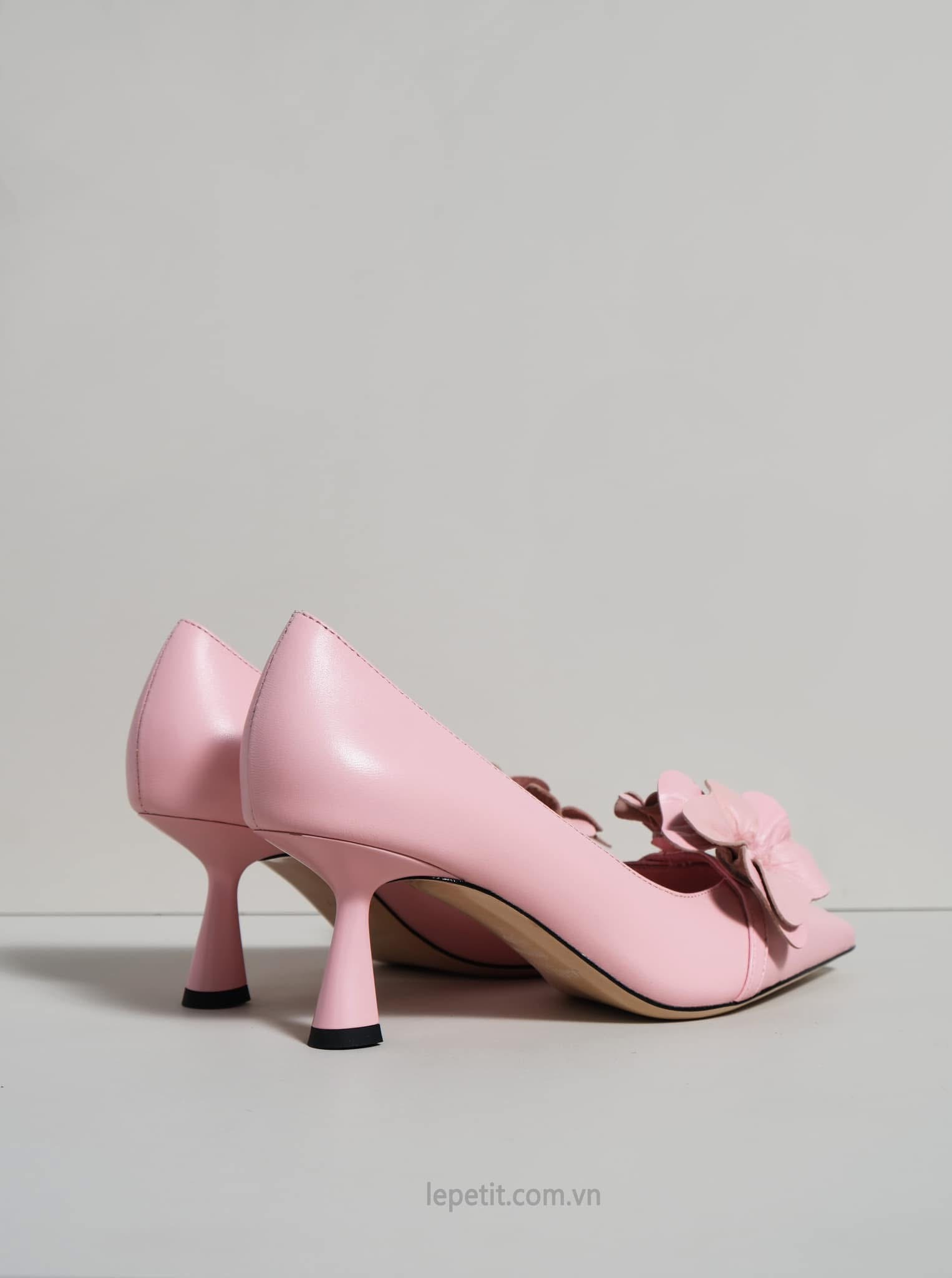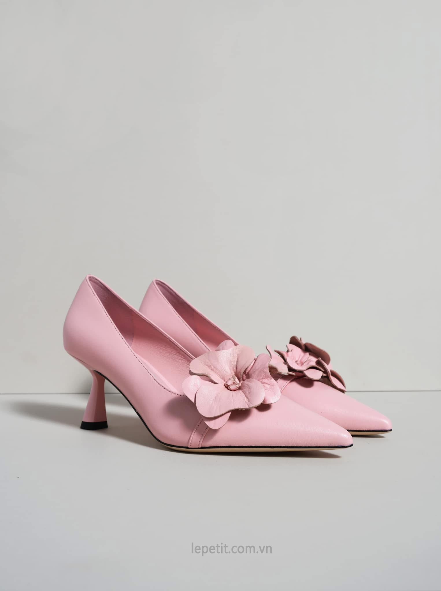 Giày cao gót mũi nhọn quai hậu, đính hoa bằng da thủ công tạo nên phong cách nữ tính, duyên dáng.