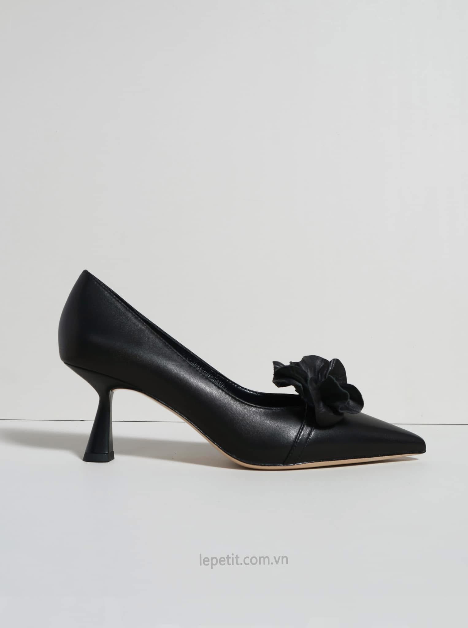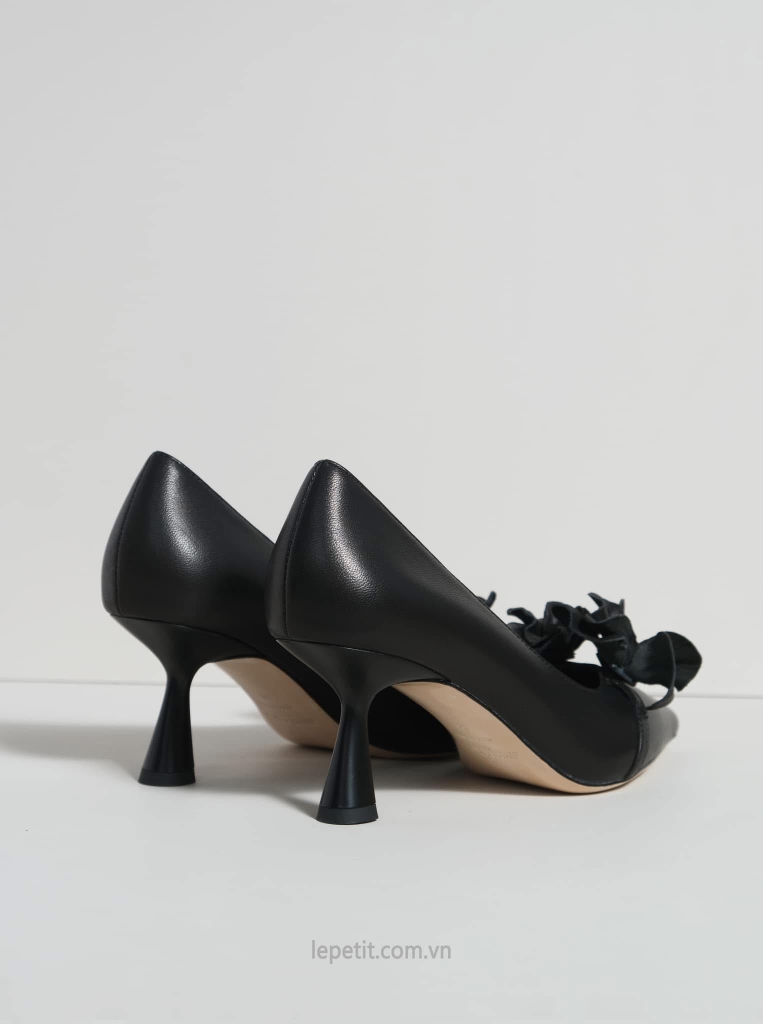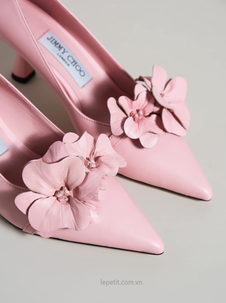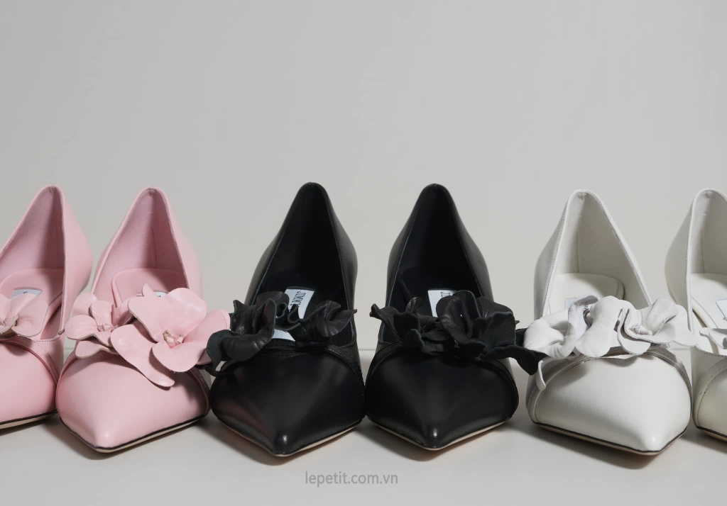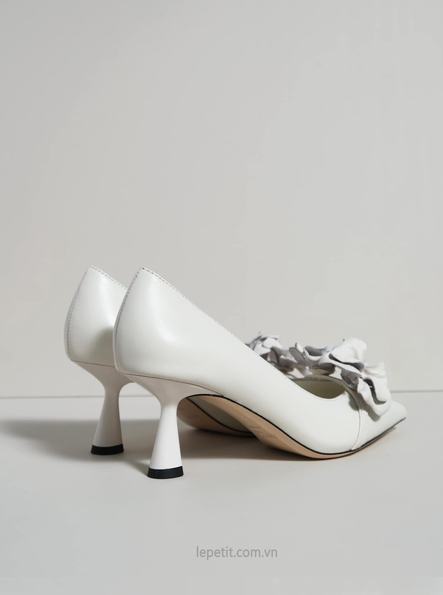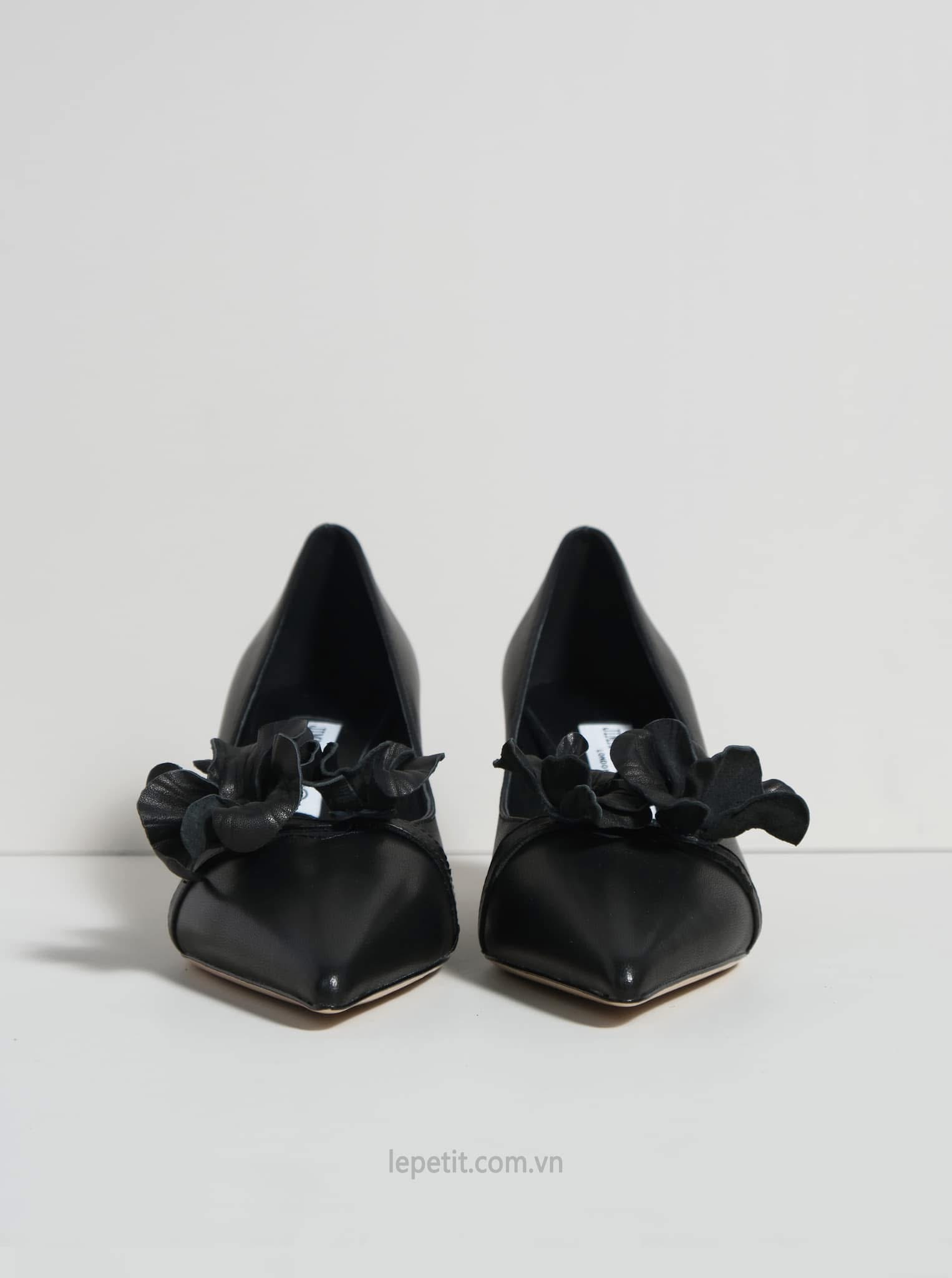Giày cao gót mũi nhọn quai hậu, đính hoa bằng da thủ công tạo nên phong cách nữ tính, duyên dáng.