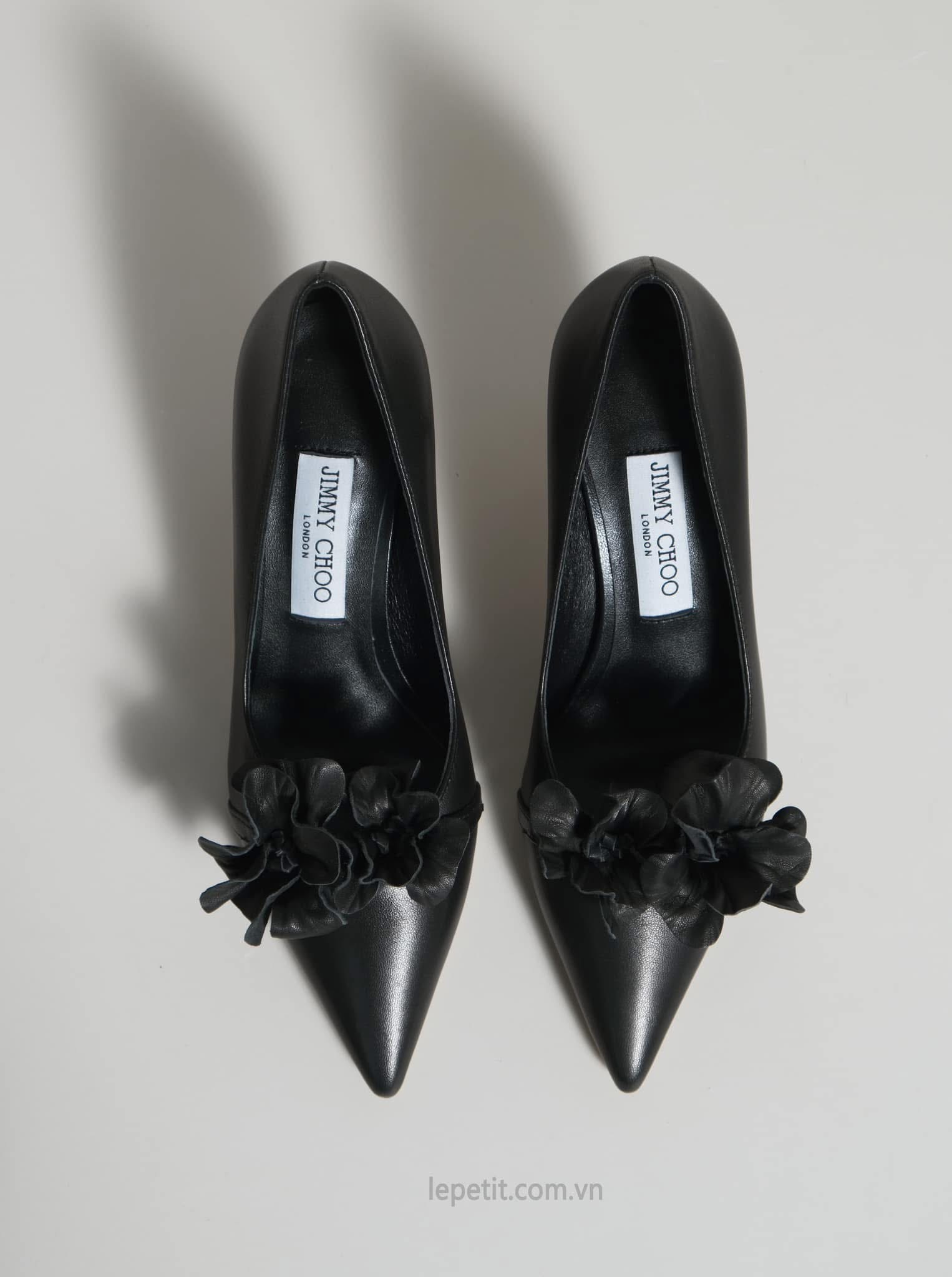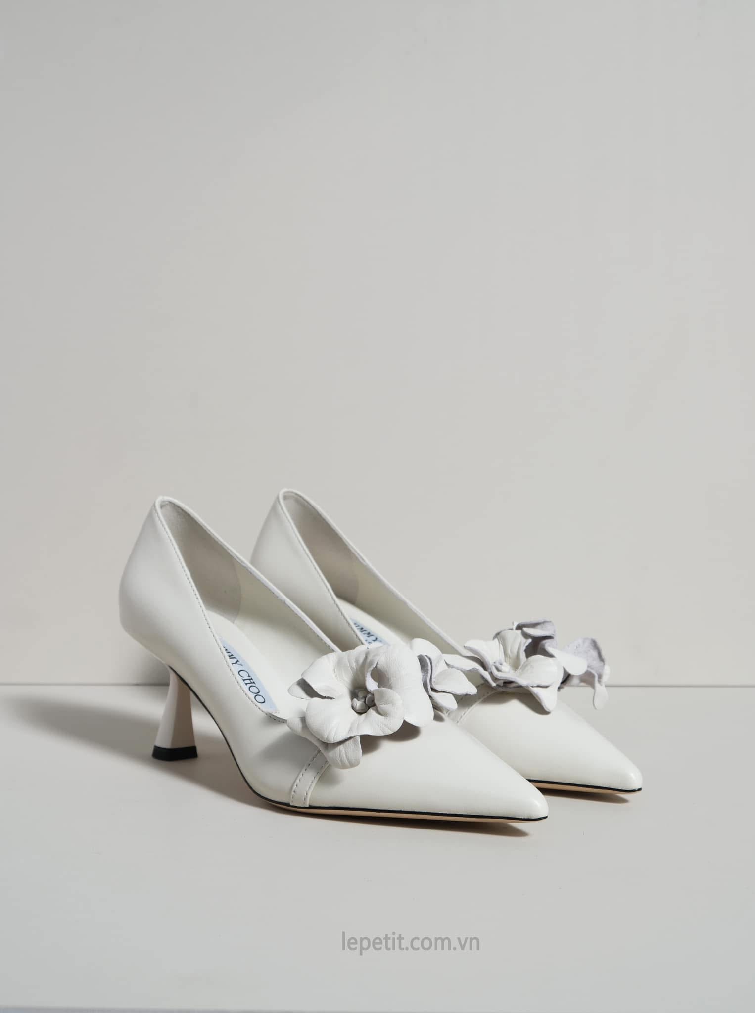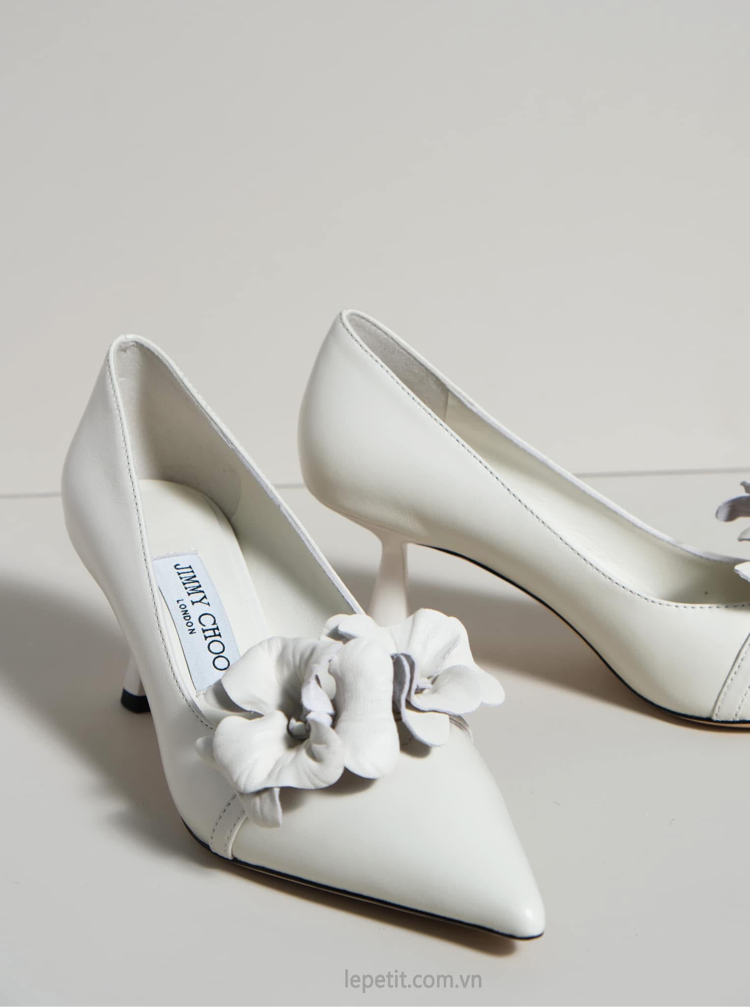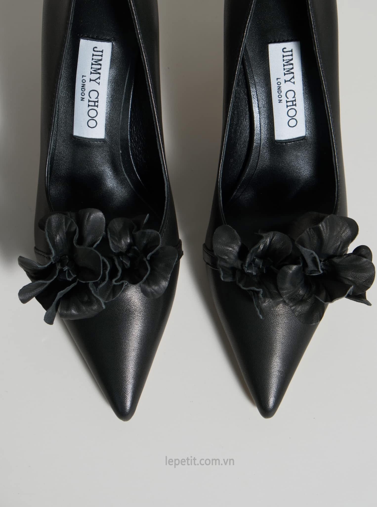 Giày cao gót mũi nhọn quai hậu, đính hoa bằng da thủ công tạo nên phong cách nữ tính, duyên dáng.