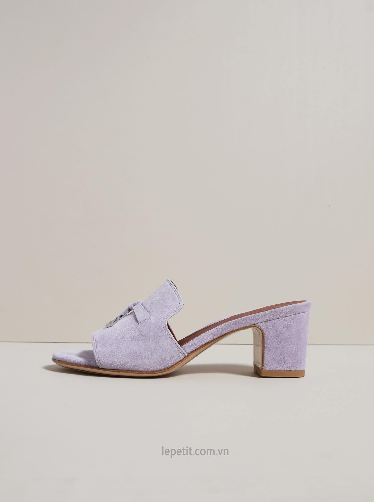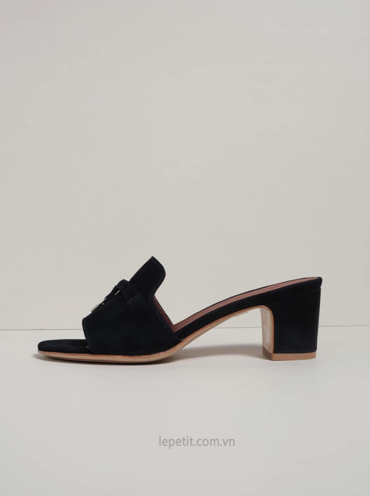 Giày là kiểu mule xỏ chân không quai gót vuông, hở mũi, quai đính charm kim loại màu bạc hình ổ khoá và logo thương hiệu.