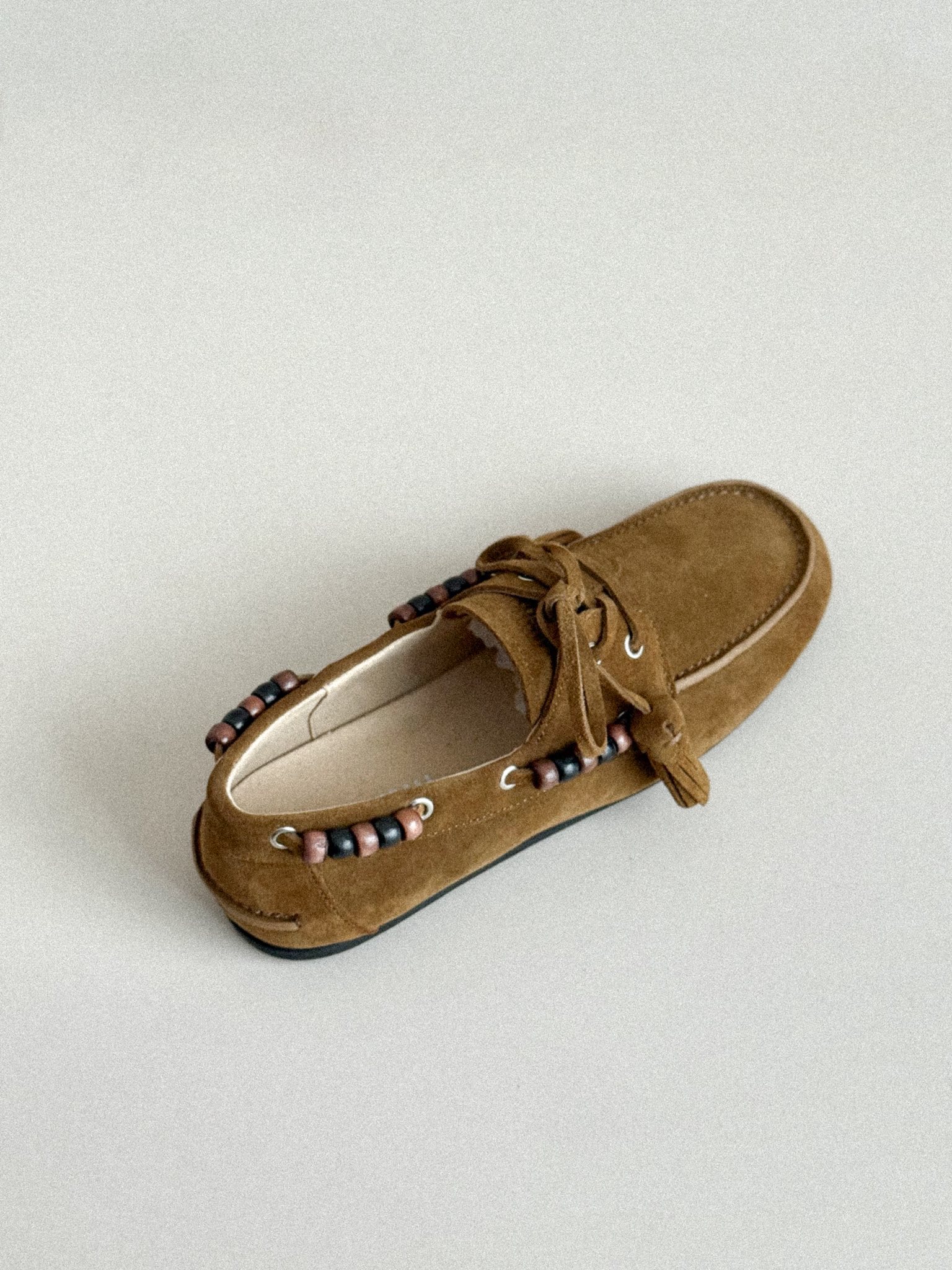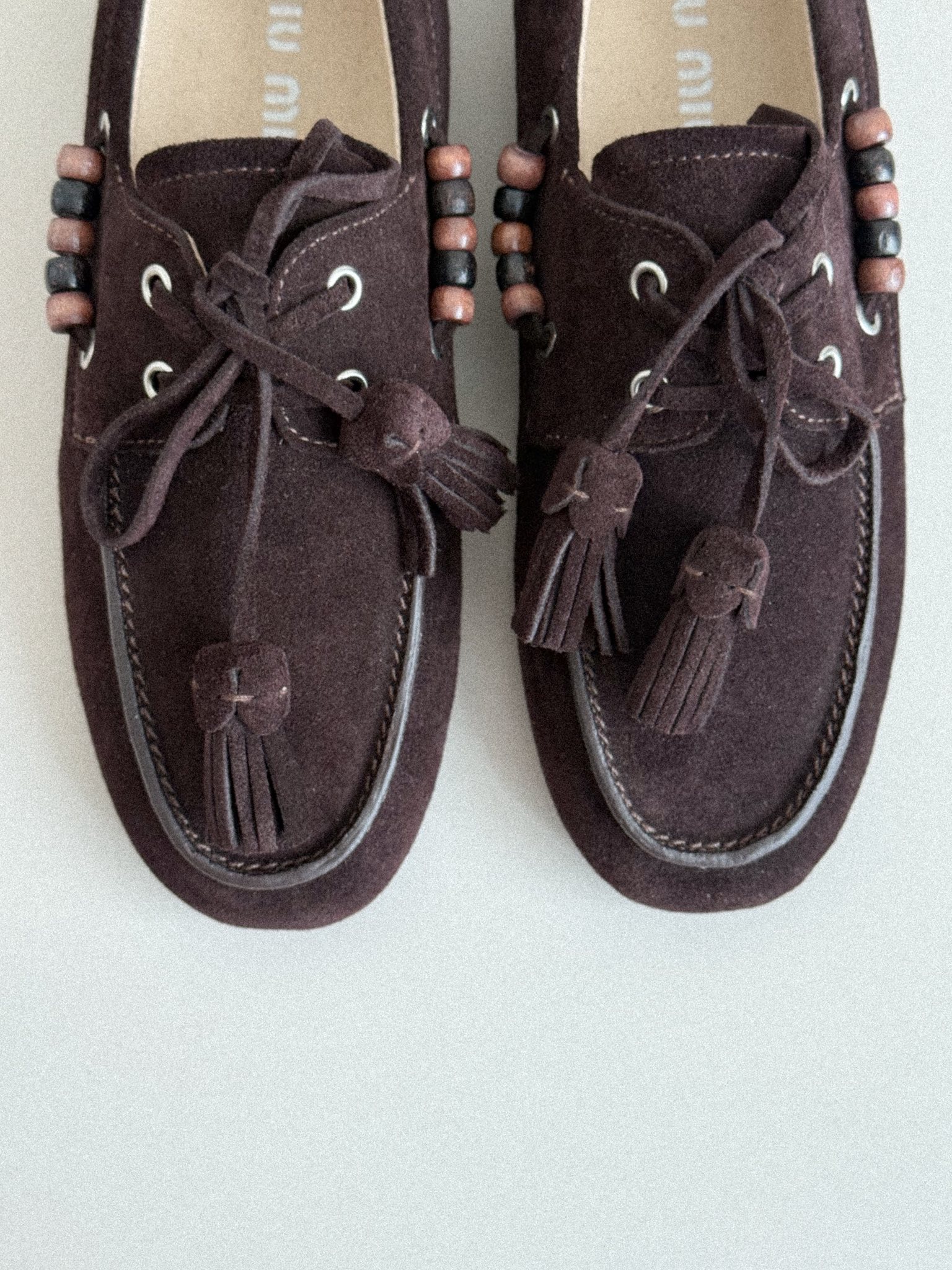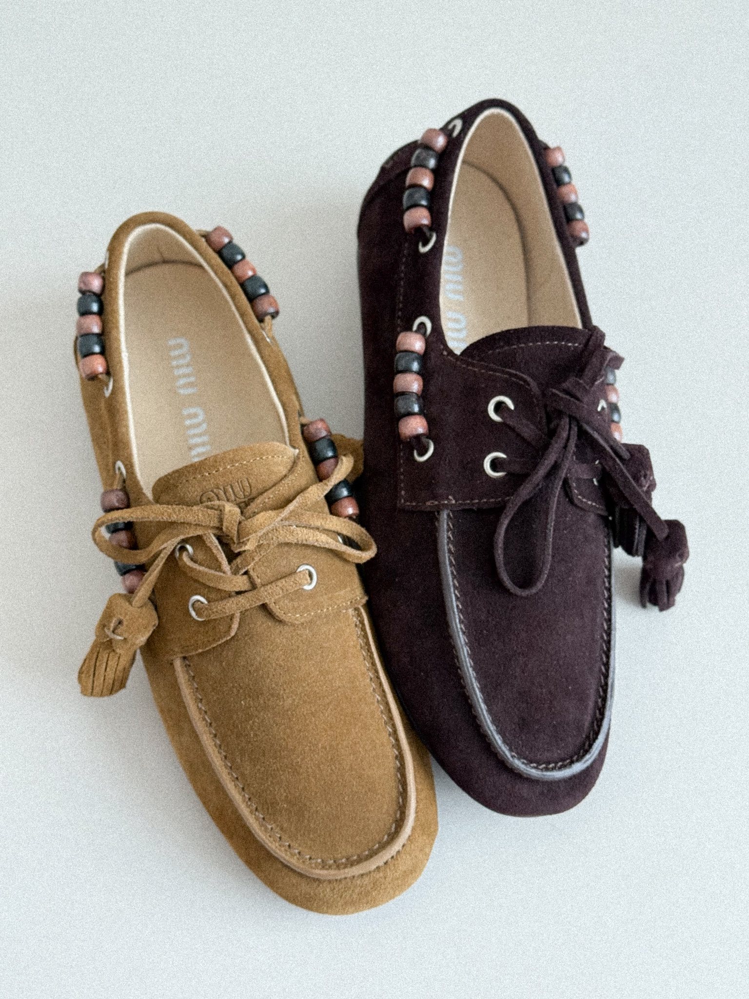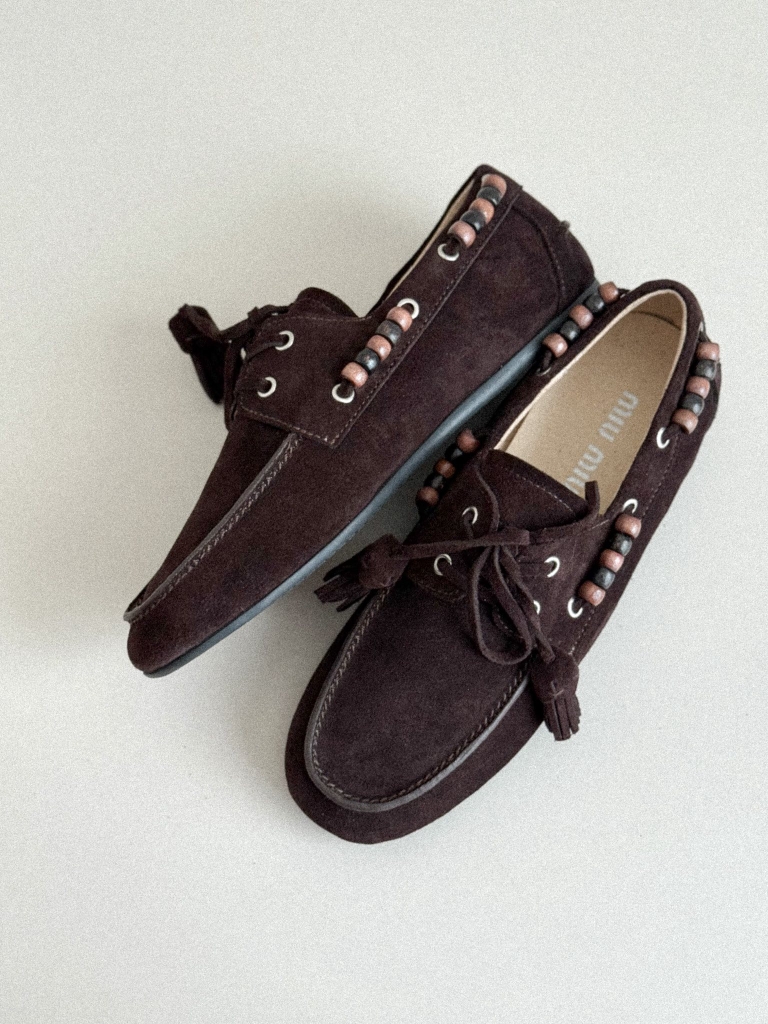 Một thiết kế vừa cổ điển vừa trẻ trung mang đậm phong cách preppy của MMiu: loafers da lộn êm ái, gam màu trầm ấm dành cho mùa thu đông, nhấn nhá bằng những chi tiết nhỏ xinh - dây buộc tua rua, hạt gỗ chạy dọc thân giày. Đi học, đi làm hay đi cafe đều hợp, một lựa chọn nhẹ nhàng cho những ngày thoải mái.