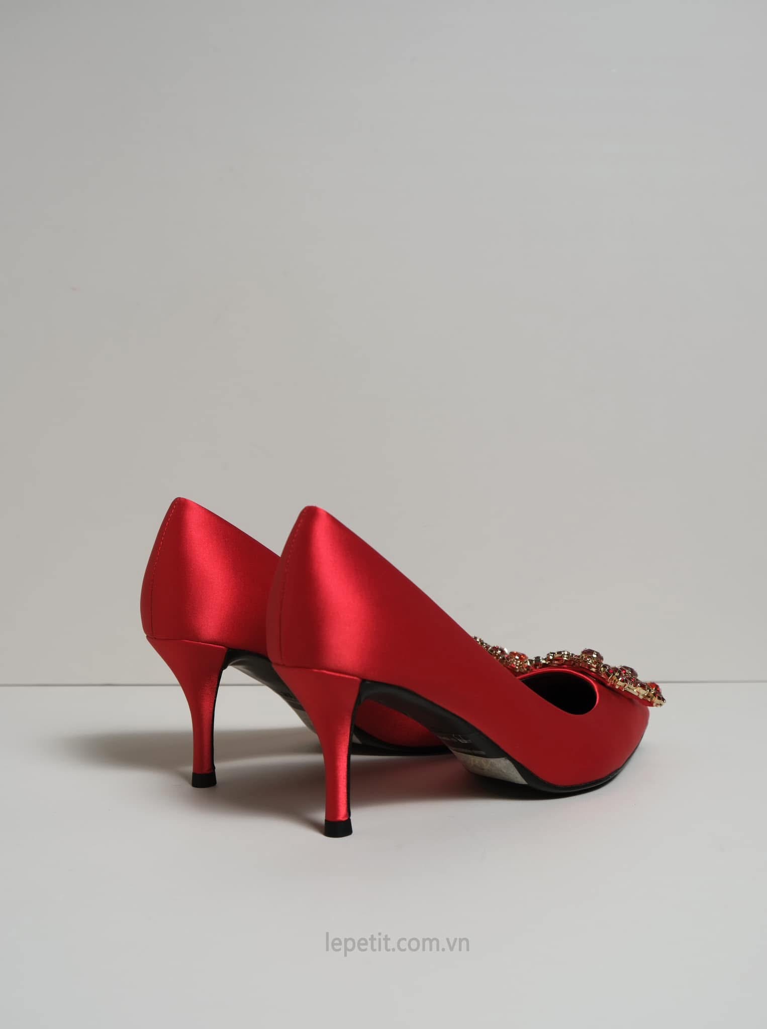 Efflorescence Pumps Satin là mẫu giày cao gót mảnh mũi nhọn, đính khoá cài hình chữ nhật trang trí pha lê tạo hiệu ứng nở hoa. Thân giày bọc satin, lót da thật & satin, đế da thật. Giày phù hợp mang lễ Tết, đi tiệc, mặc cùng váy đầm hay áo dài, đặc biệt là làm giày cưới.