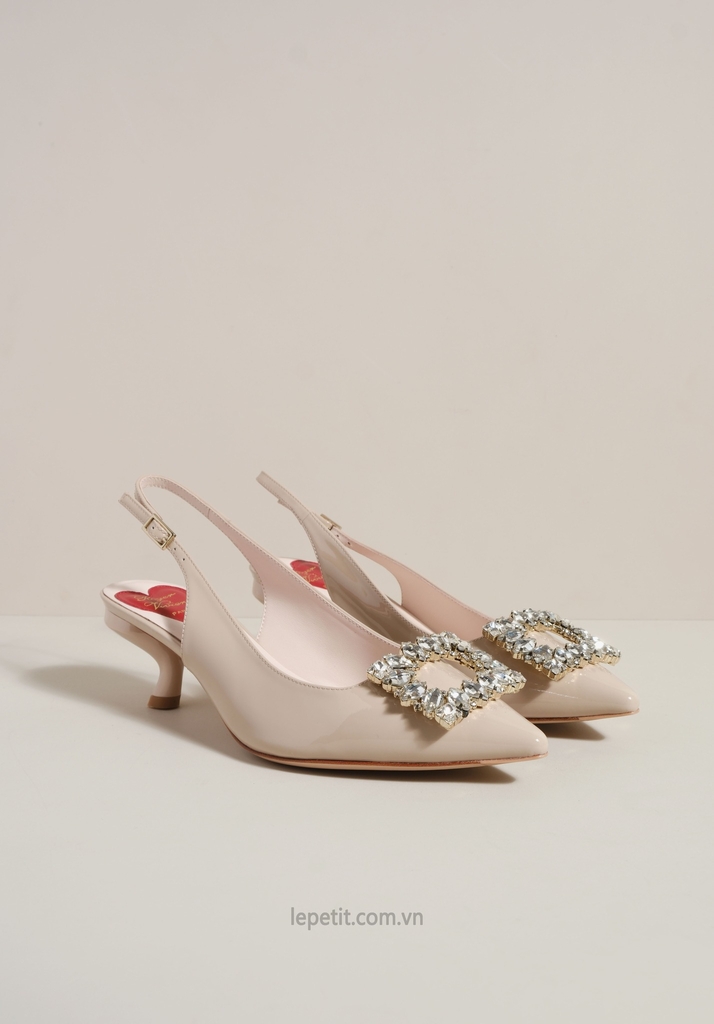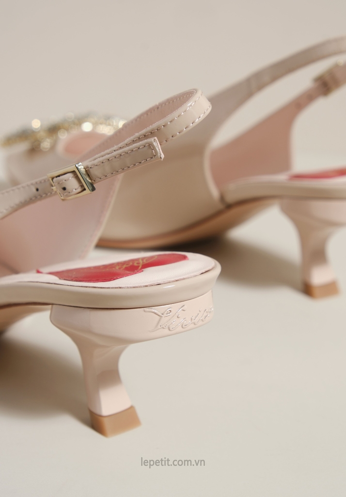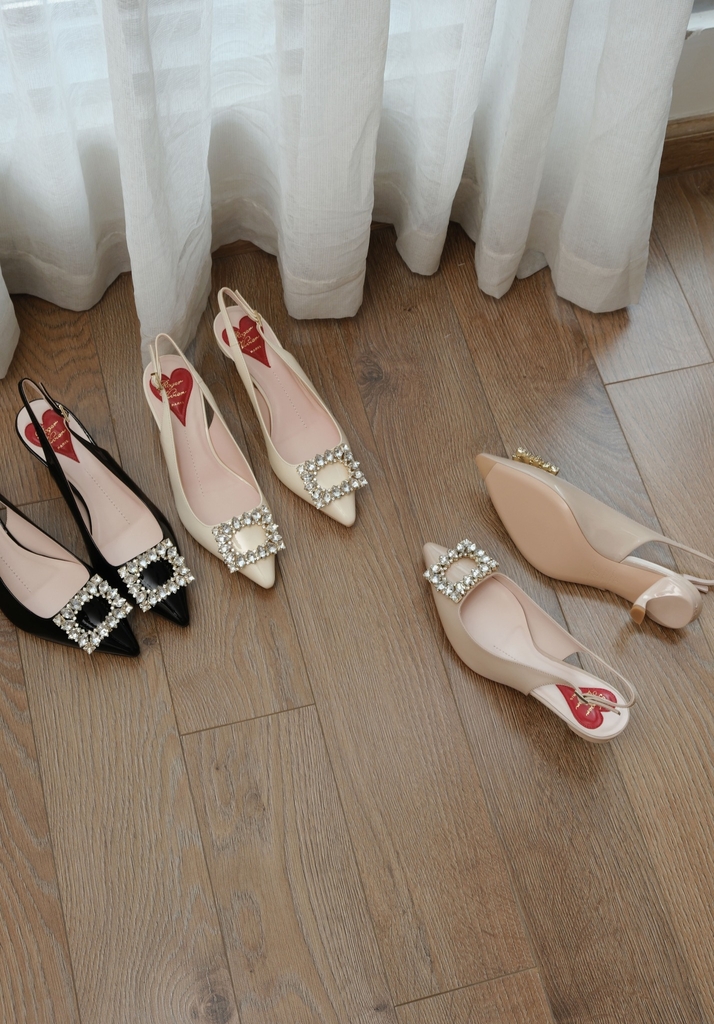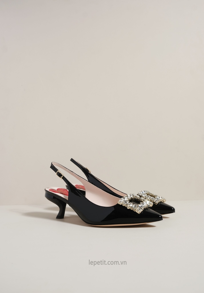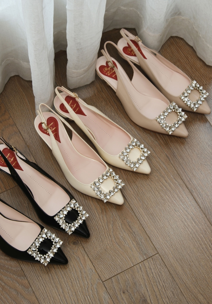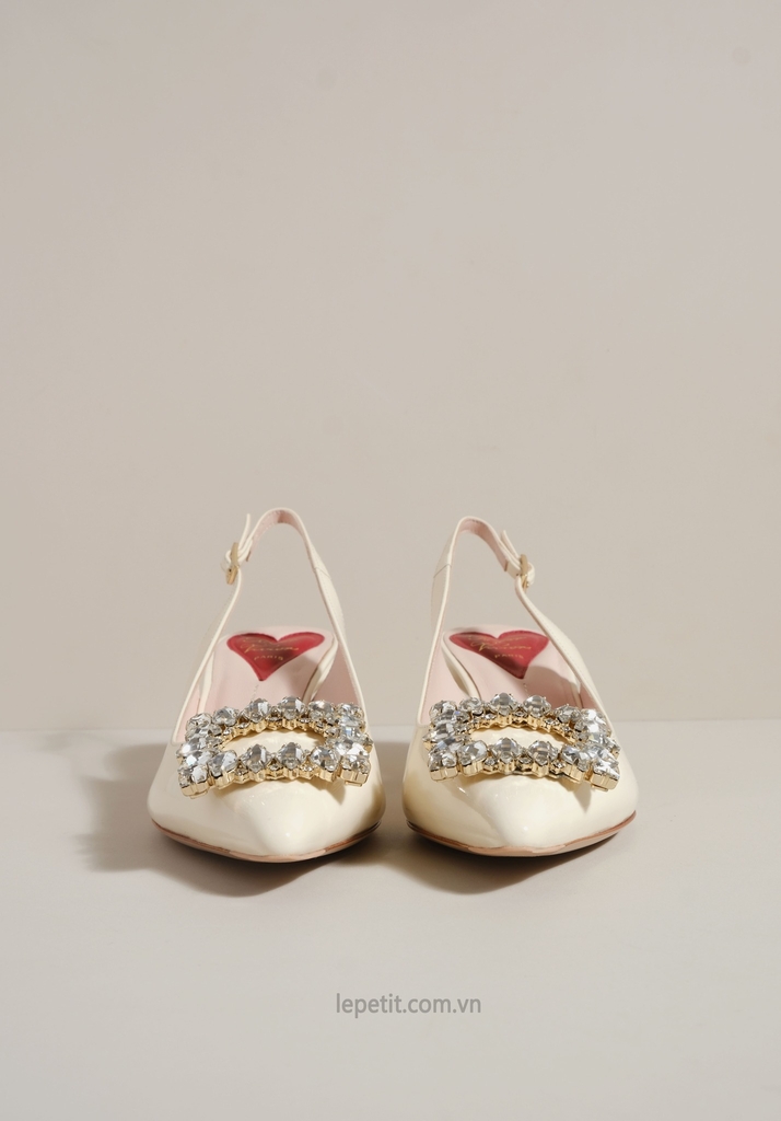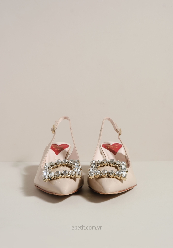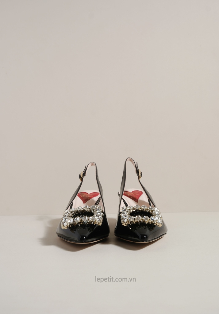 Phiên bản slingback được hoàn thiện trên nền da bóng sang trọng, điểm xuyết khóa buckle đính pha lê lấp lánh. Lót giày hình trái tim đỏ vừa là một chi tiết nhận diện kín đáo của RV vừa là điểm nhấn ngọt ngào, sẵn sàng đồng hành cùng bạn suốt ngày dài với vẻ đẹp thanh lịch đầy nữ tính.