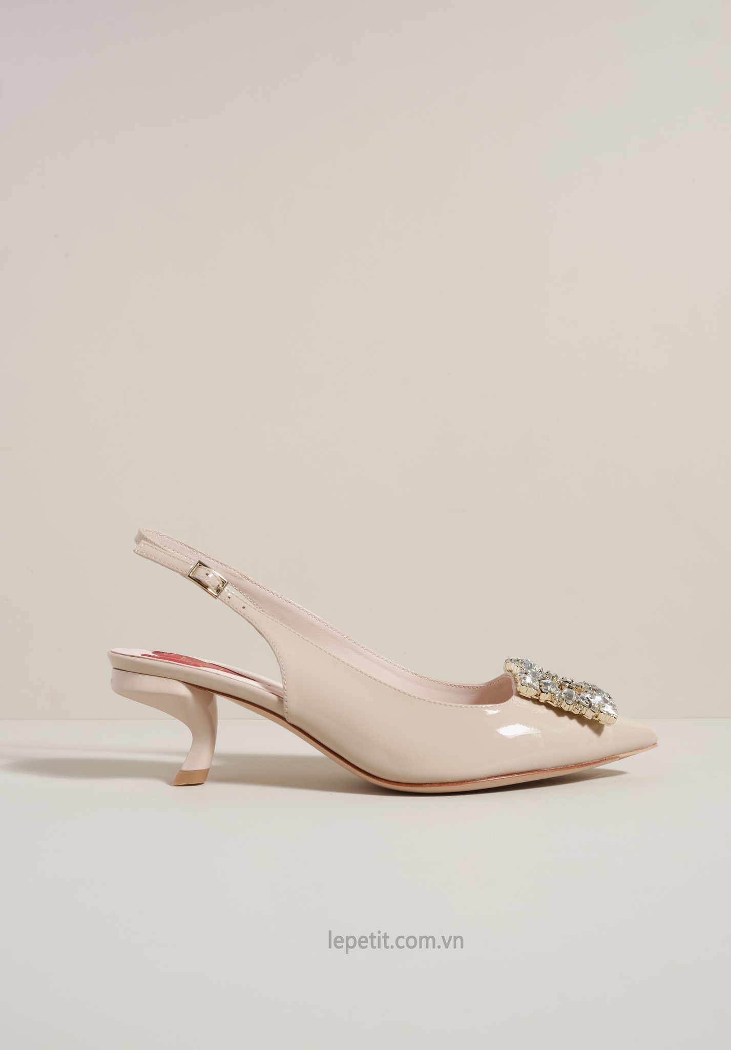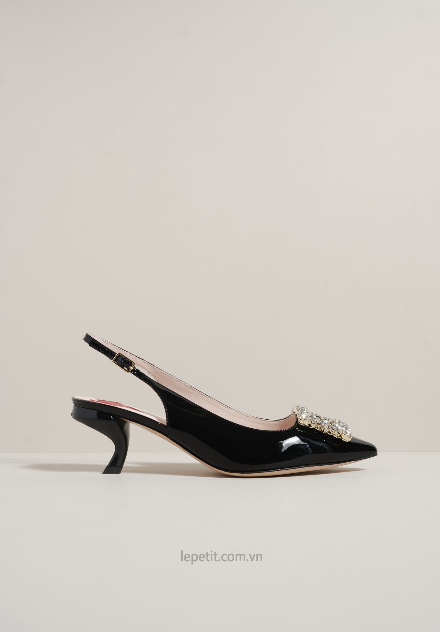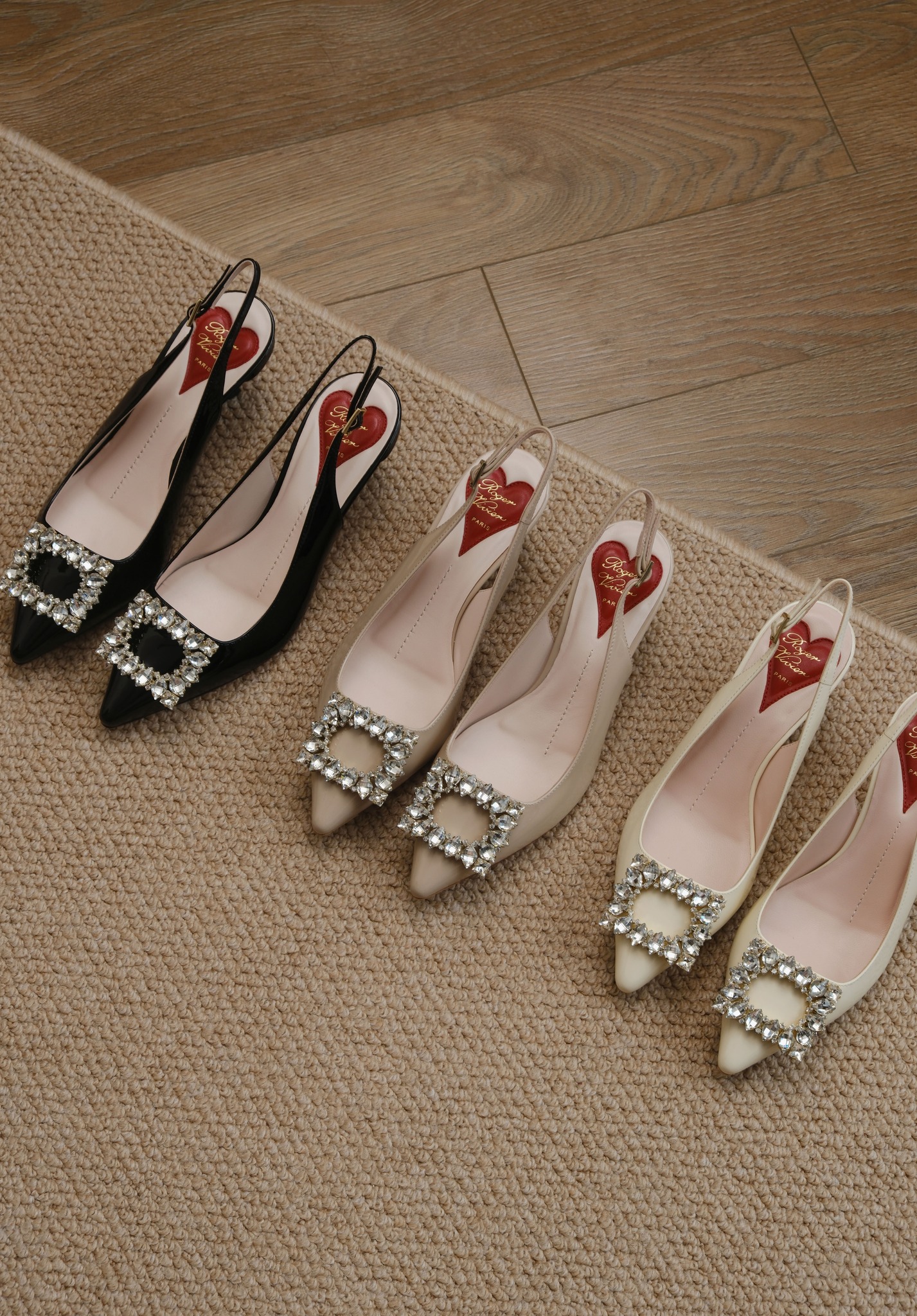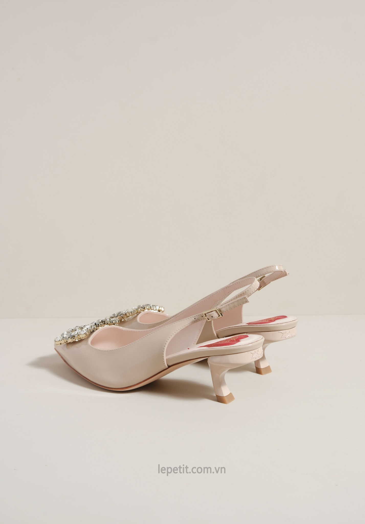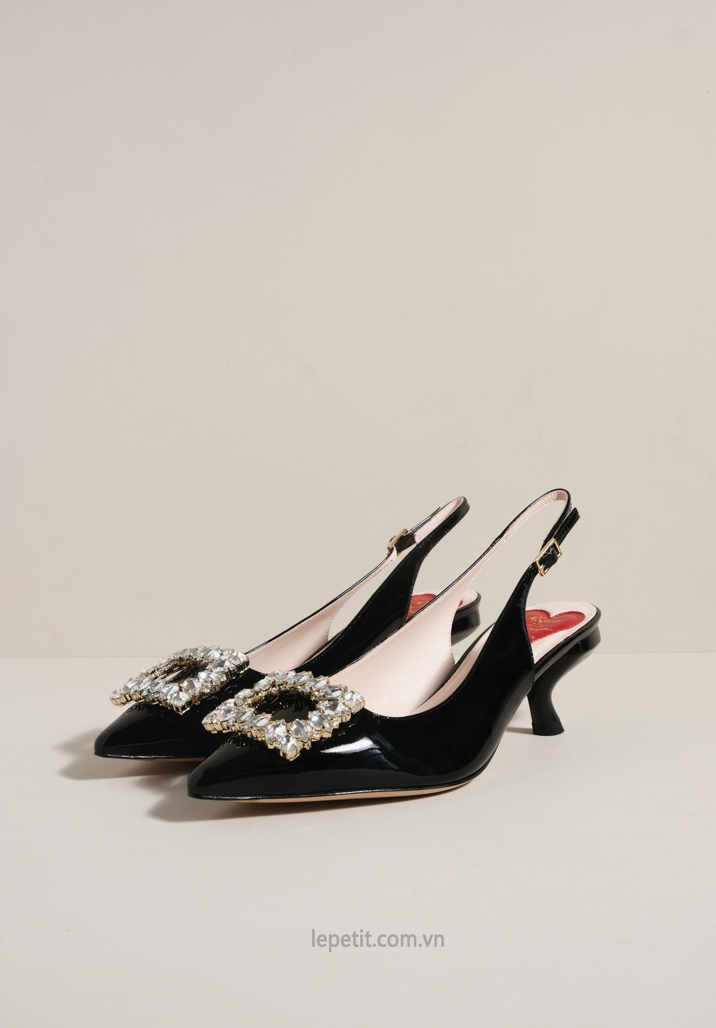 Phiên bản slingback được hoàn thiện trên nền da bóng sang trọng, điểm xuyết khóa buckle đính pha lê lấp lánh. Lót giày hình trái tim đỏ vừa là một chi tiết nhận diện kín đáo của RV vừa là điểm nhấn ngọt ngào, sẵn sàng đồng hành cùng bạn suốt ngày dài với vẻ đẹp thanh lịch đầy nữ tính.