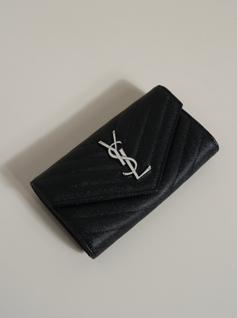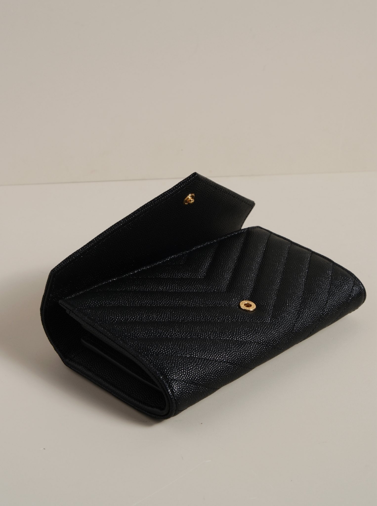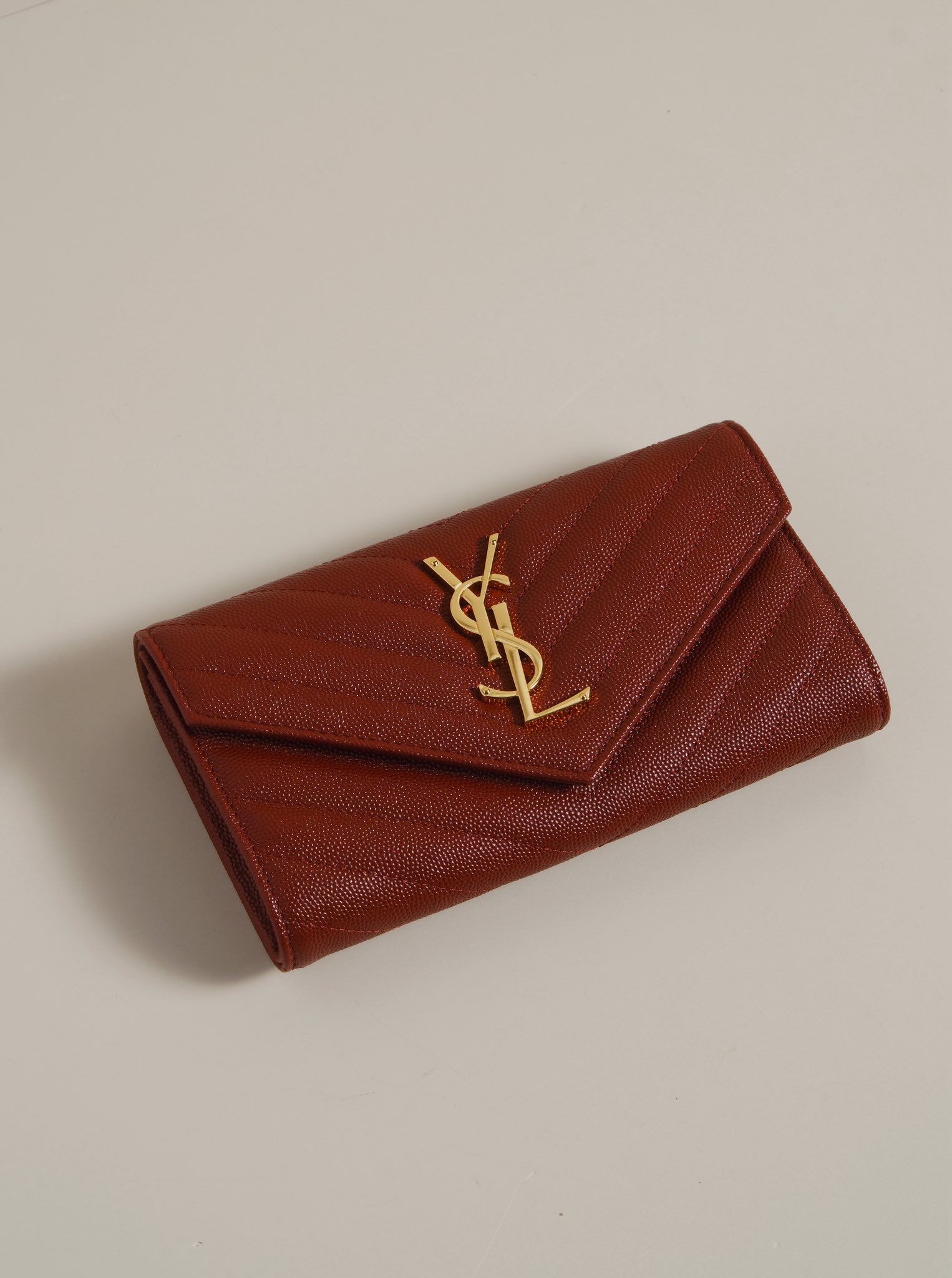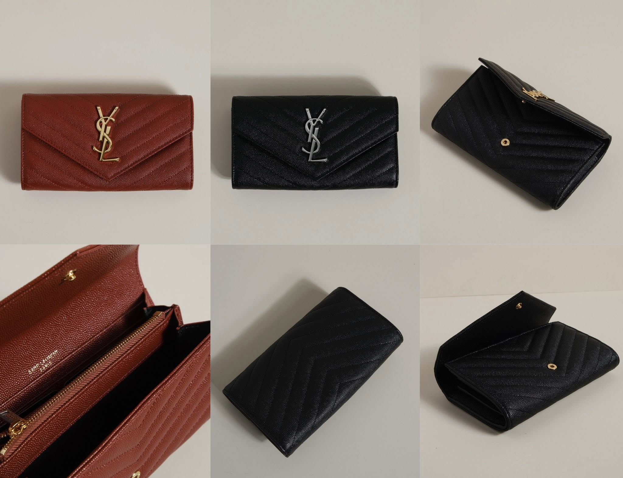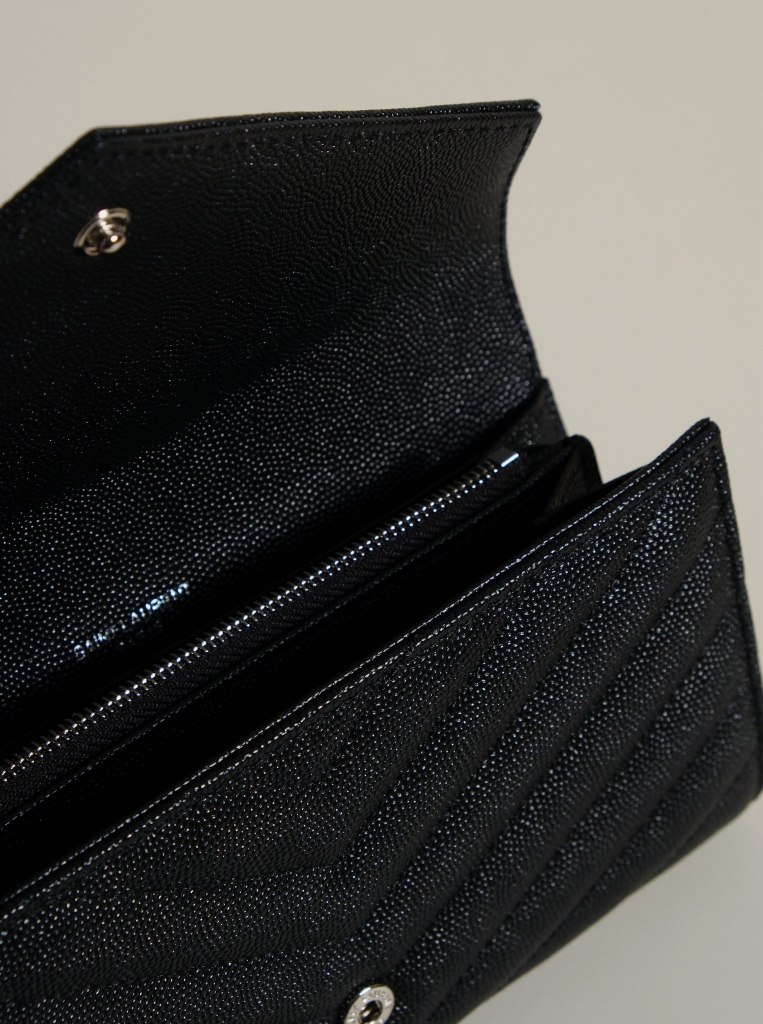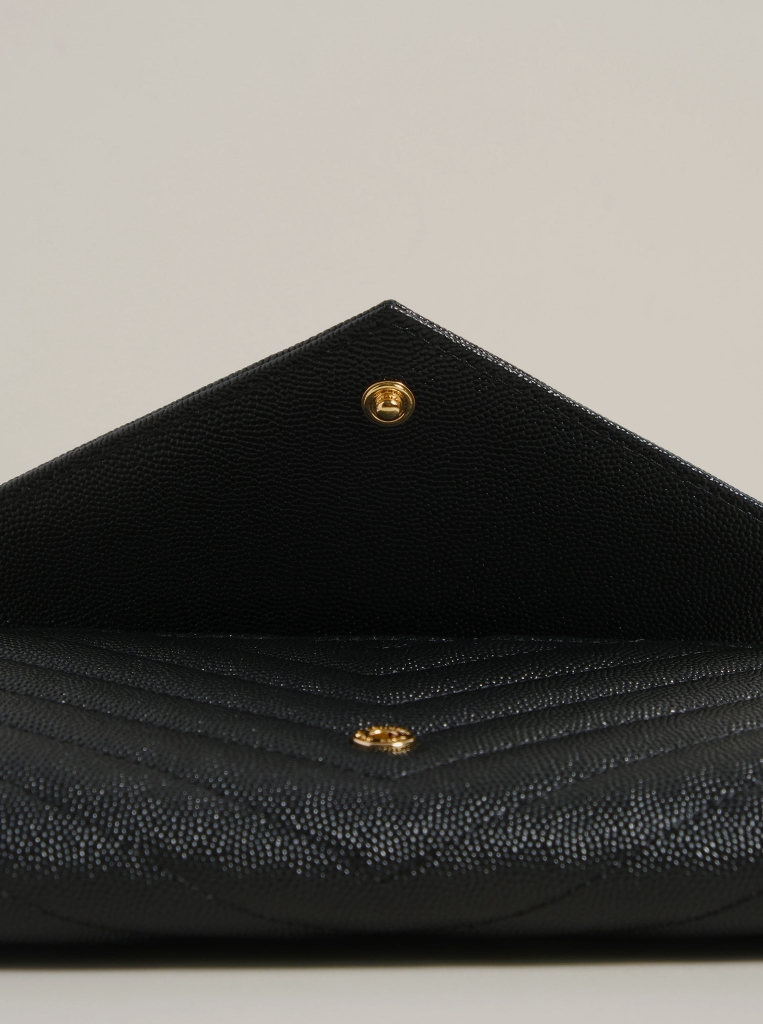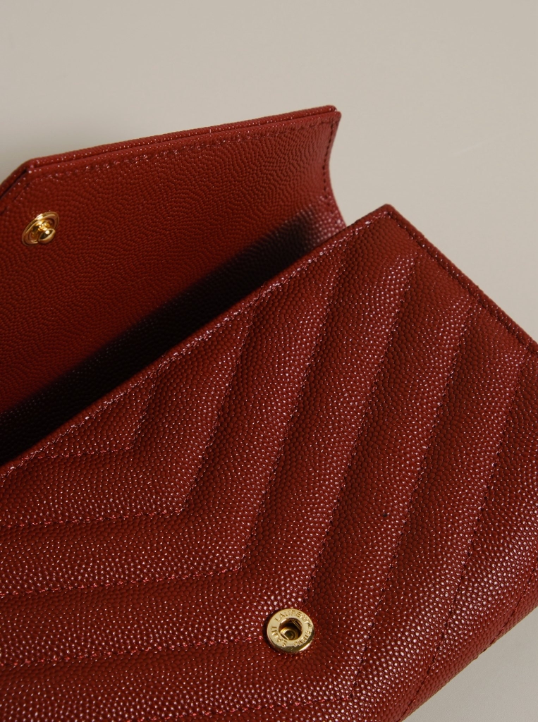Thiết kế kinh điển của SL được thu nhỏ lại trong chiếc ví dáng bì thư thanh lịch. Ví sở hữu thiết kế may chần Matelassé trên nền da bê hạt, logo Y S L tạo điểm nhấn nổi bật, gồm 5 ngăn dài để được tiền thẳng và hóa đơn, 12 ngăn để thẻ.