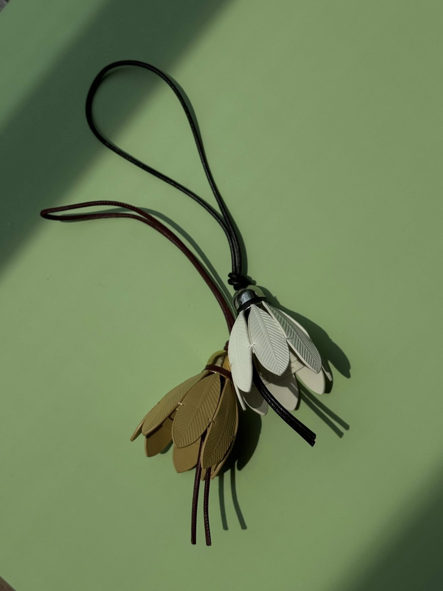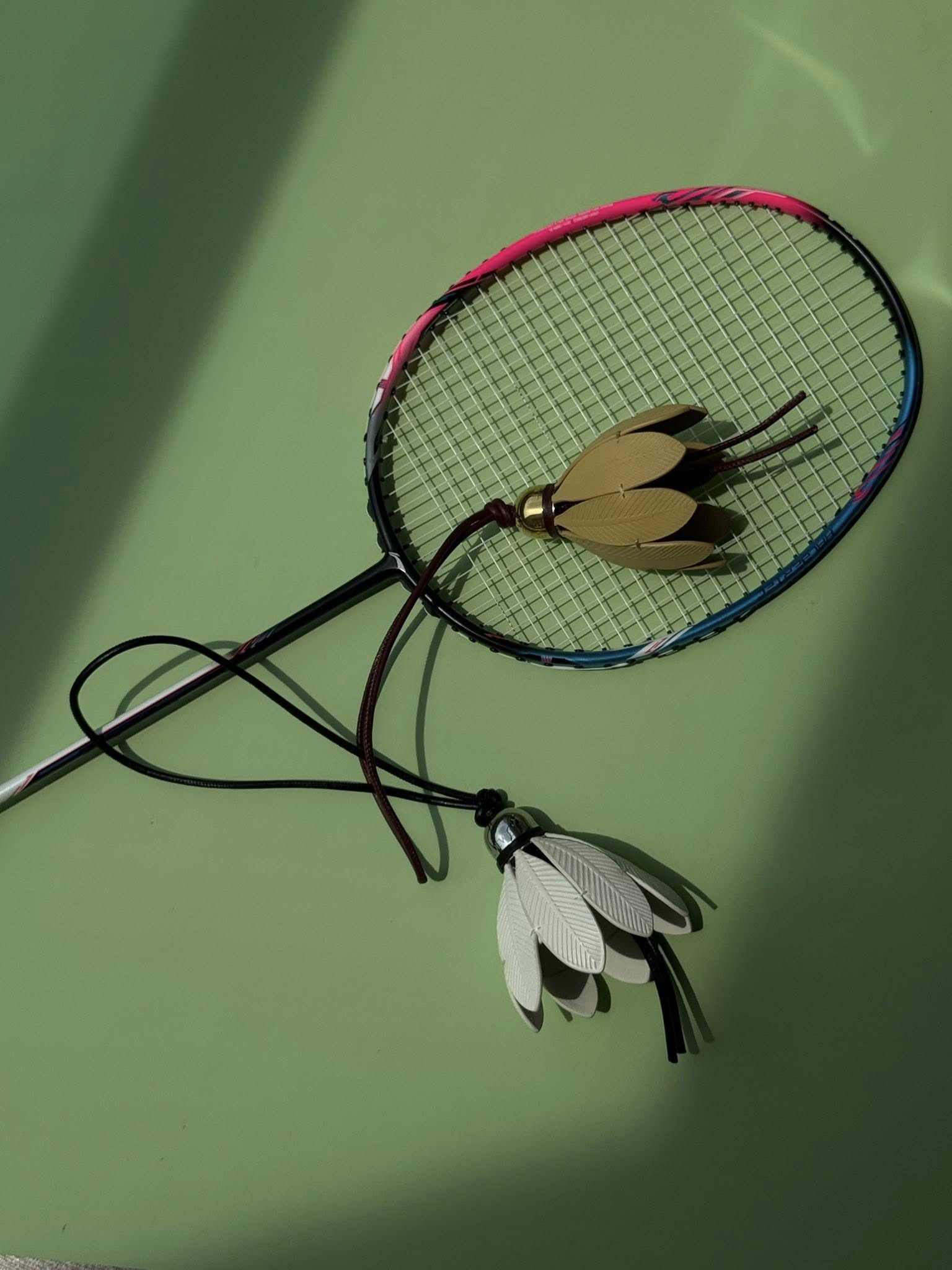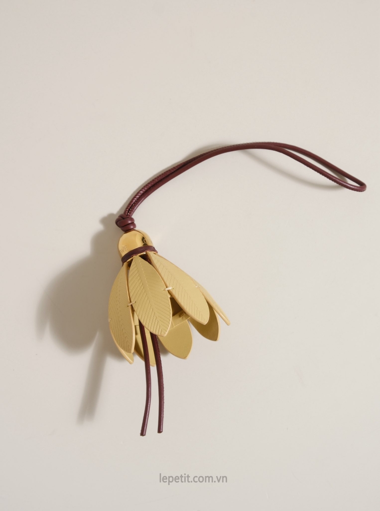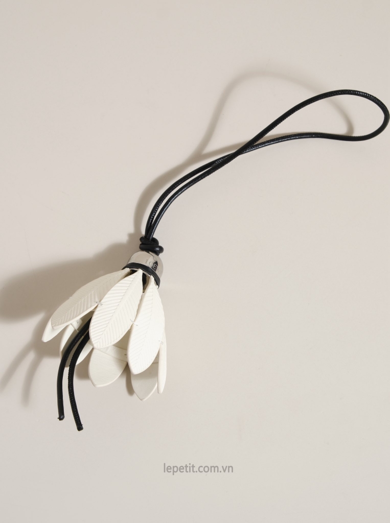 Charm treo túi hình quả cầu lông bằng da, chuôi cầu bằng kim loại màu gold, dây treo bằng da.