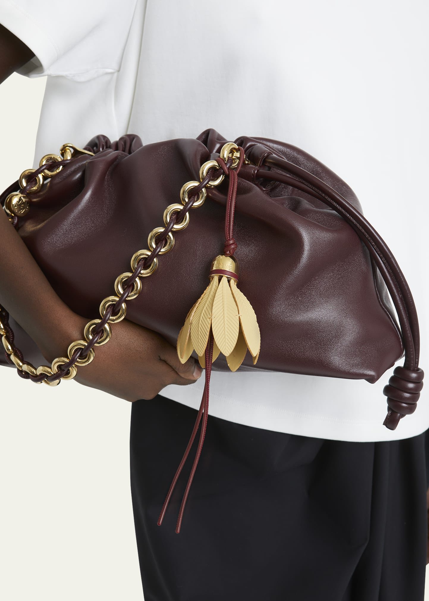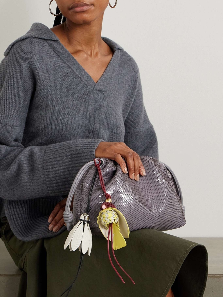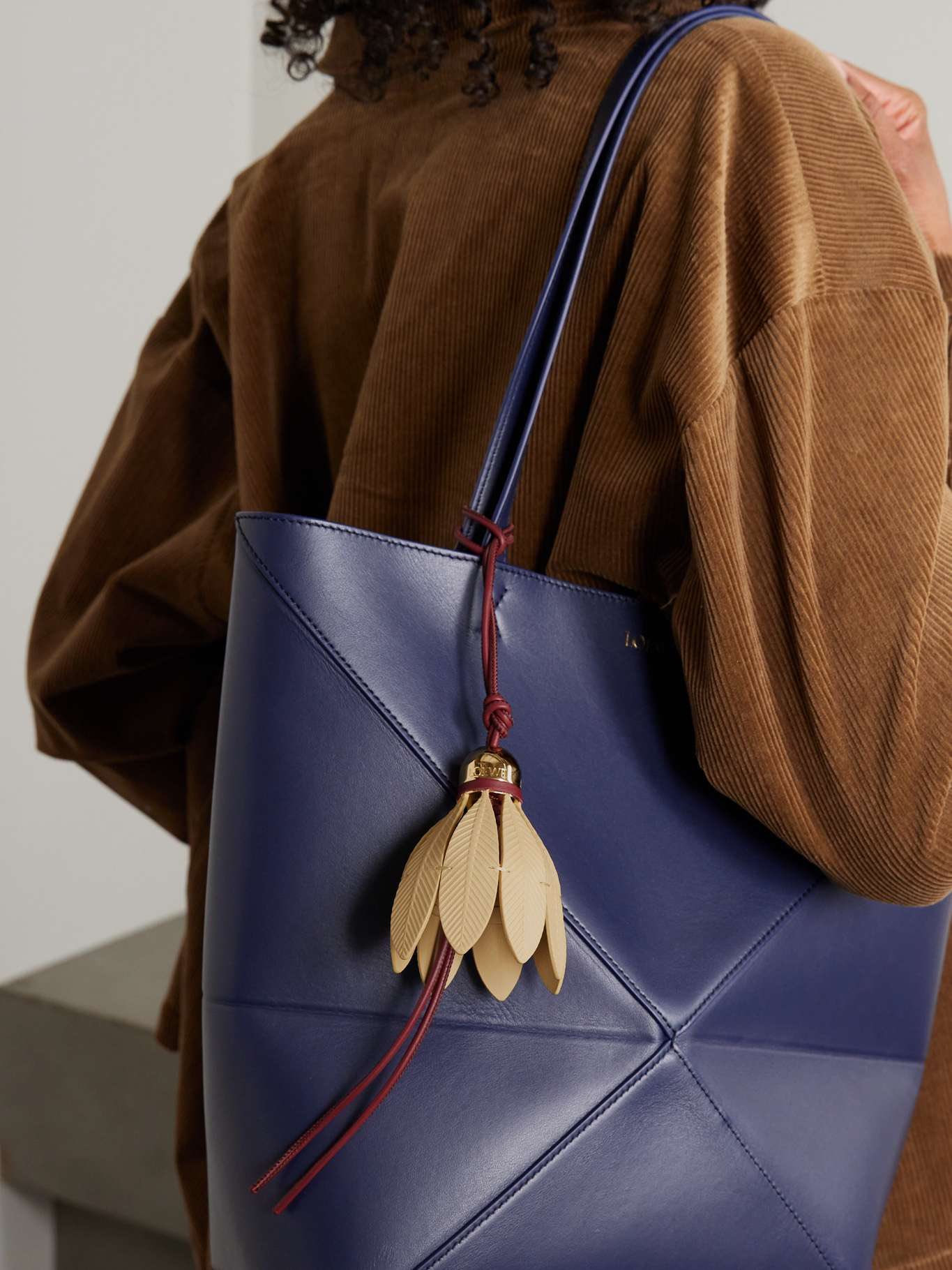Charm treo túi hình quả cầu lông bằng da, chuôi cầu bằng kim loại màu gold, dây treo bằng da.