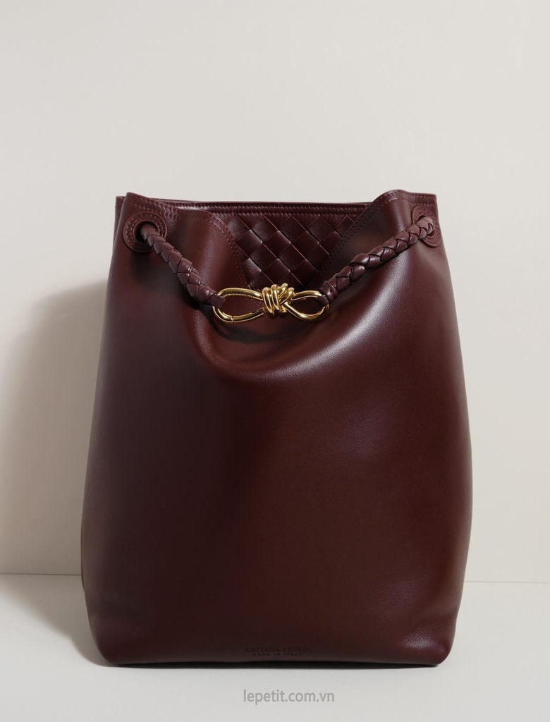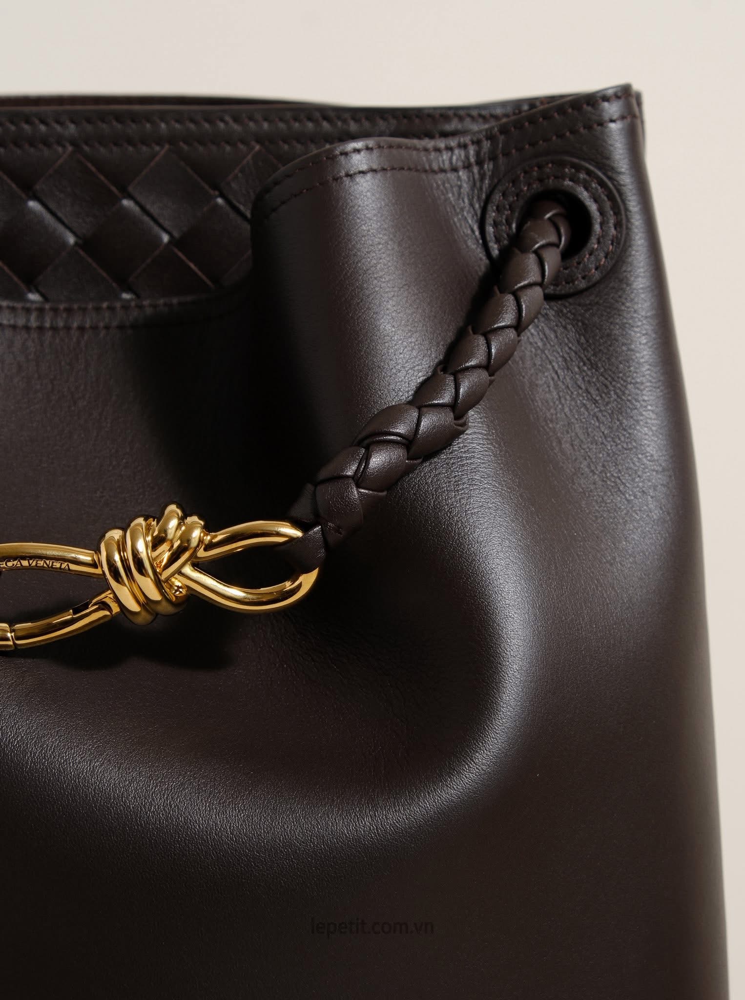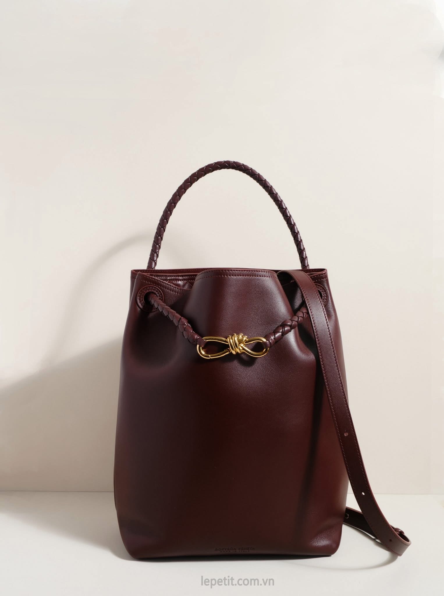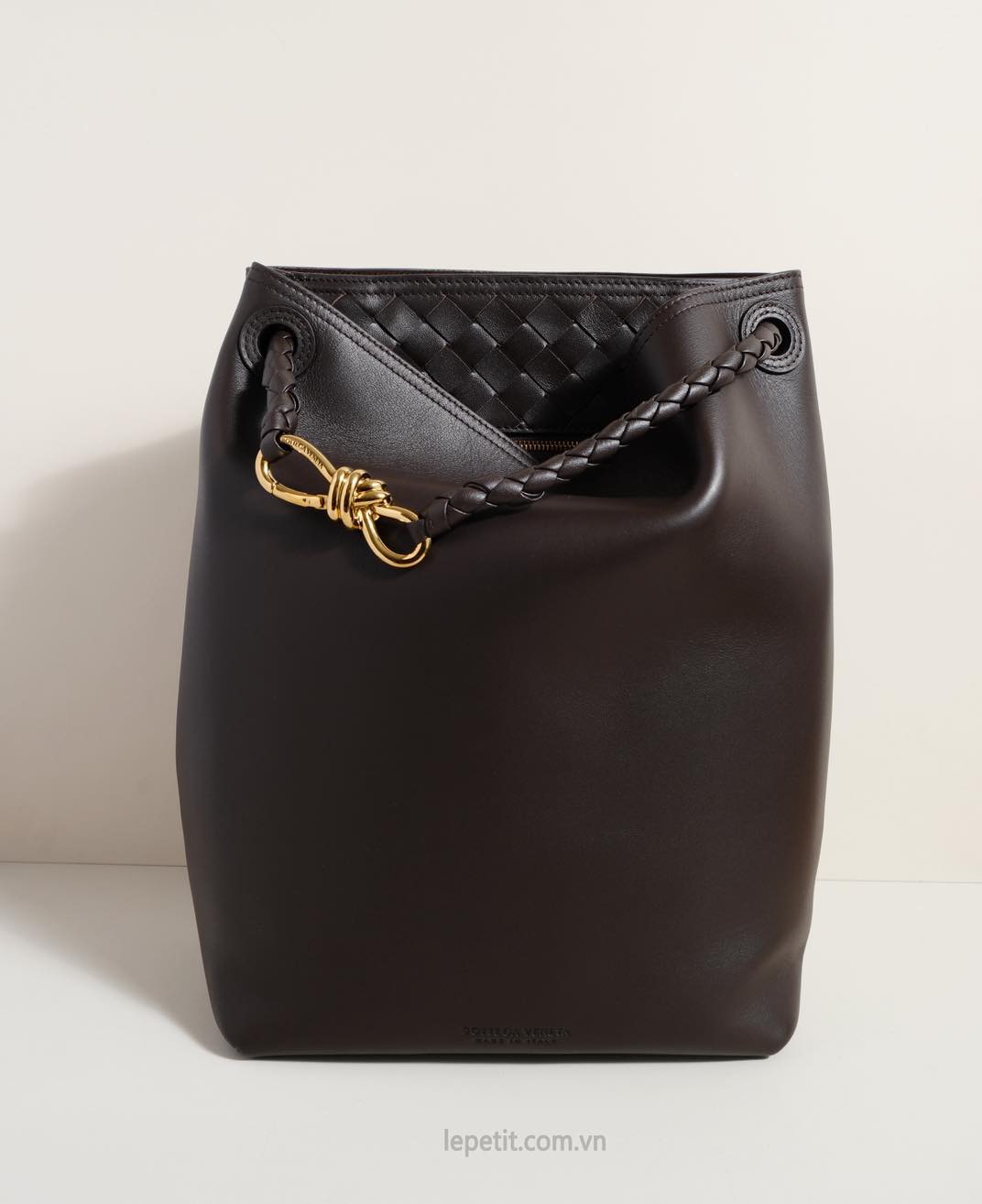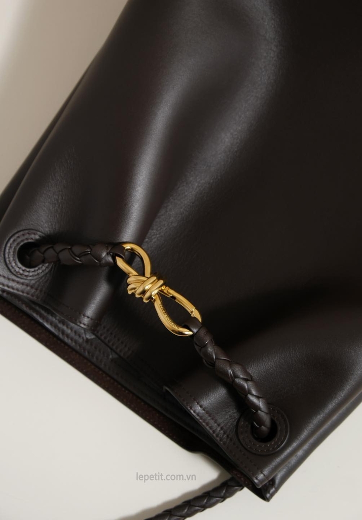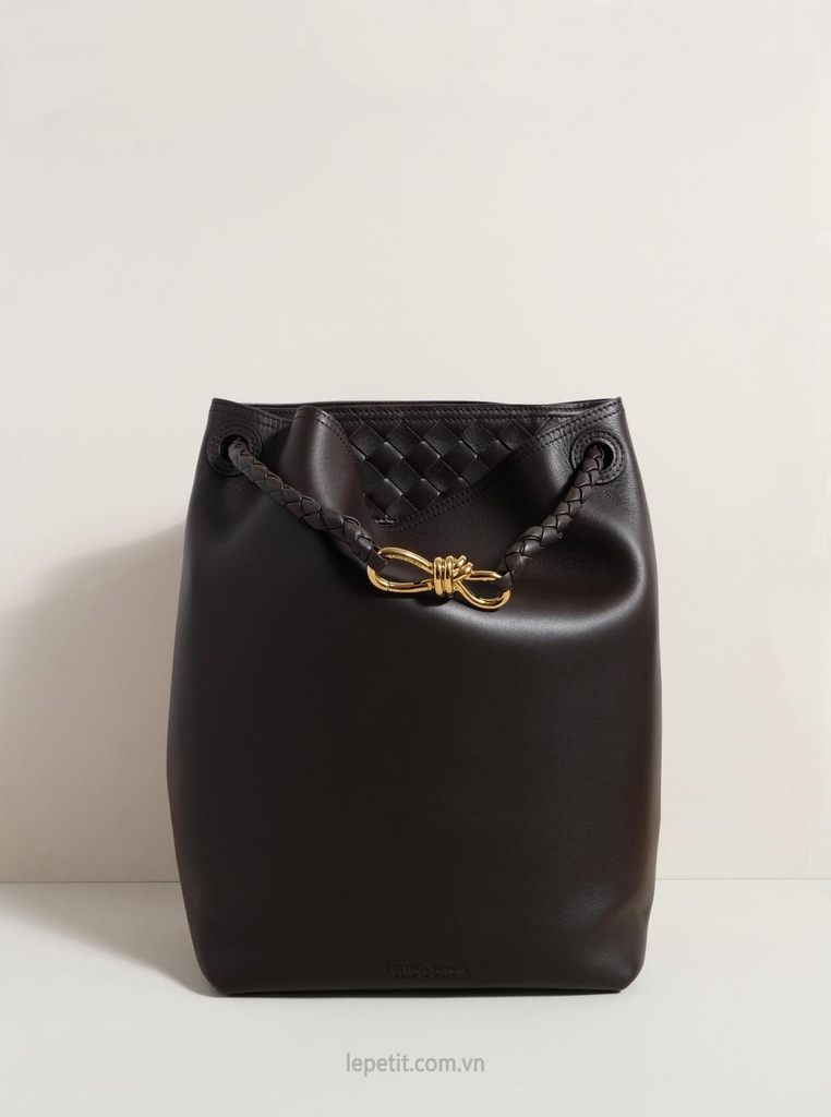 Dáng túi bucket rộng rãi, chất liệu da bê mềm mại & linh hoạt như vải, dấu ấn đặc trưng của dòng Andiamo được thể hiện qua lớp lót đan da Intrecciato ẩn hiện, quai đan và khoá kim loại màu gold, tất cả tạo nên một tổng thể vừa sang trọng vừa phóng khoáng.
