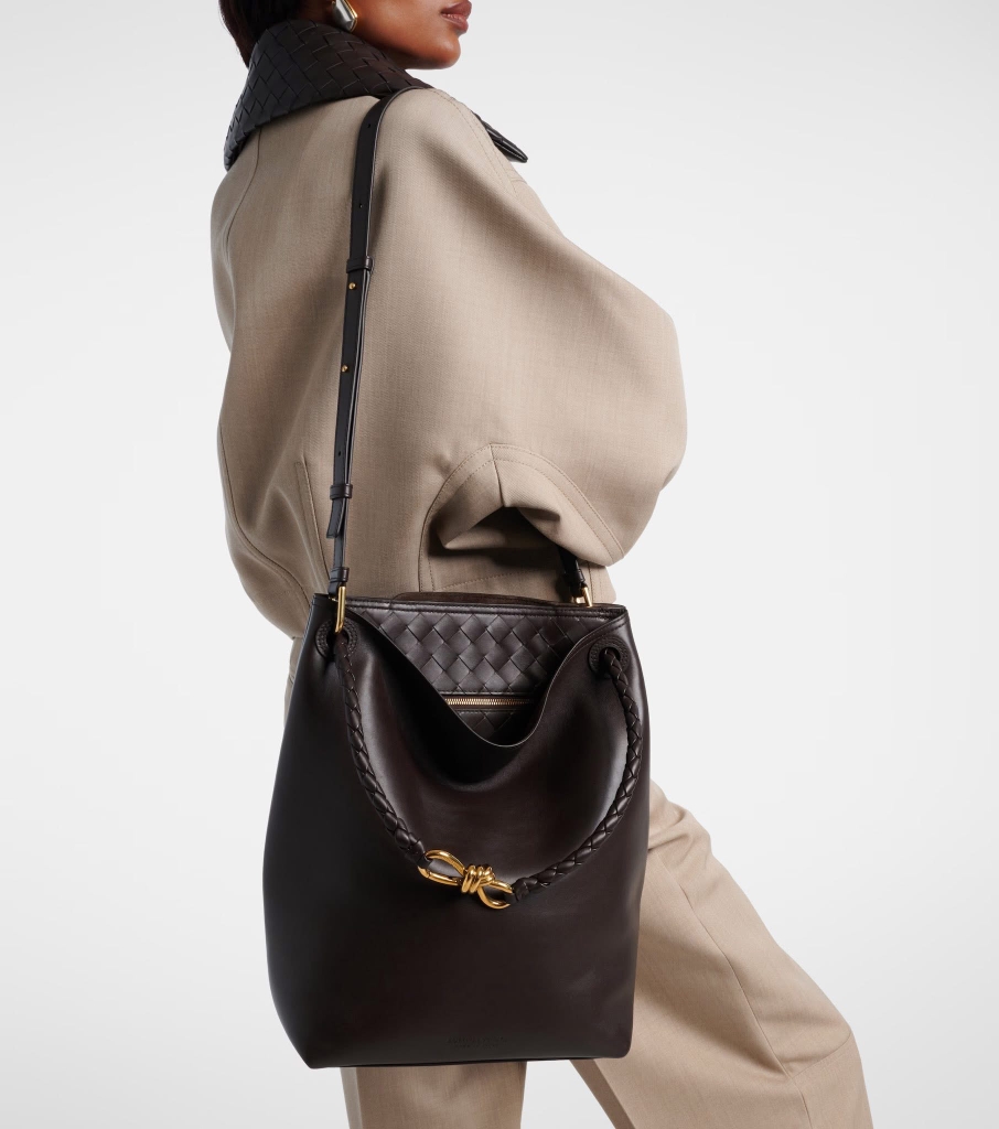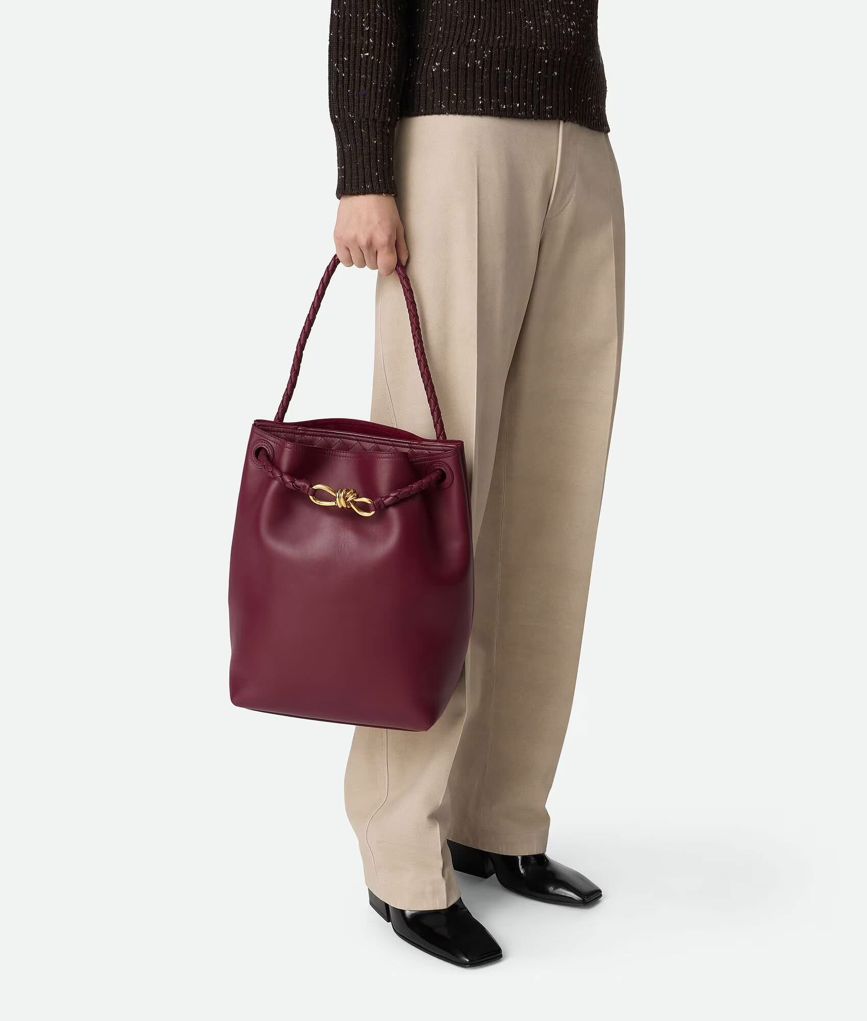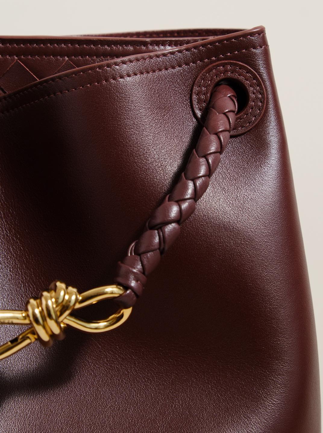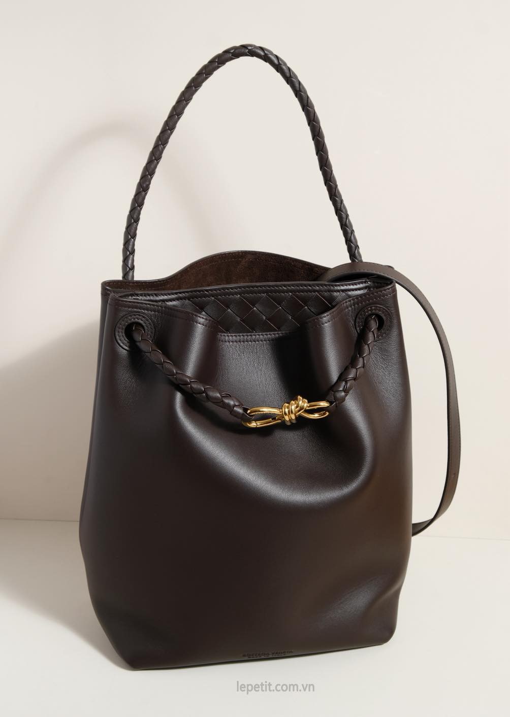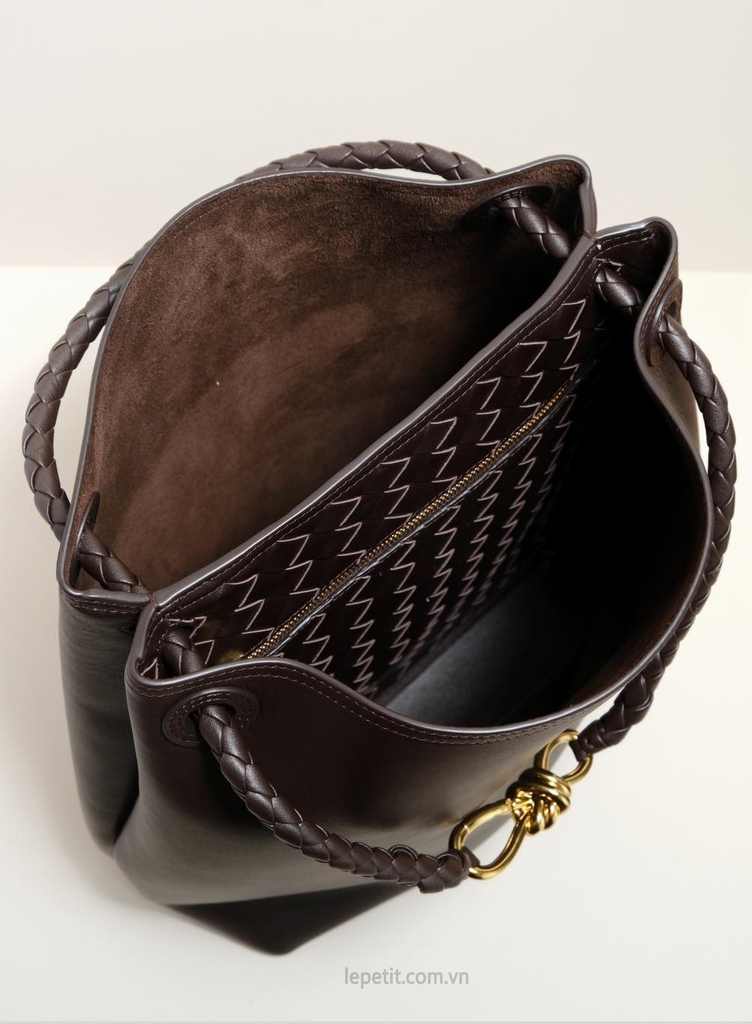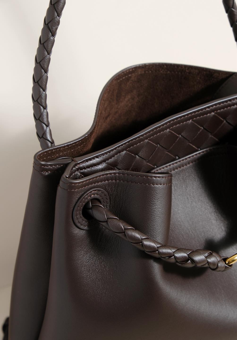 Dáng túi bucket rộng rãi, chất liệu da bê mềm mại & linh hoạt như vải, dấu ấn đặc trưng của dòng Andiamo được thể hiện qua lớp lót đan da Intrecciato ẩn hiện, quai đan và khoá kim loại màu gold, tất cả tạo nên một tổng thể vừa sang trọng vừa phóng khoáng.