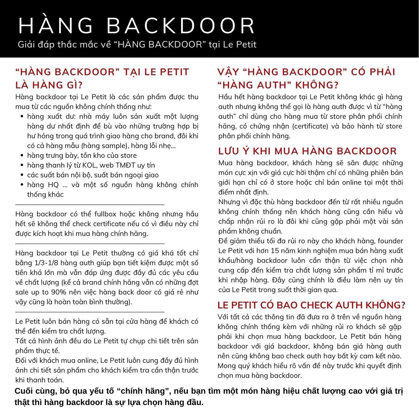 Với tất cả các thông tin đã đưa ra ở trên về nguồn hàng không chính thống kèm với những rủi ro khách sẽ gặp phải khi chọn mua hàng backdoor, Le Petit bán hàng backdoor với giá backdoor, không bán giá hàng auth nên cũng không bao check auth hay bất kỳ cam kết nào.