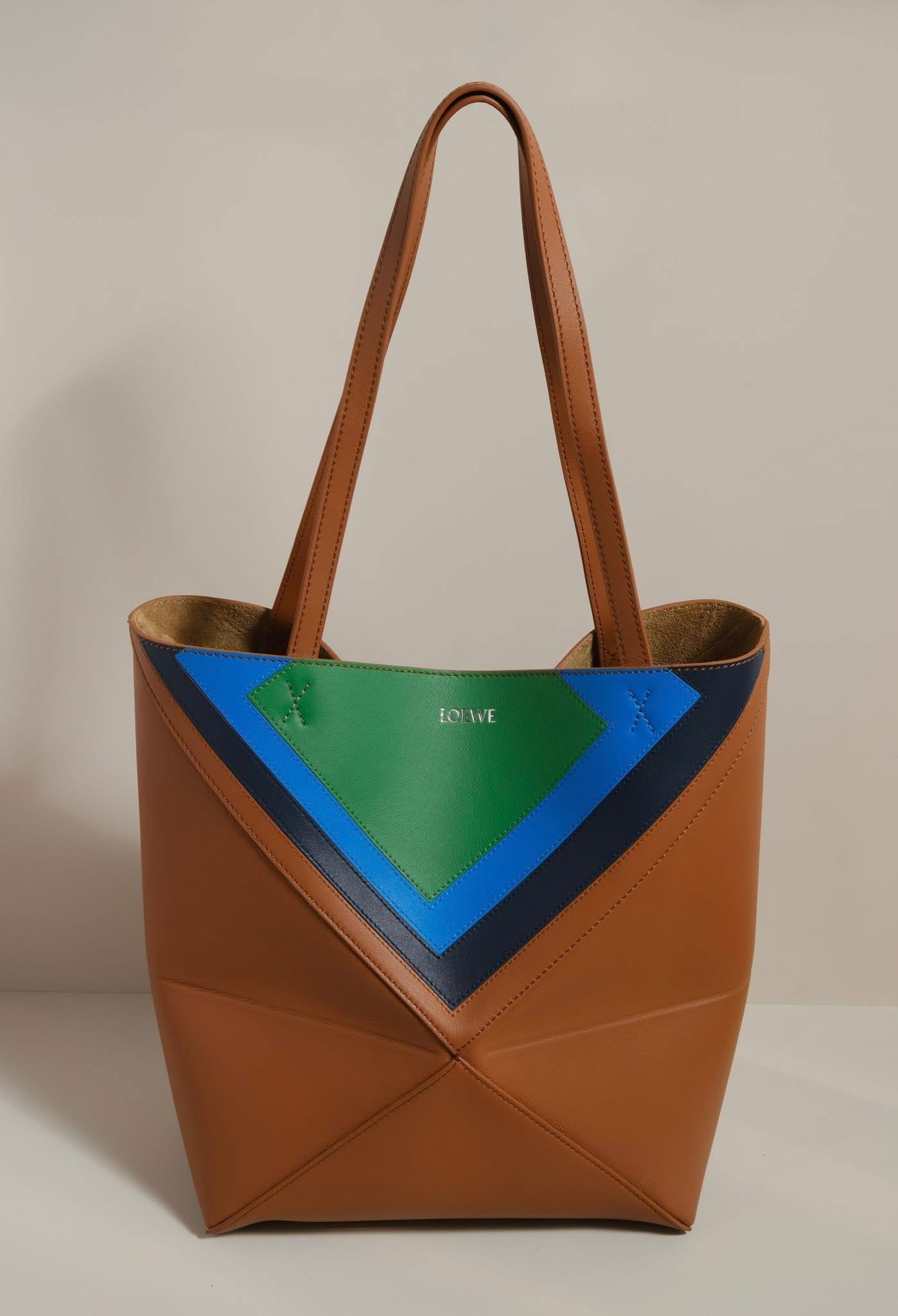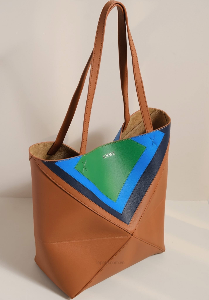 Chiếc túi Puzzle Fold Tote là sự giao thoa giữa nghệ thuật và kỹ thuật, nơi những khối màu xanh lam, xanh lá, nâu được sắp đặt như một bản hòa sắc cân bằng và trừu tượng.