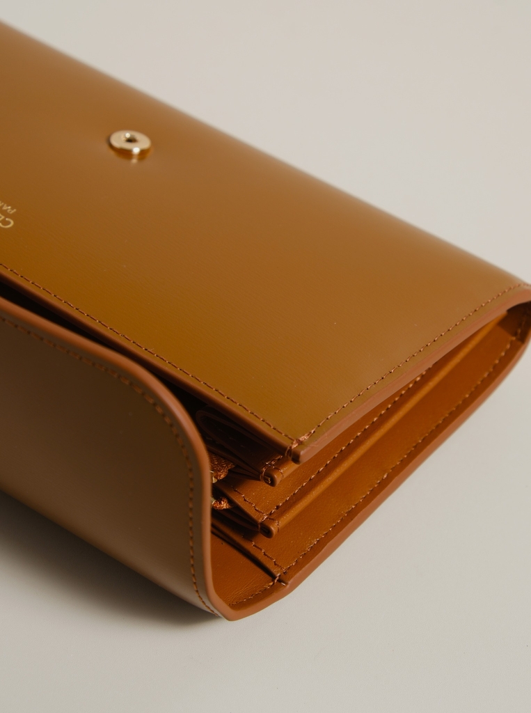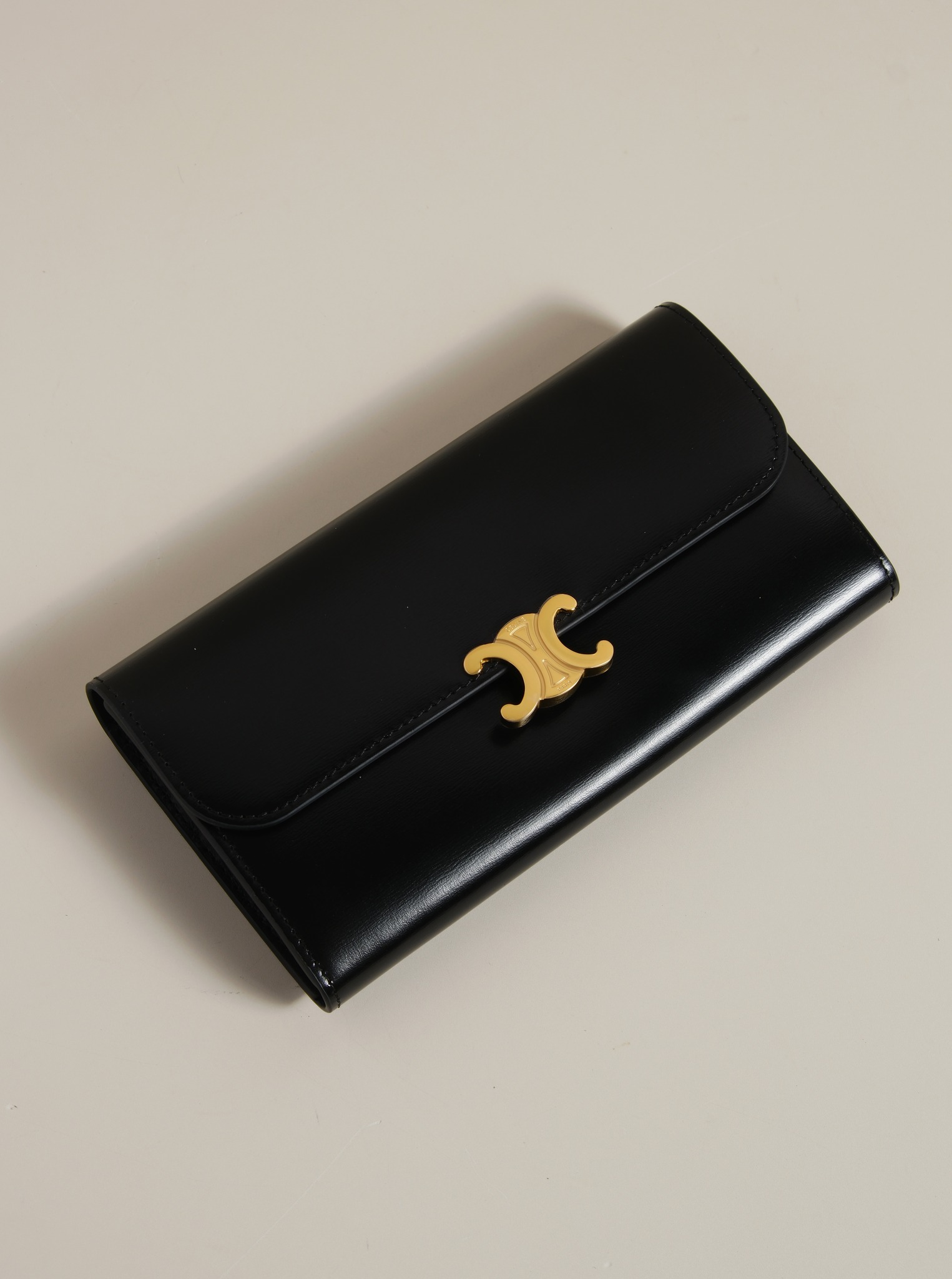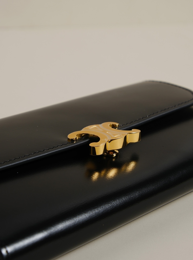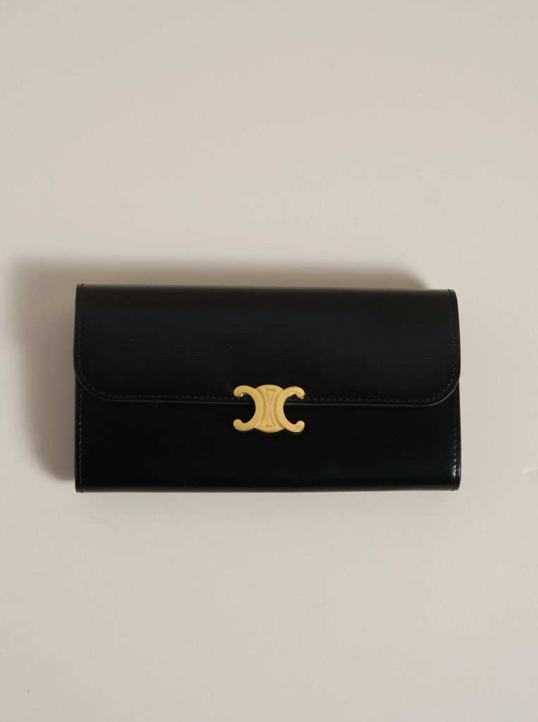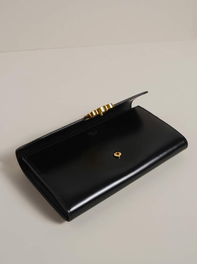 Ví dài nắp gập, khóa bấm. Thiết kế tối giản, thanh lịch với chất liệu da trơn. Mặt trước đính logo Triomphe kim loại màu gold là signature của CL tạo điểm nhấn sang trọng.