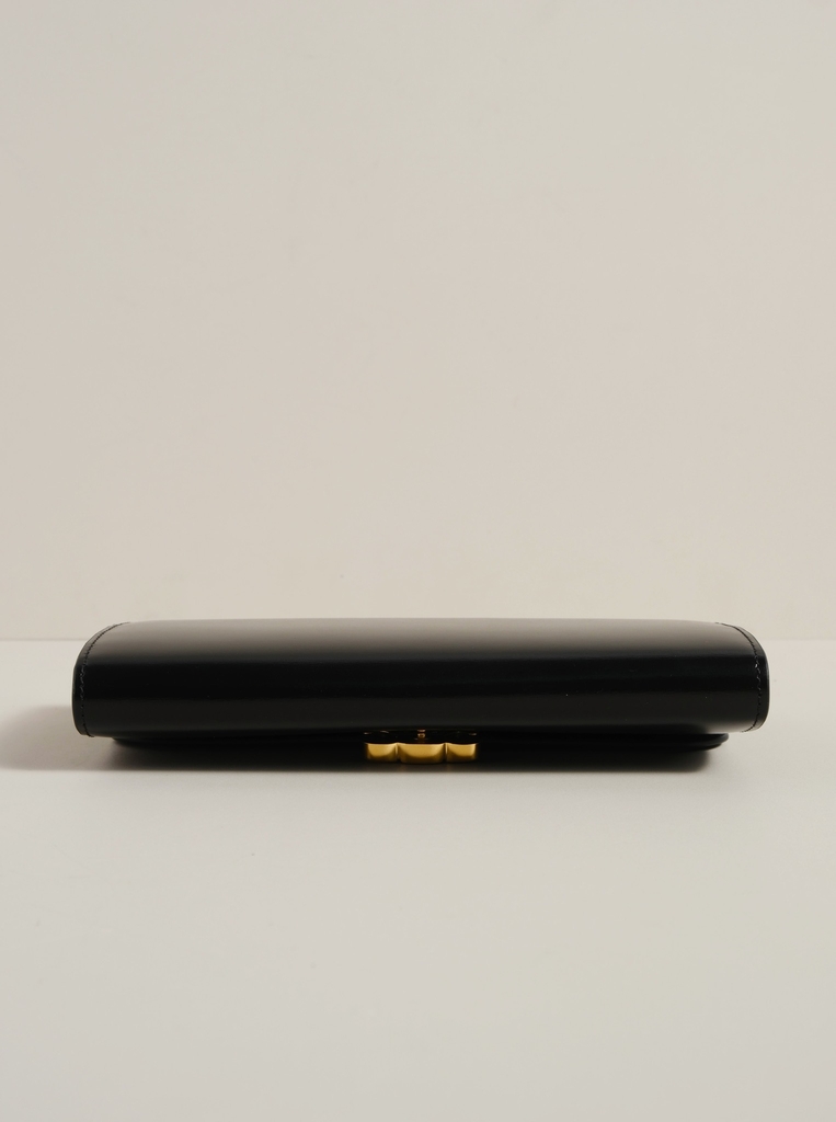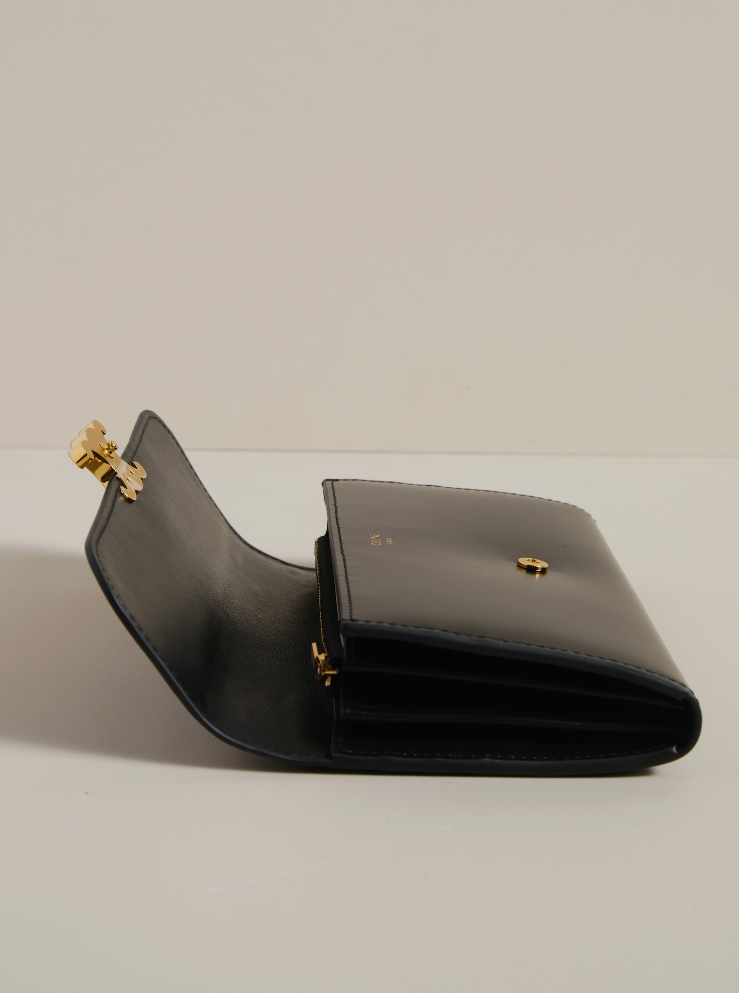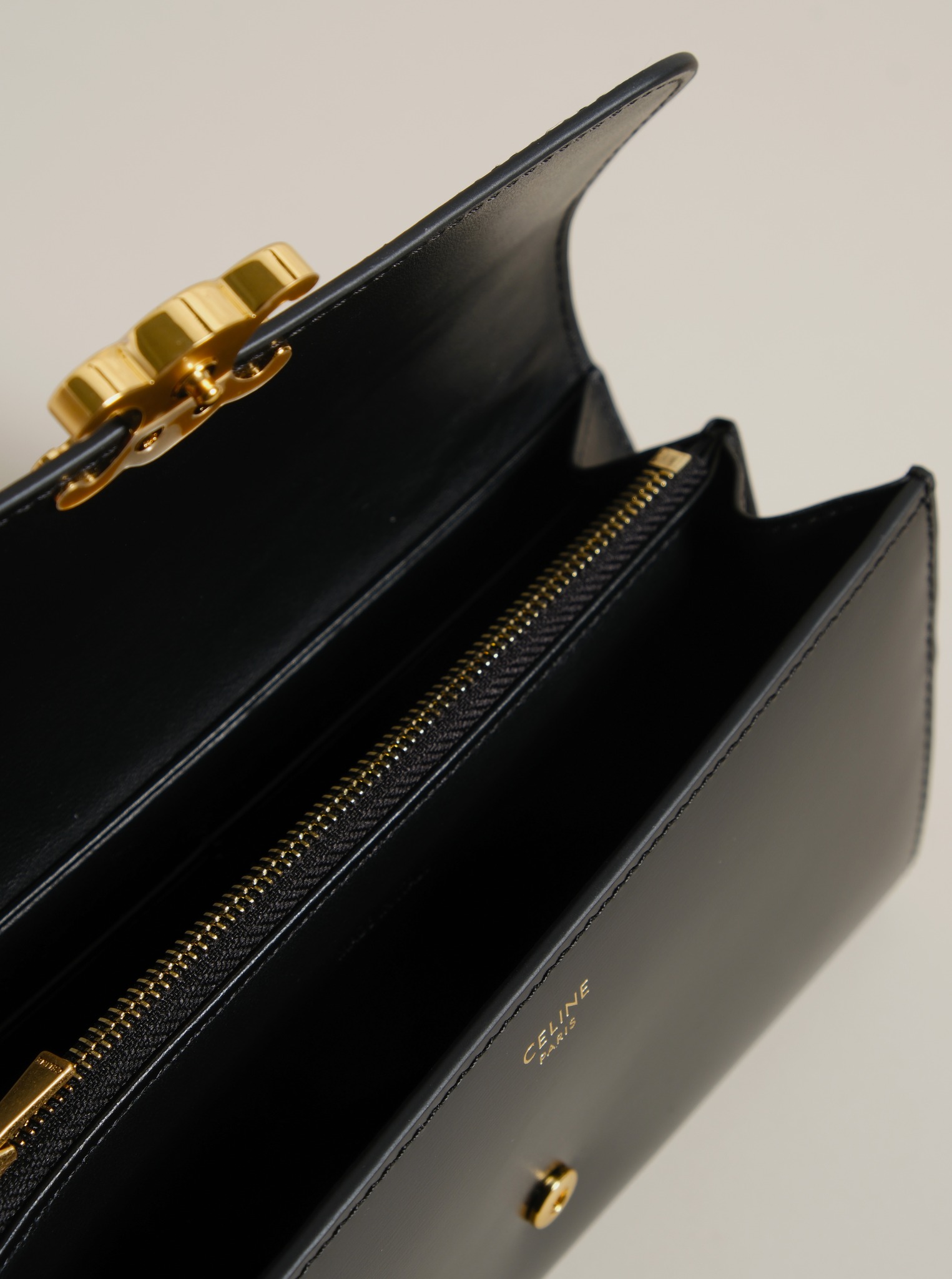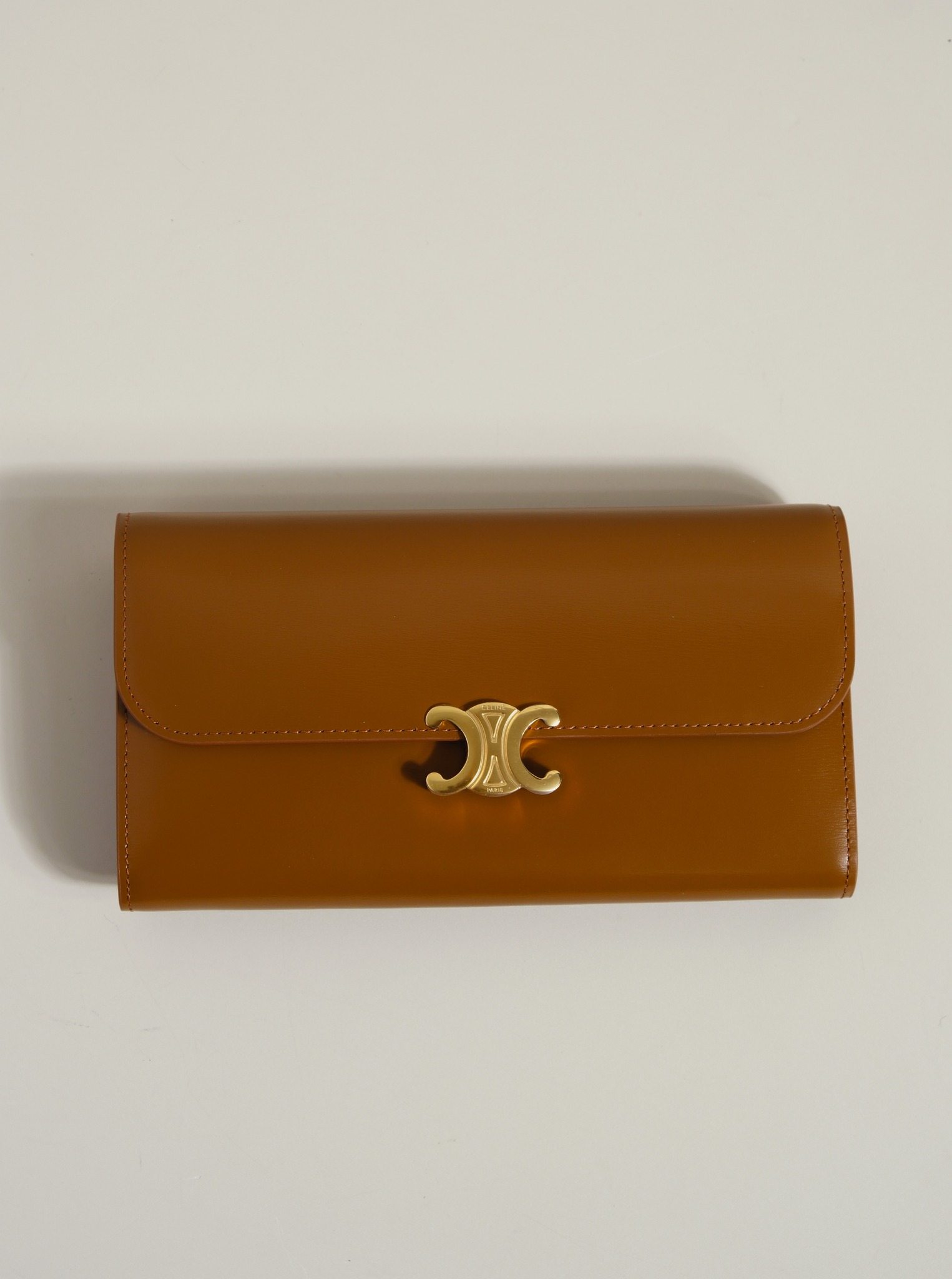 Ví dài nắp gập, khóa bấm. Thiết kế tối giản, thanh lịch với chất liệu da trơn. Mặt trước đính logo Triomphe kim loại màu gold là signature của CL tạo điểm nhấn sang trọng.