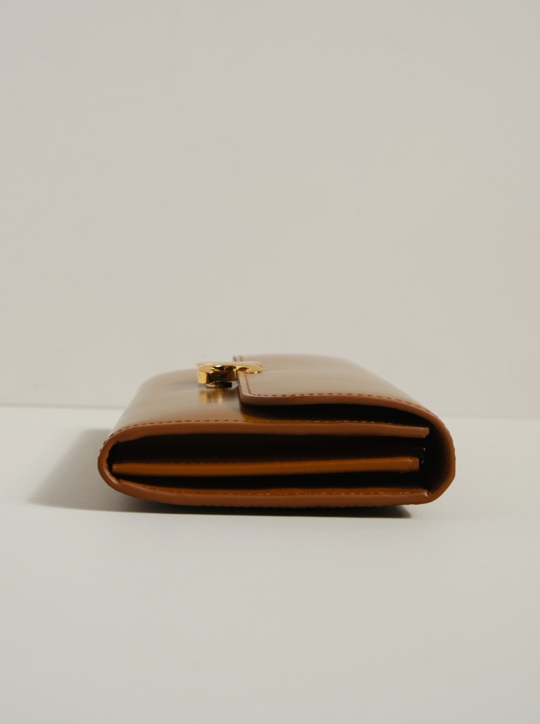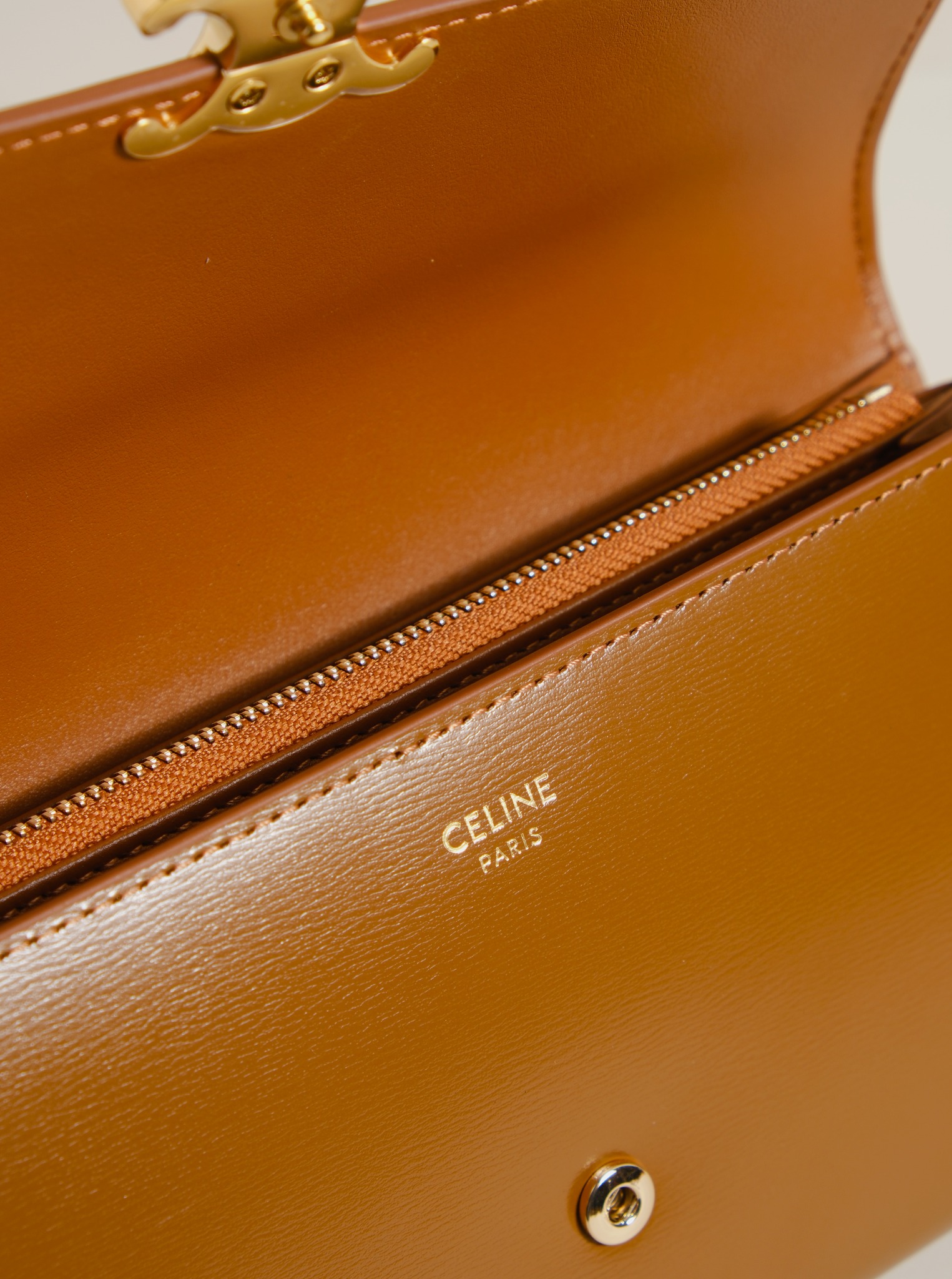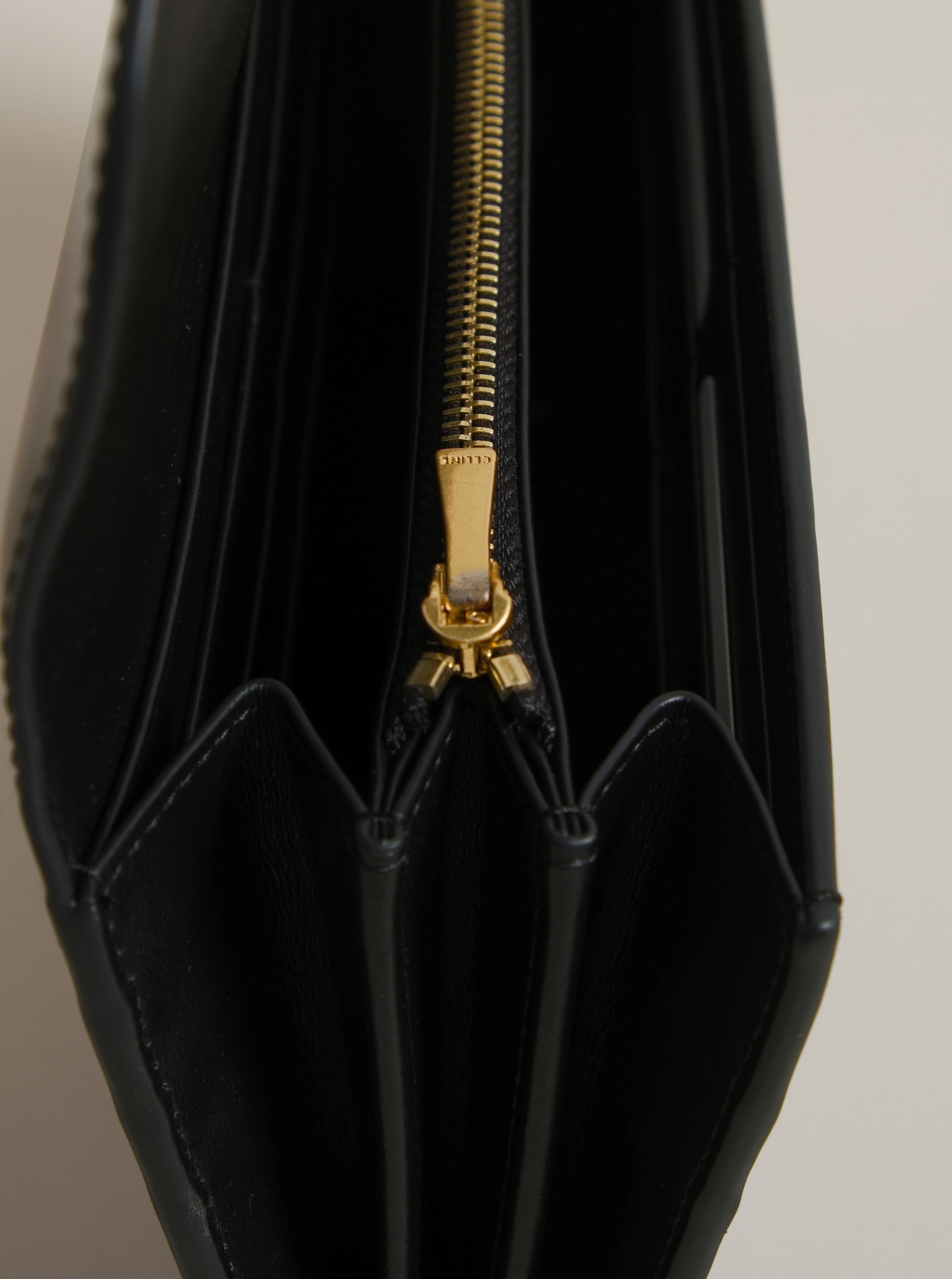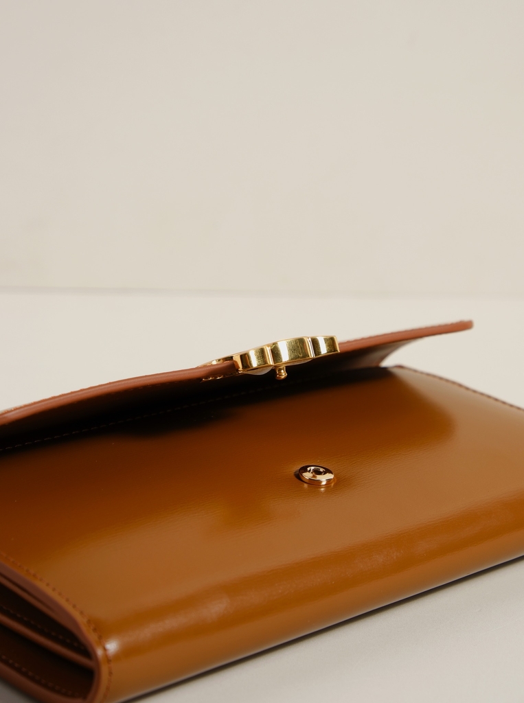 Ví dài nắp gập, khóa bấm. Thiết kế tối giản, thanh lịch với chất liệu da trơn. Mặt trước đính logo Triomphe kim loại màu gold là signature của CL tạo điểm nhấn sang trọng.