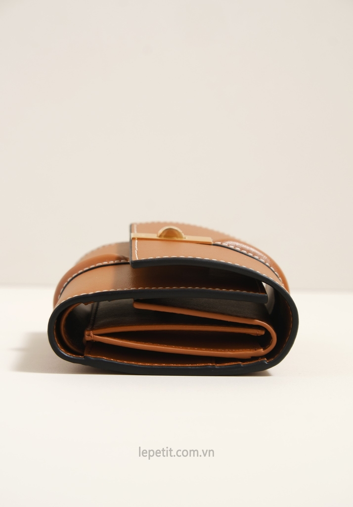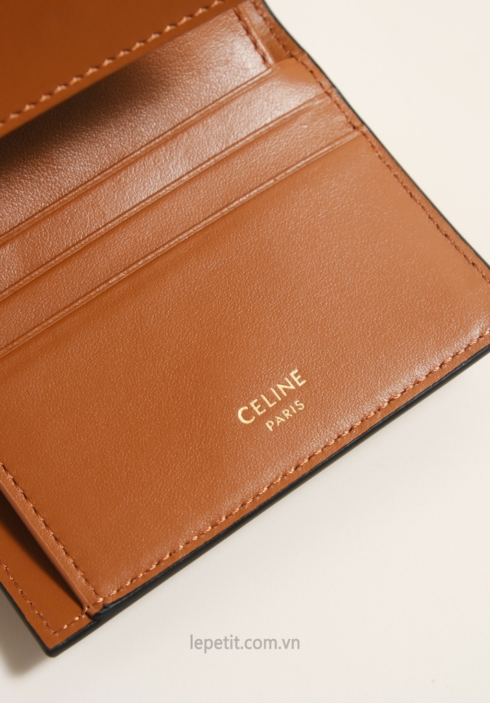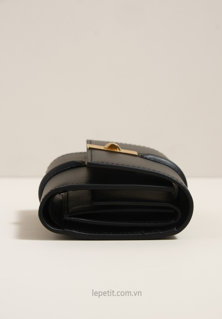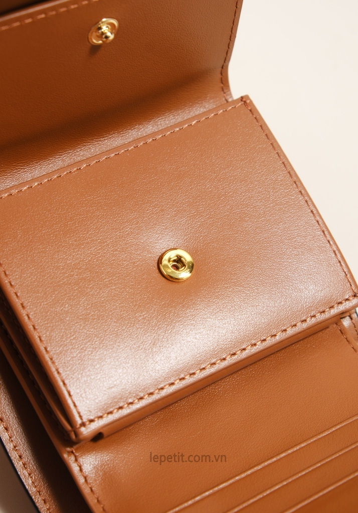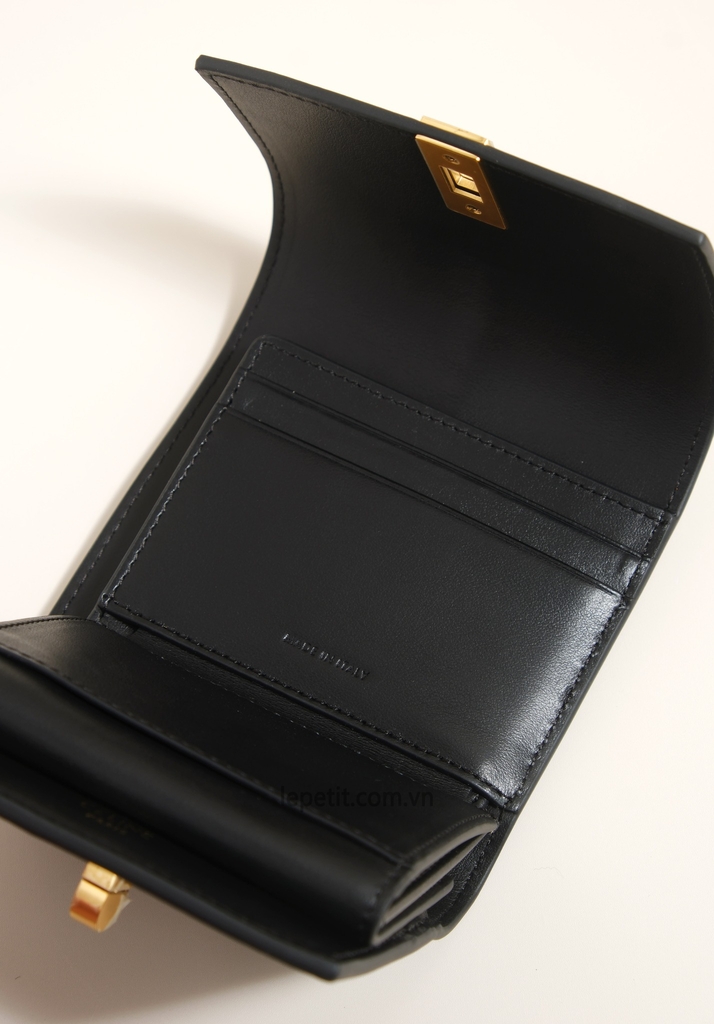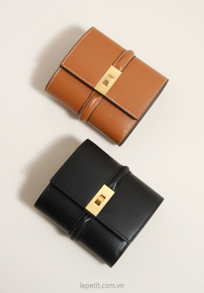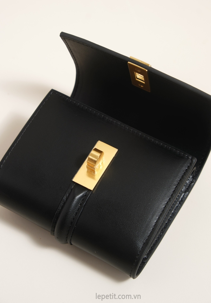 Ví gập ba, khóa bấm. Thiết kế tối giản, thanh lịch với chất liệu da trơn và khóa màu gold lấy cảm hứng từ dòng túi 16 signature của CL.
