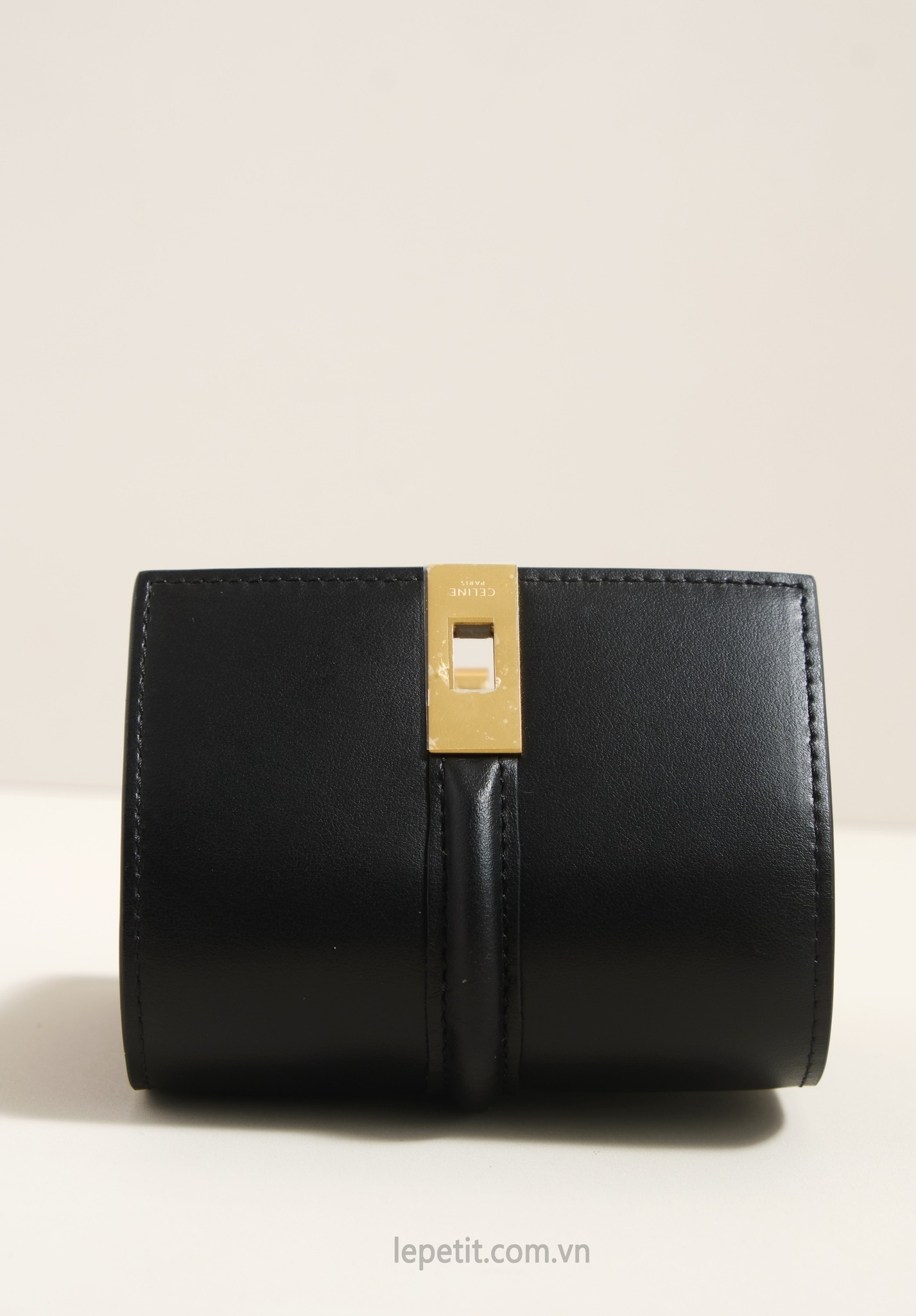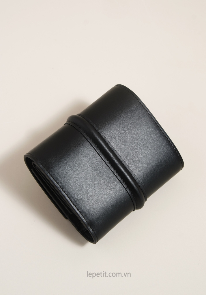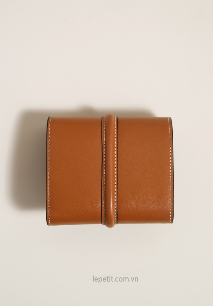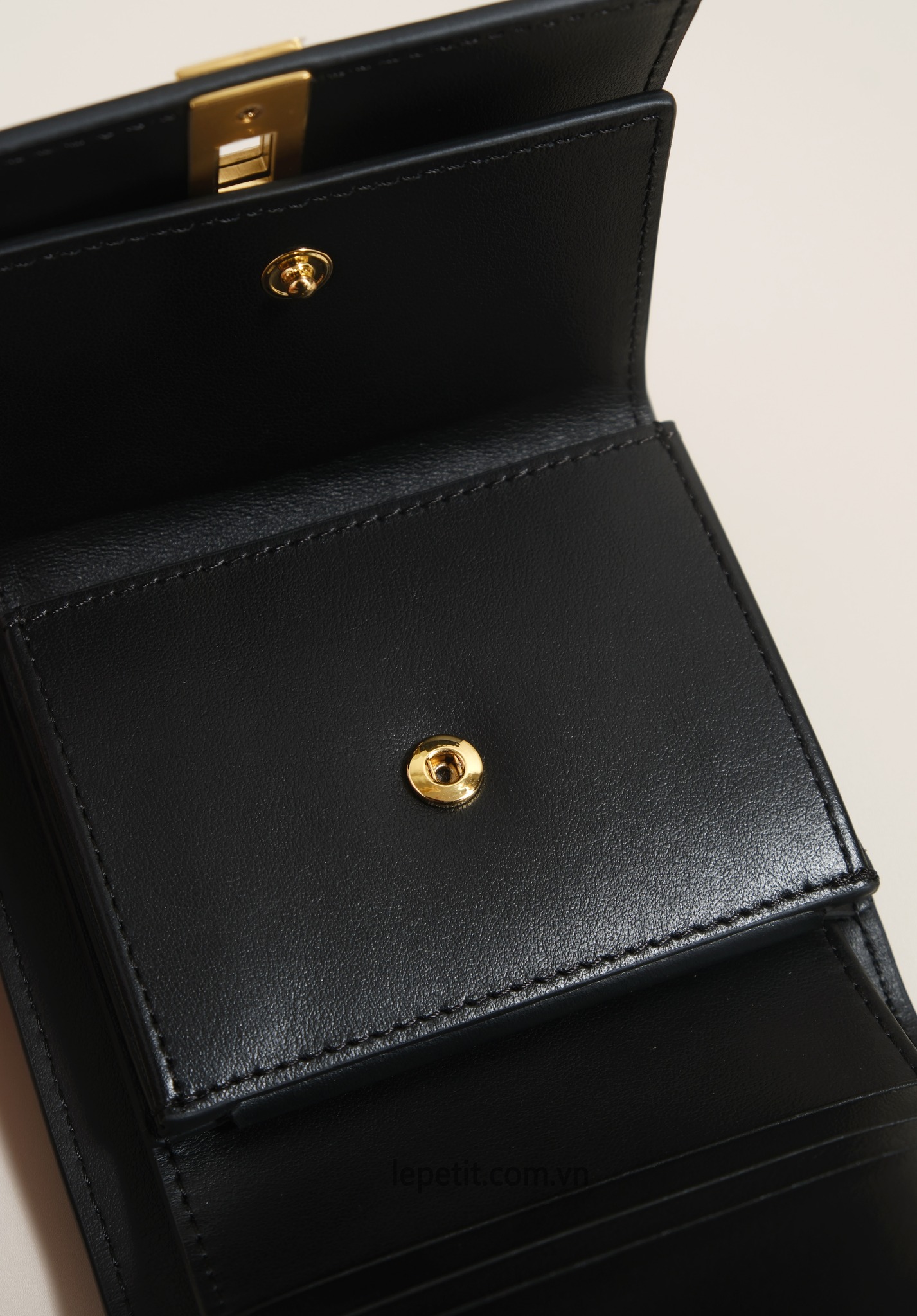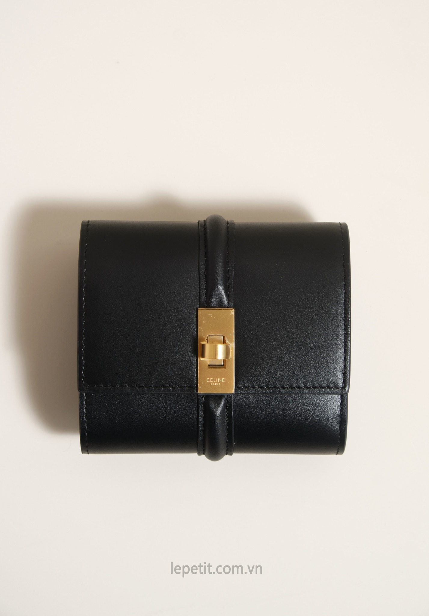 Ví gập ba, khóa bấm. Thiết kế tối giản, thanh lịch với chất liệu da trơn và khóa màu gold lấy cảm hứng từ dòng túi 16 signature của CL.