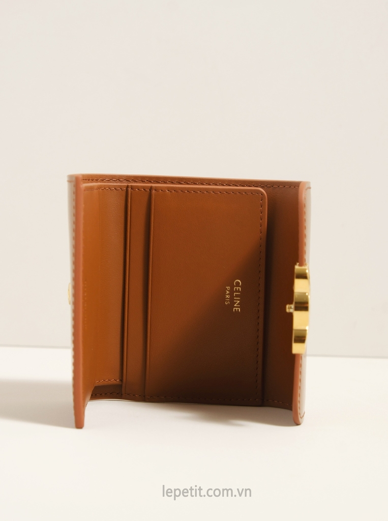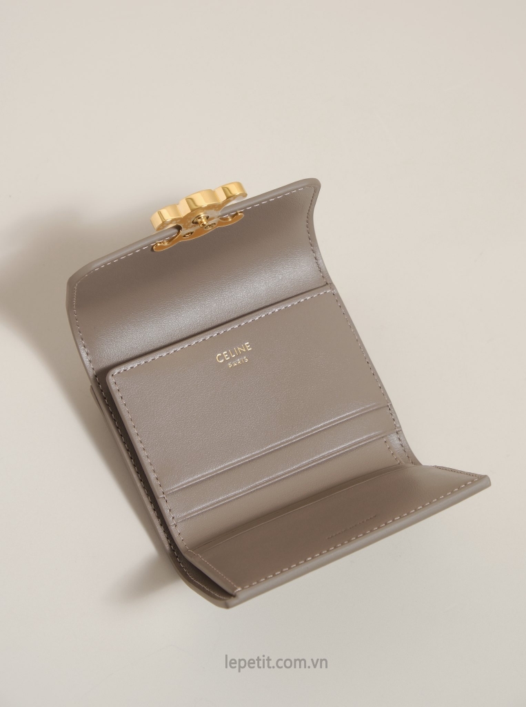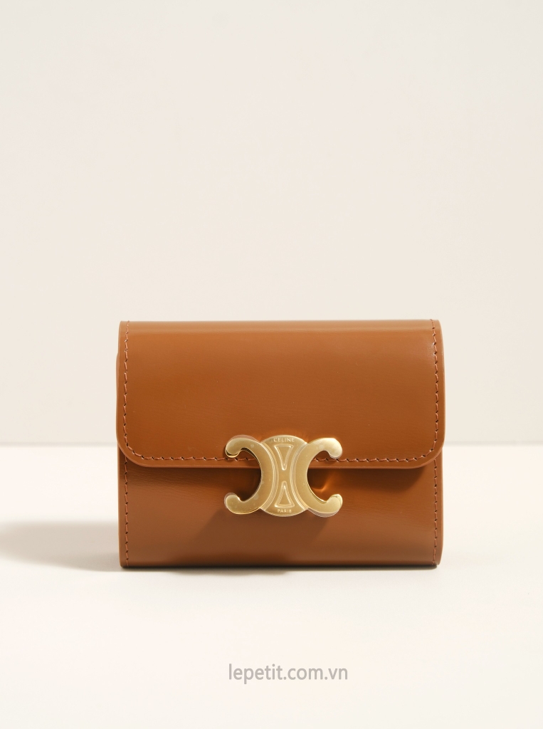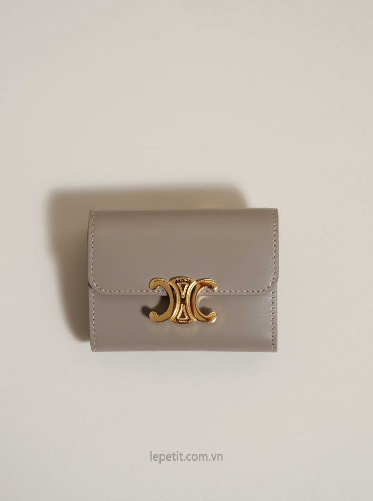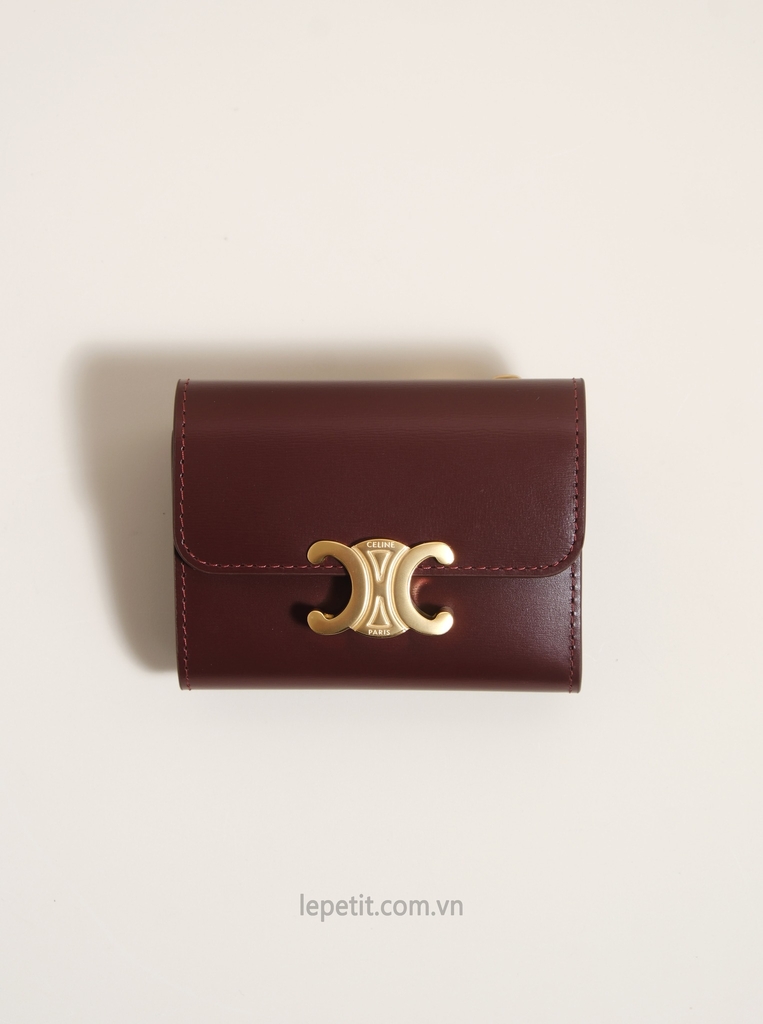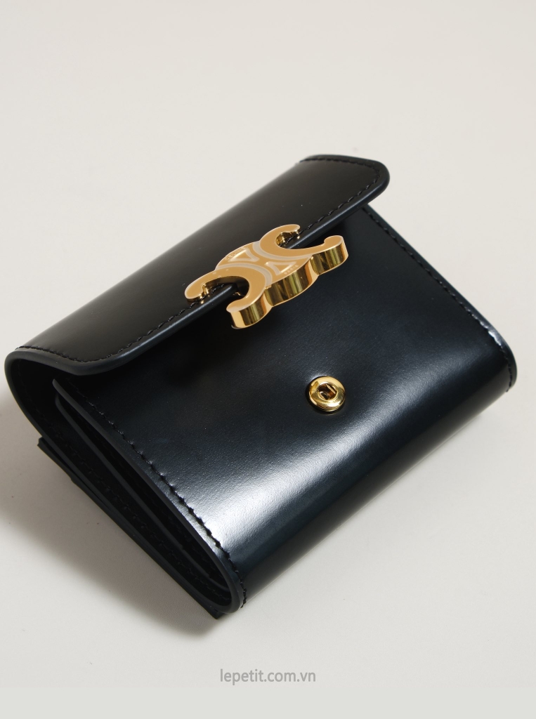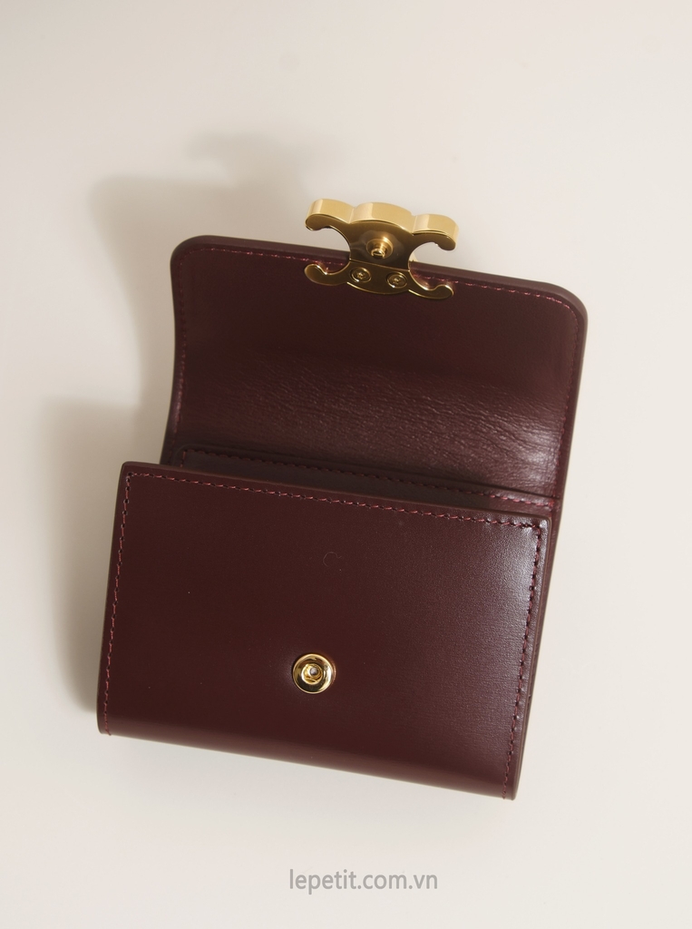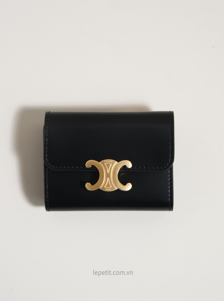 Ví gập ba, khóa bấm. Thiết kế tối giản, thanh lịch với chất liệu da trơn. Mặt trước đính logo Triomphe kim loại màu gold là signature của CL tạo điểm nhấn sang trọng.