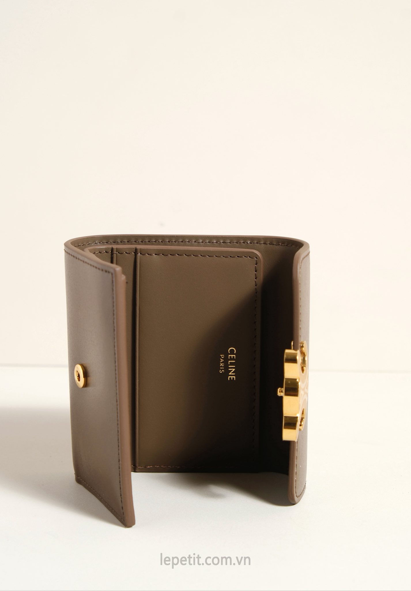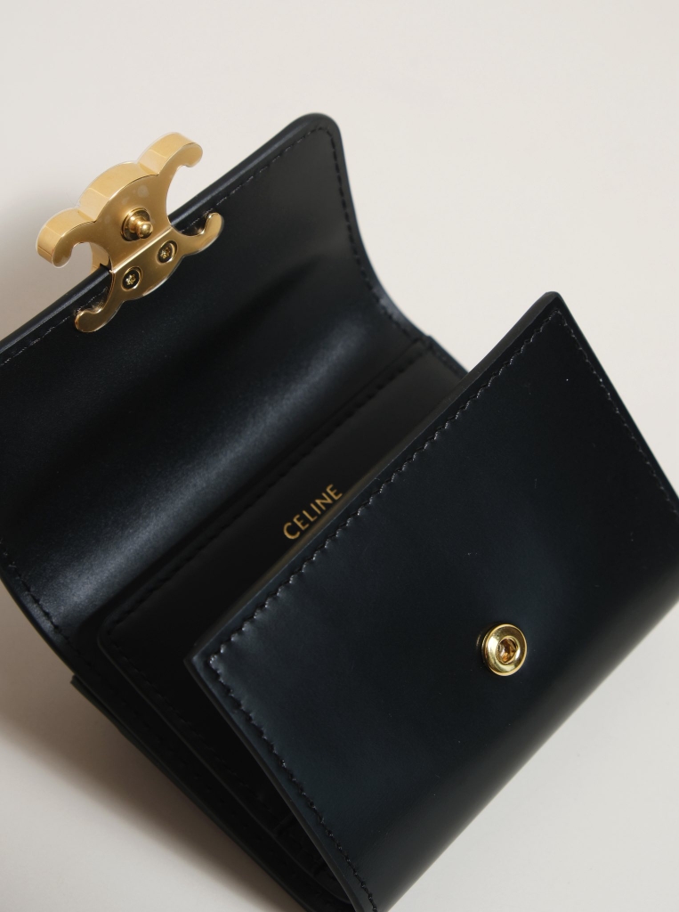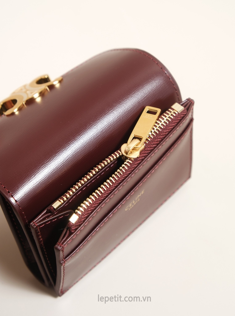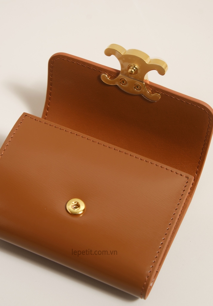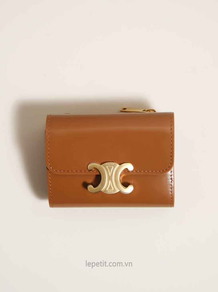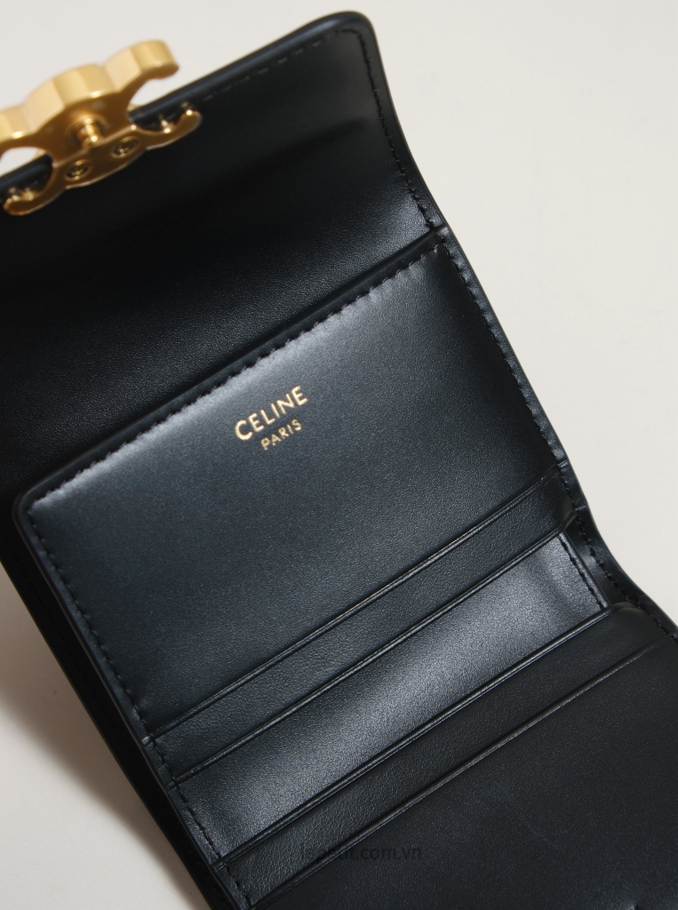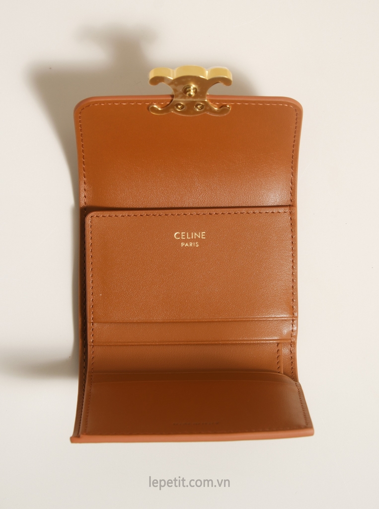 Ví gập ba, khóa bấm. Thiết kế tối giản, thanh lịch với chất liệu da trơn. Mặt trước đính logo Triomphe kim loại màu gold là signature của CL tạo điểm nhấn sang trọng.