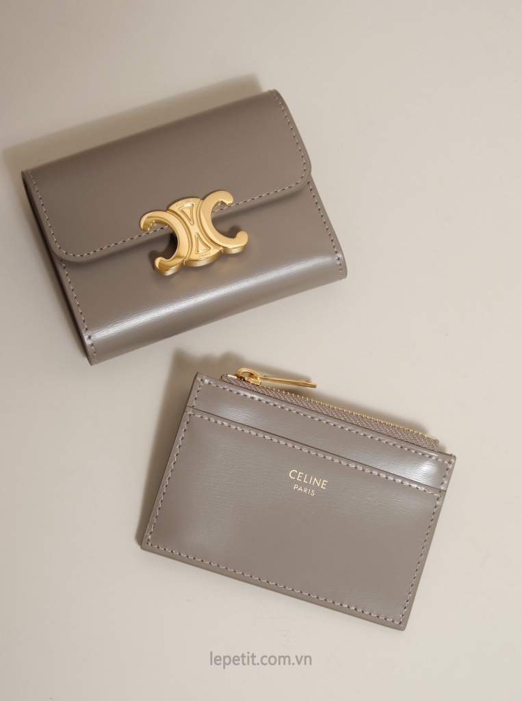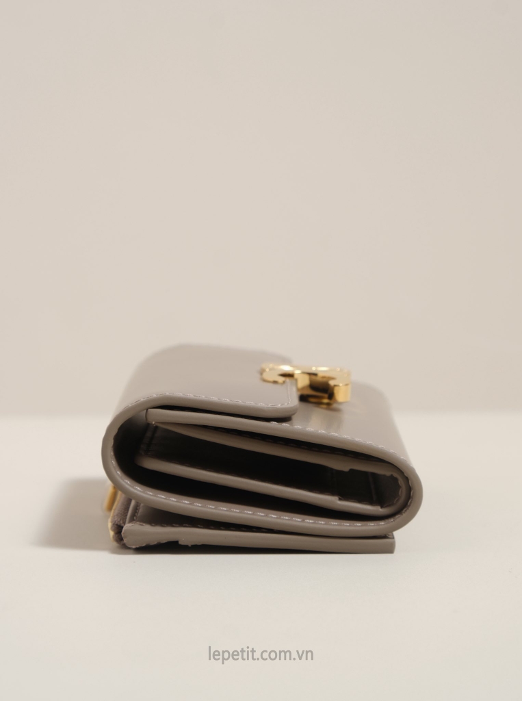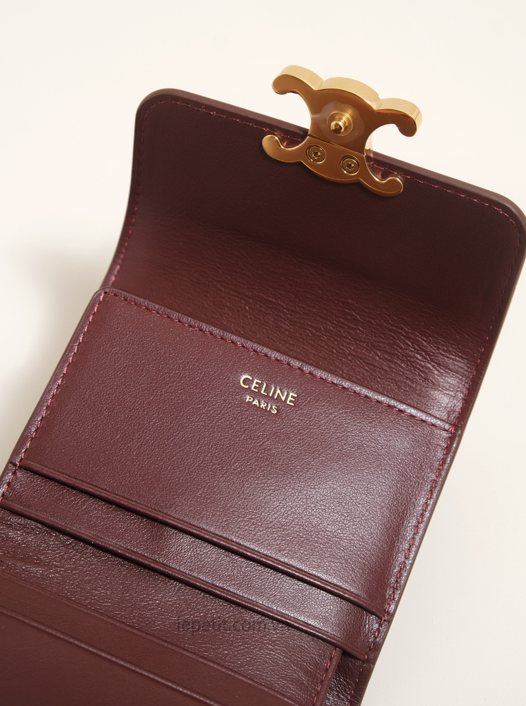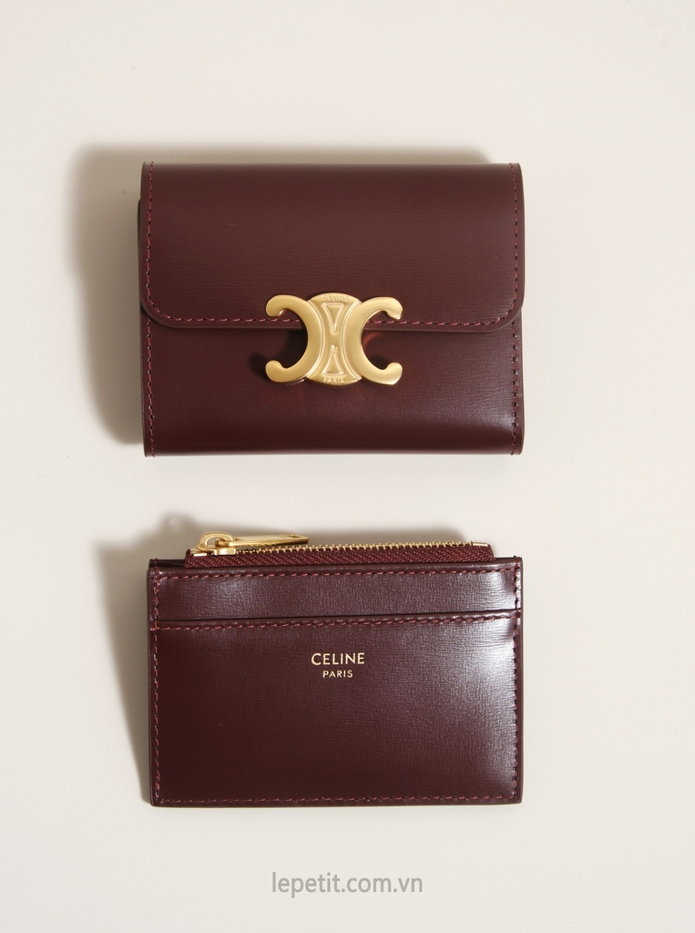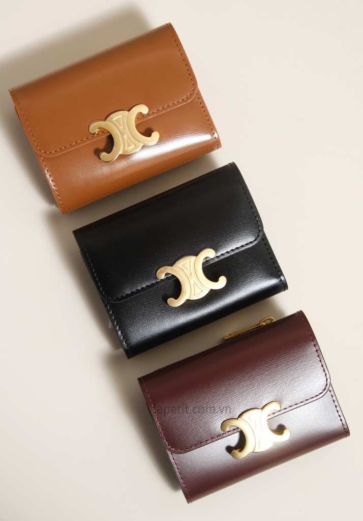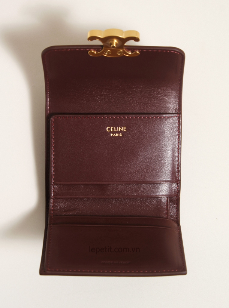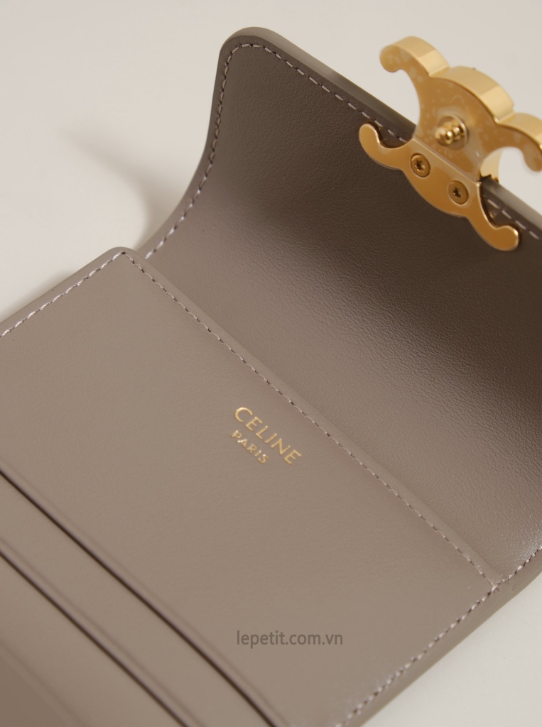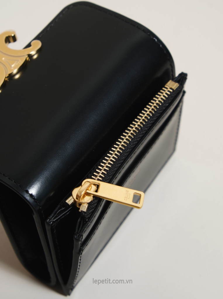 Ví gập ba, khóa bấm. Thiết kế tối giản, thanh lịch với chất liệu da trơn. Mặt trước đính logo Triomphe kim loại màu gold là signature của CL tạo điểm nhấn sang trọng.