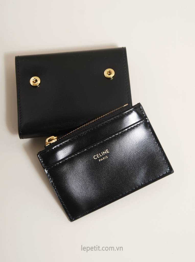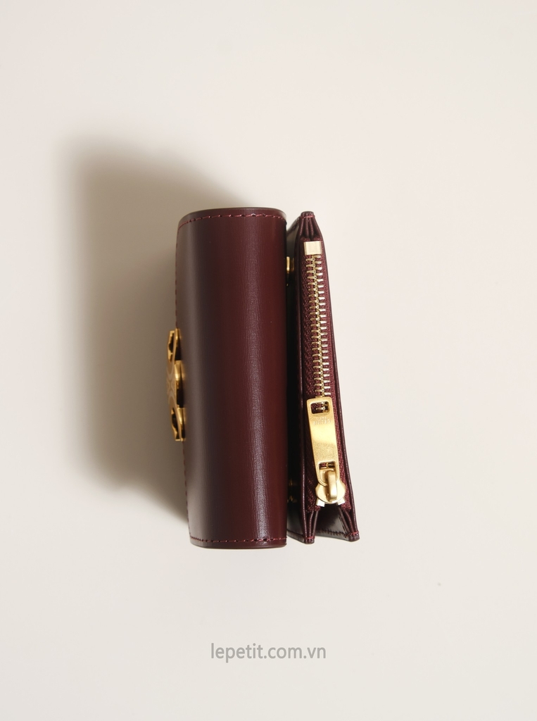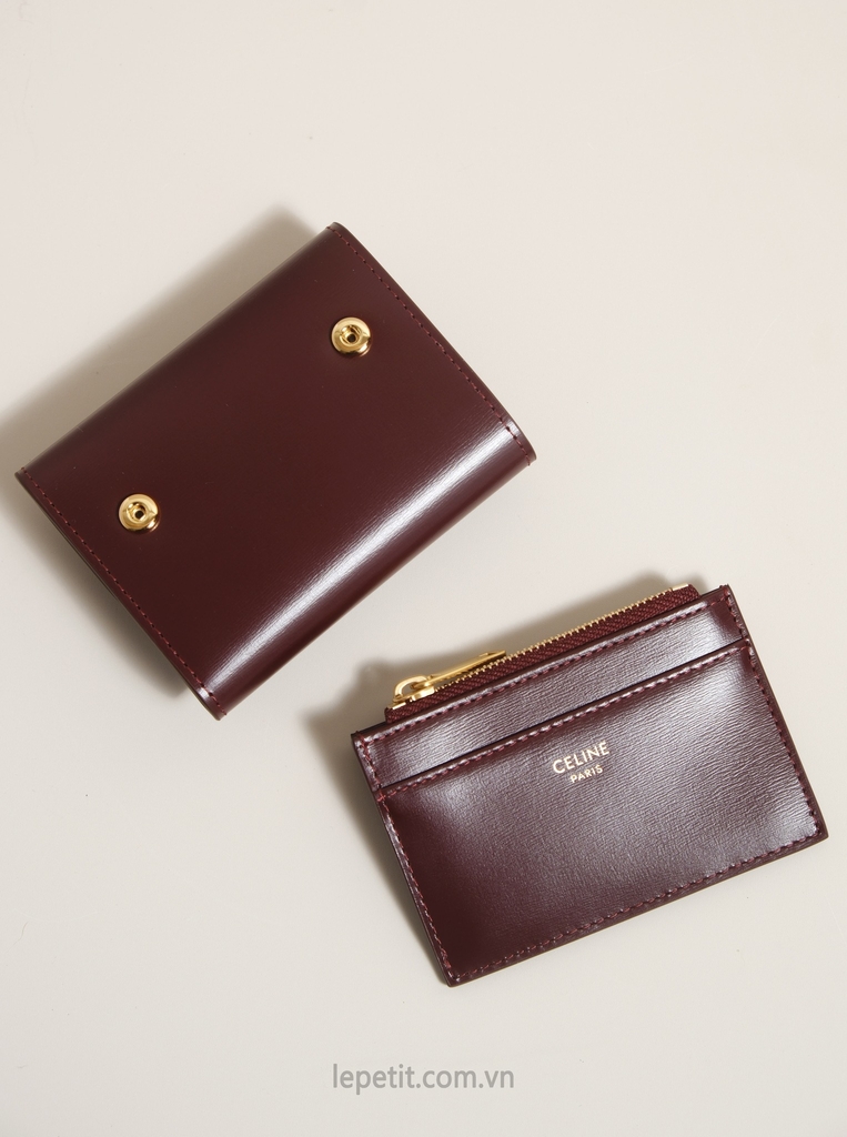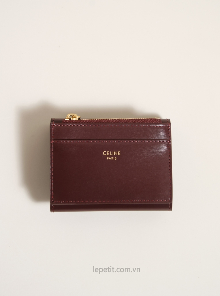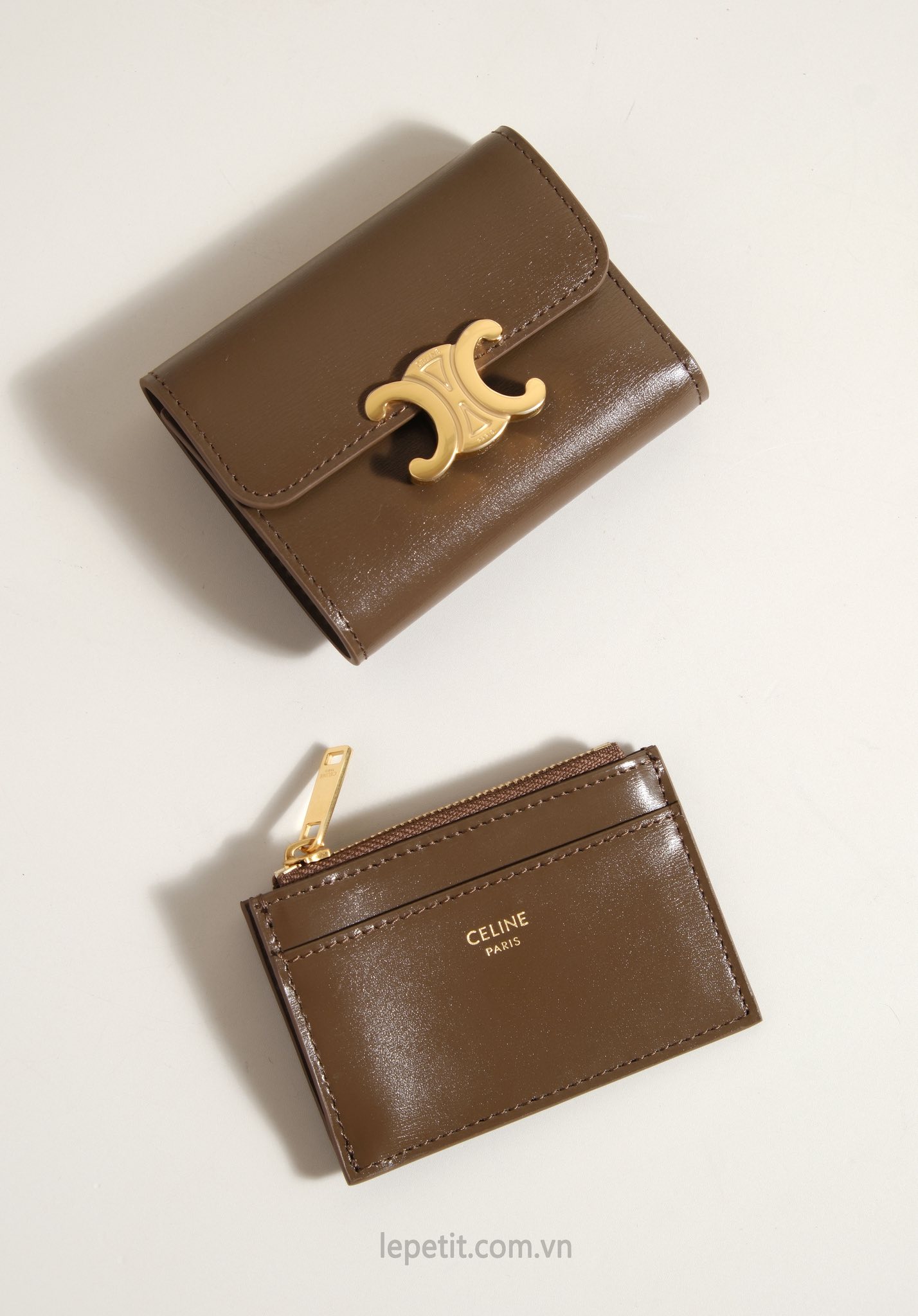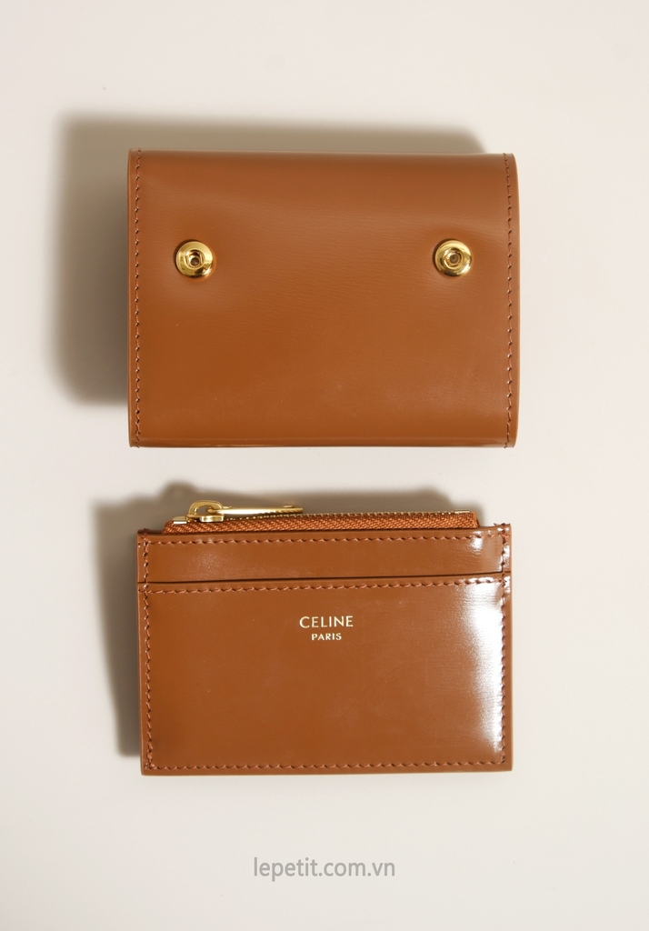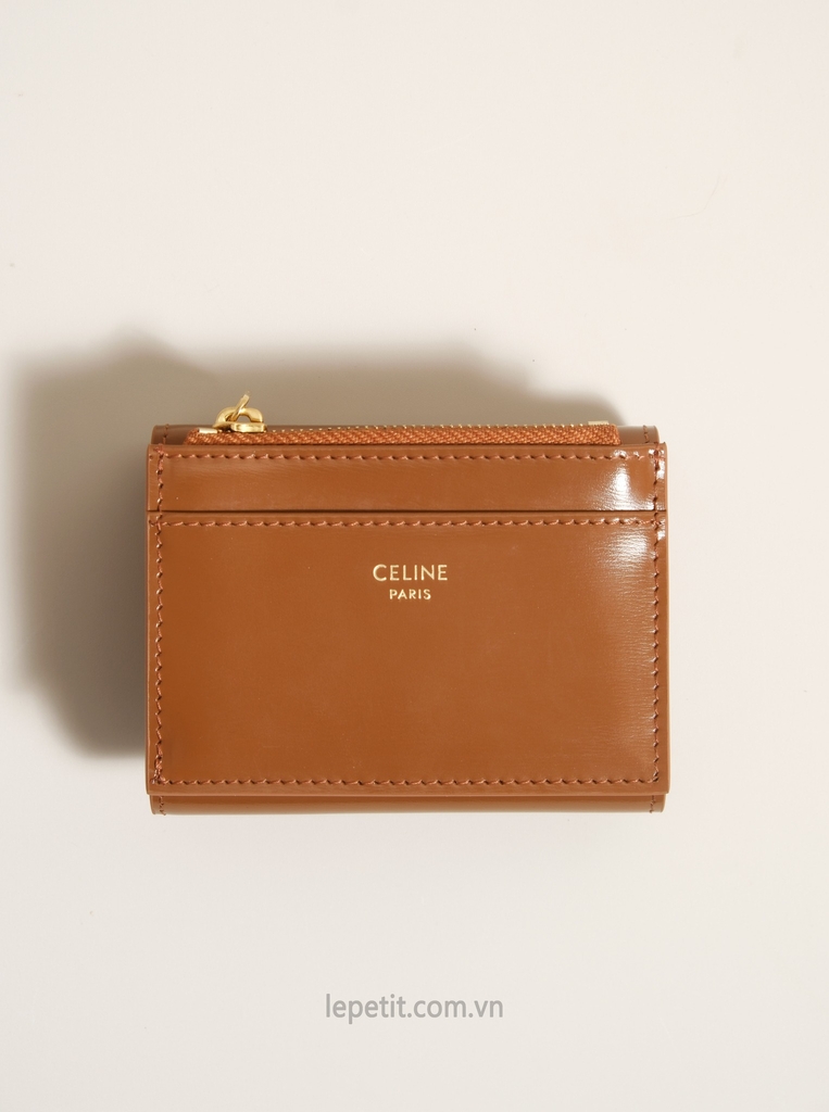 Ví gập ba, khóa bấm. Thiết kế tối giản, thanh lịch với chất liệu da trơn. Mặt trước đính logo Triomphe kim loại màu gold là signature của CL tạo điểm nhấn sang trọng.