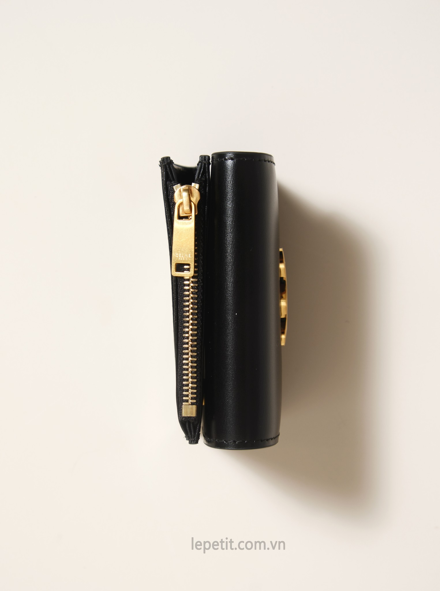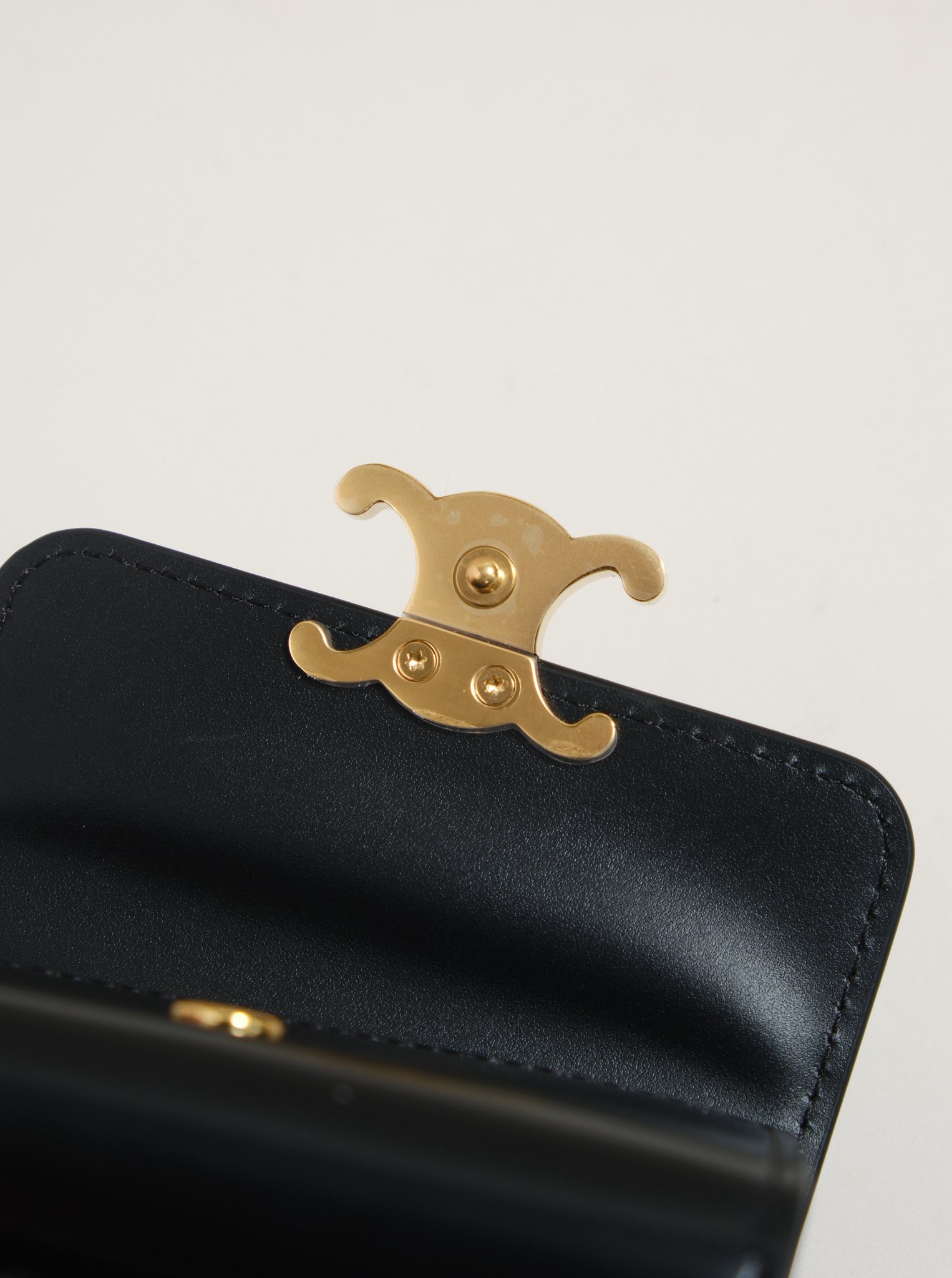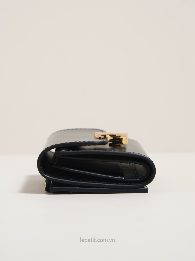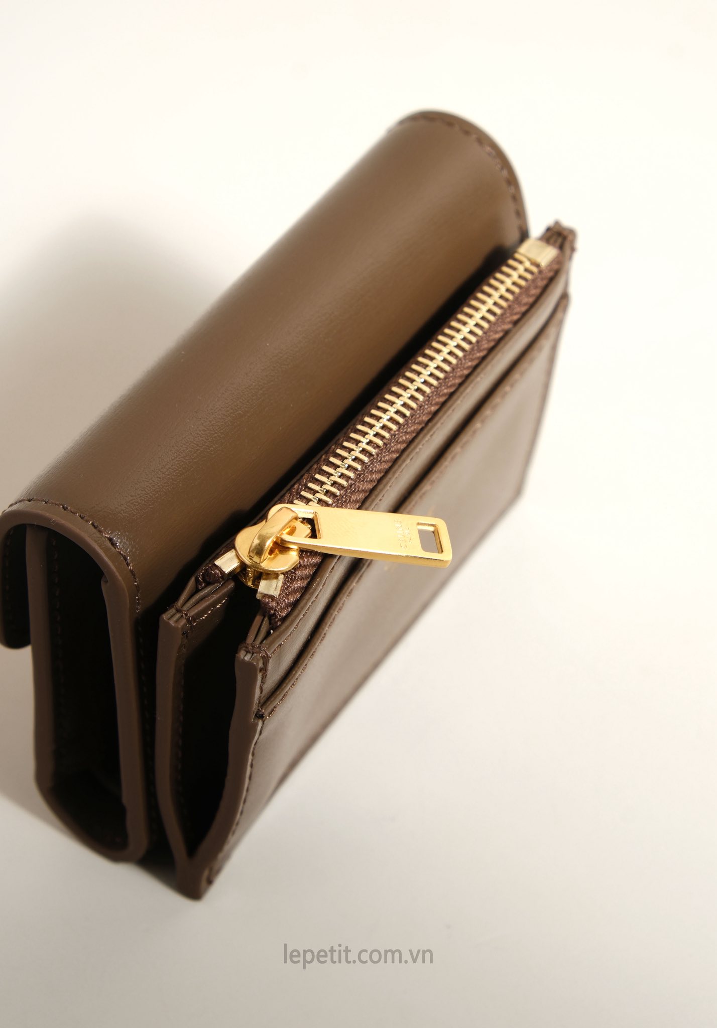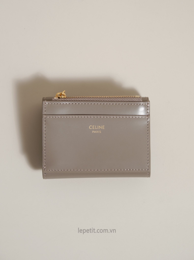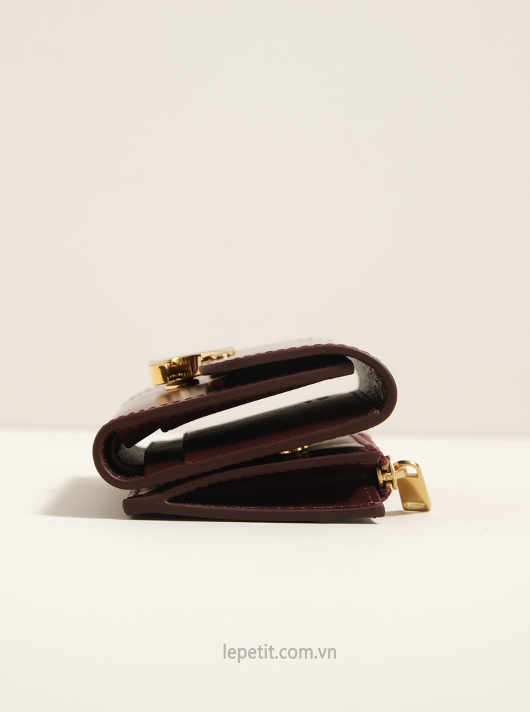 Ví gập ba, khóa bấm. Thiết kế tối giản, thanh lịch với chất liệu da trơn. Mặt trước đính logo Triomphe kim loại màu gold là signature của CL tạo điểm nhấn sang trọng.