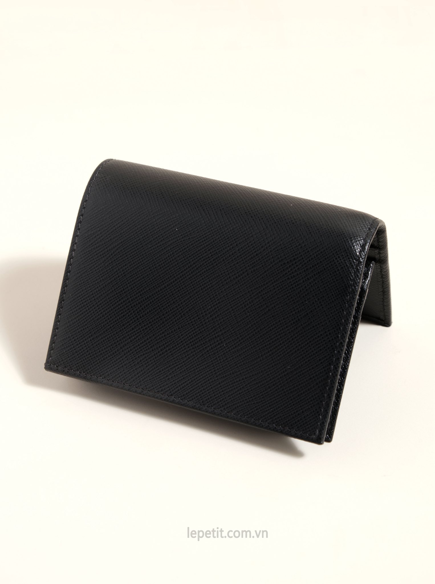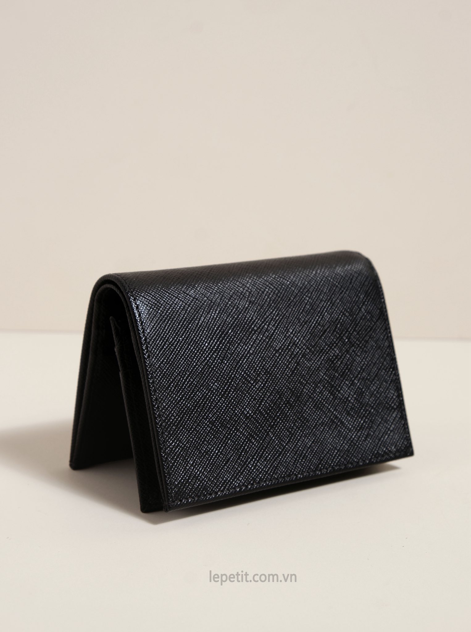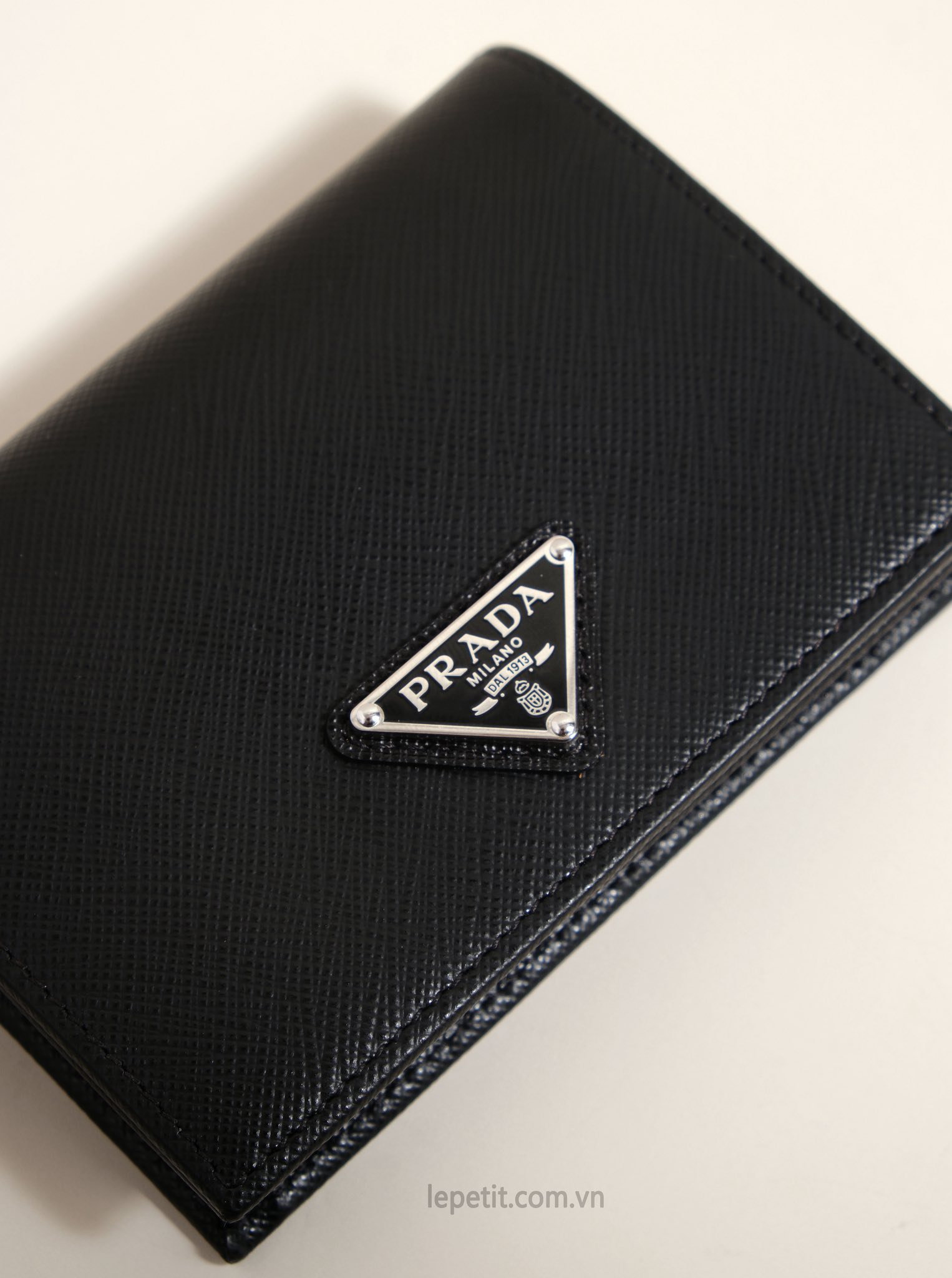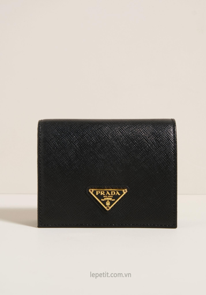Ví gập đôi được làm bằng da bê dập vân Saffiano đặc trưng của PD giúp hạn chế trầy xước. Mặt trước đính logo kim loại tráng men PD.