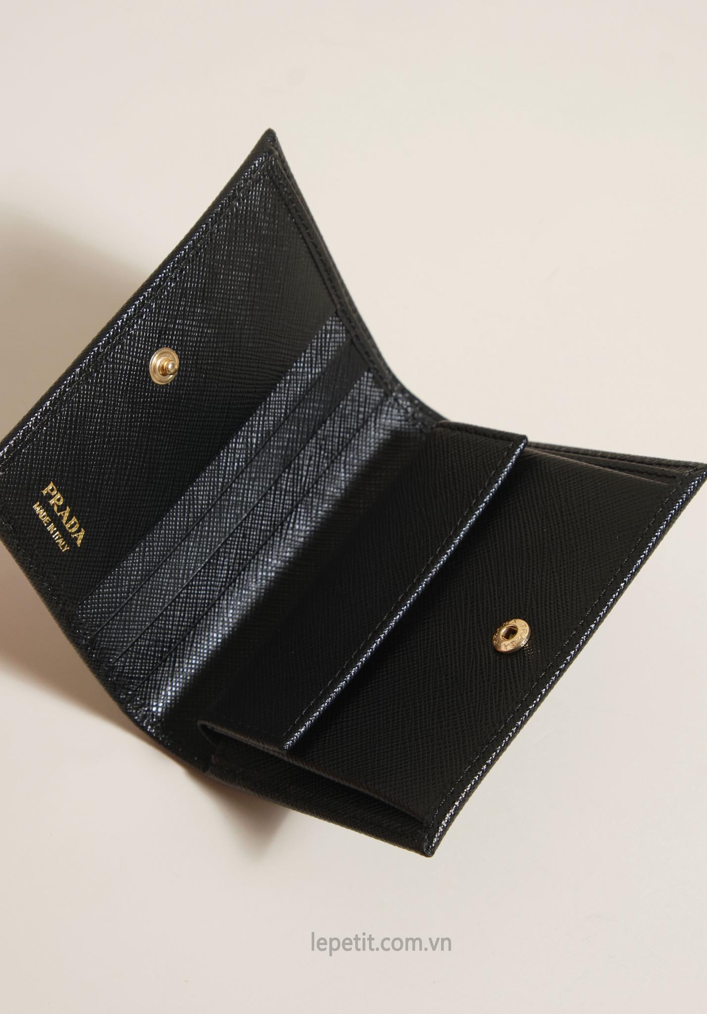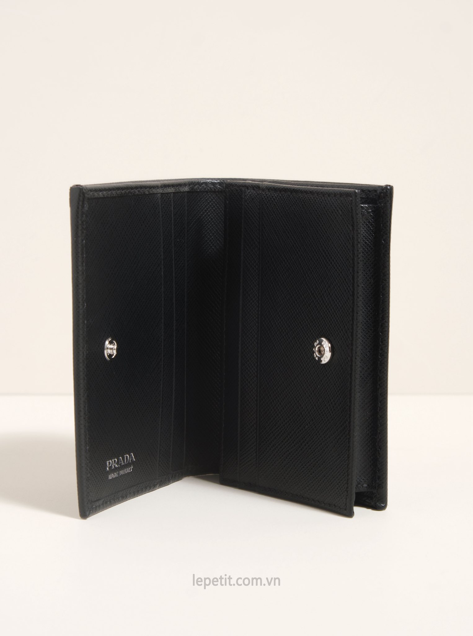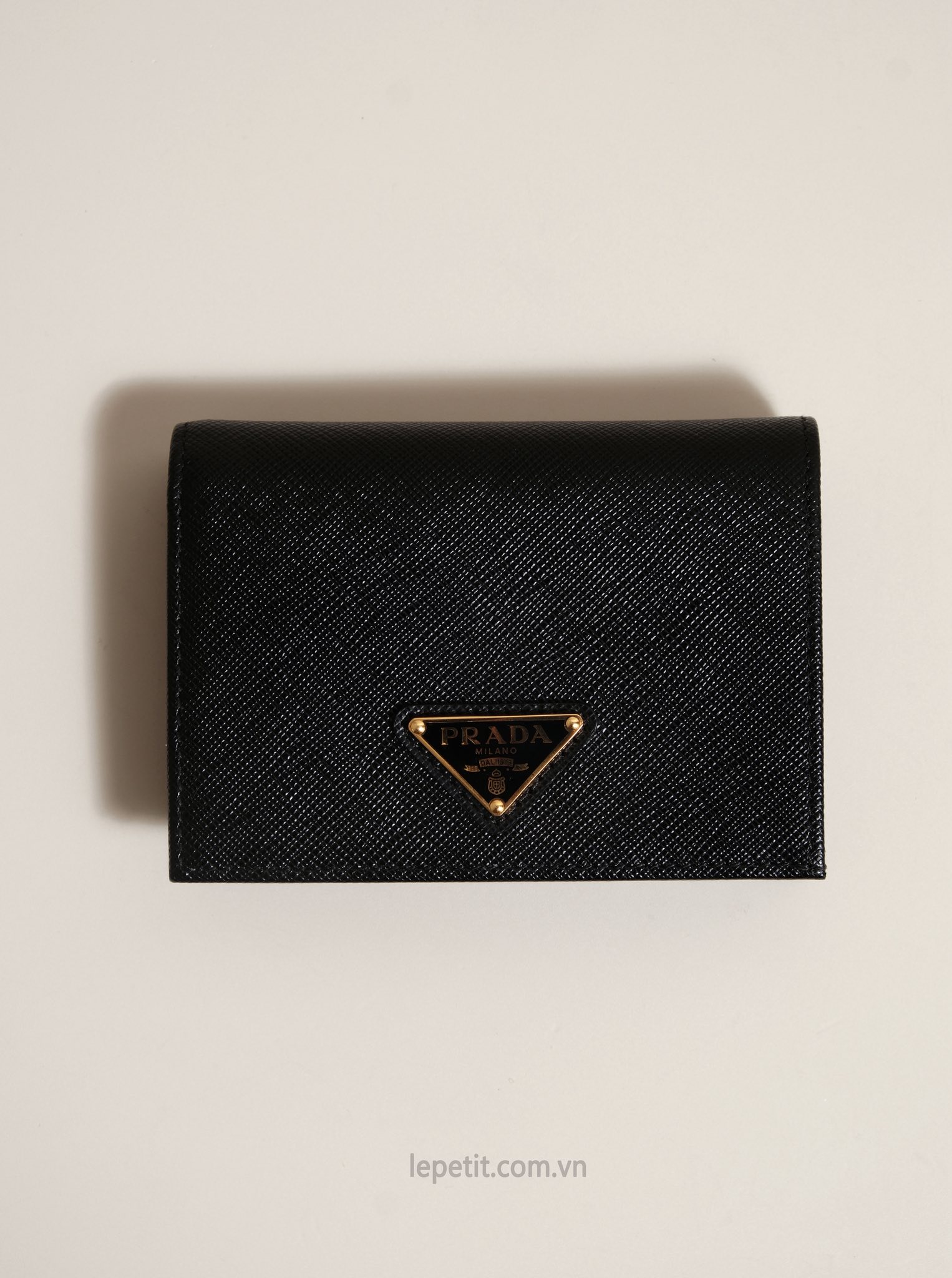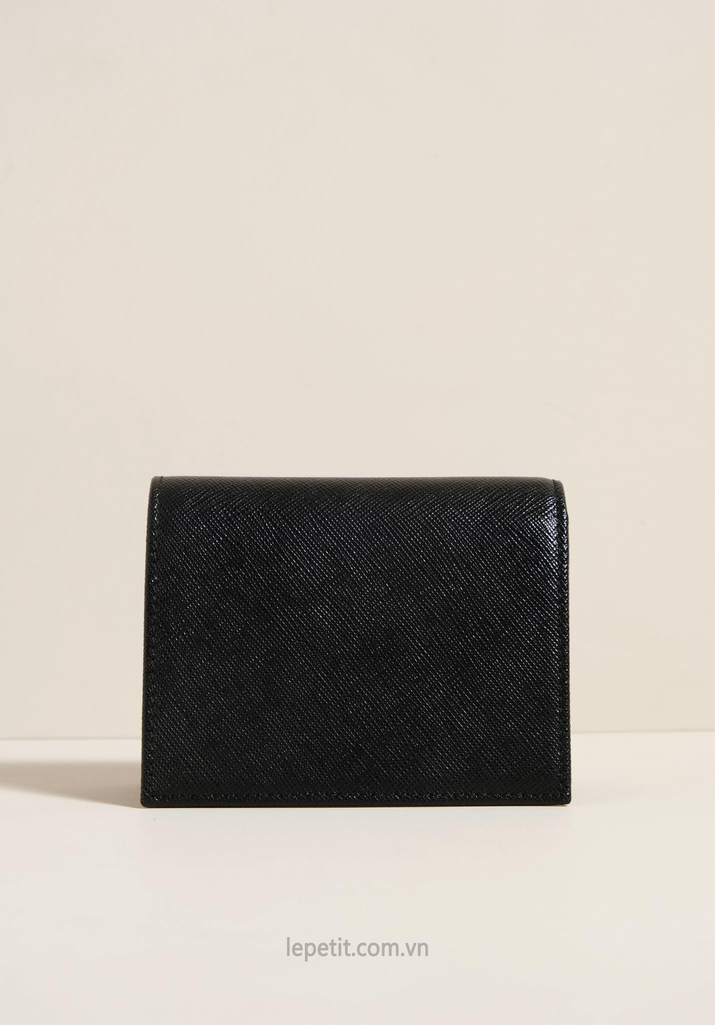Ví gập đôi được làm bằng da bê dập vân Saffiano đặc trưng của PD giúp hạn chế trầy xước. Mặt trước đính logo kim loại tráng men PD.