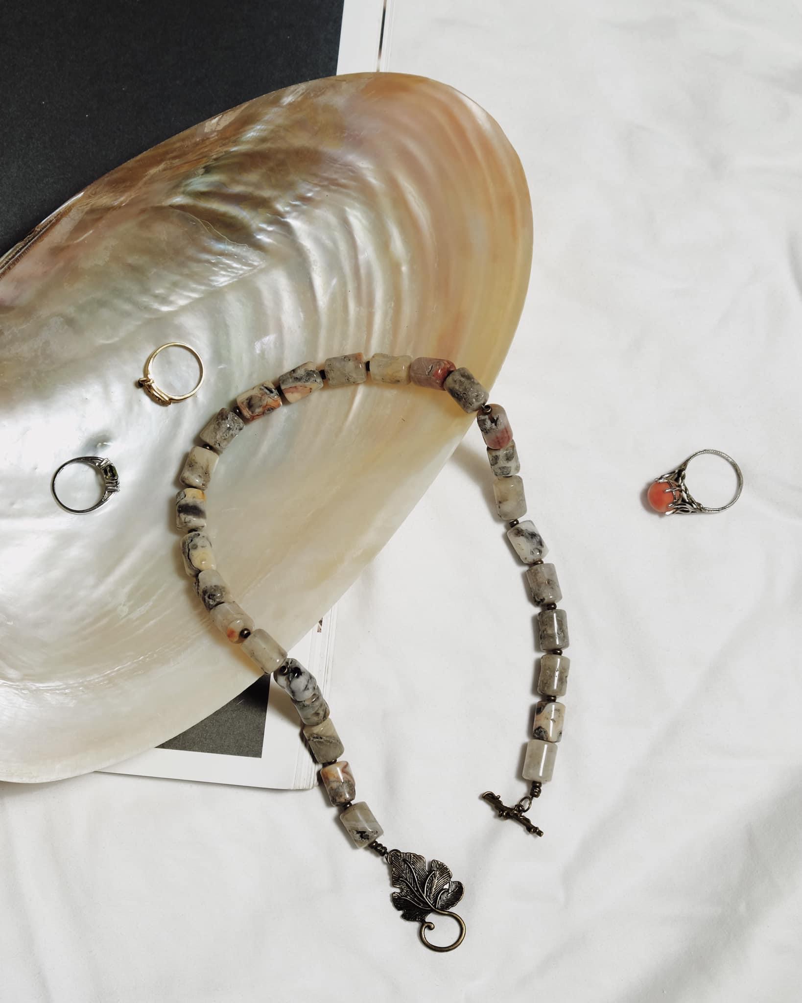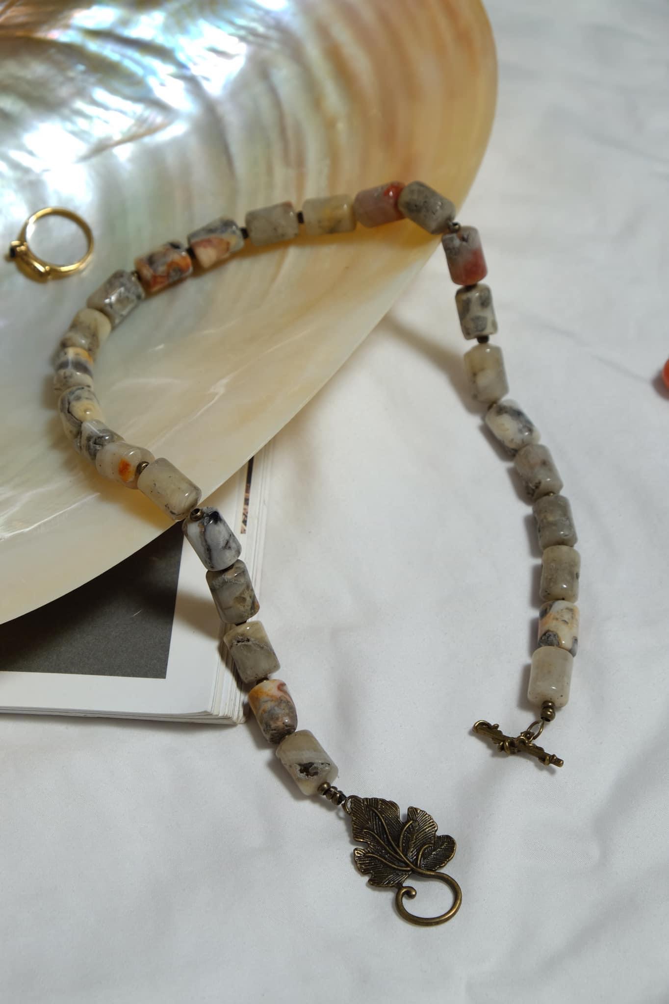 Vòng cổ đá tự nhiên, hạt lăng trụ màu xám sữa vân cam cháy, khoá cài kim loại hình lá vintage.
